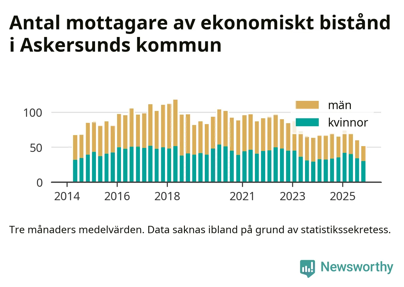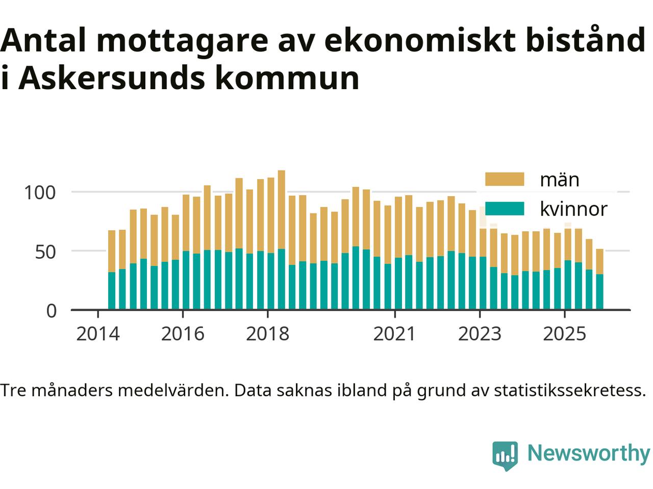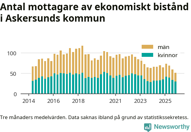 I genomsnitt 51 personer per månad fick ekonomiskt bistånd i Askersunds kommun under höstmånaderna (september till november), vilket motsvarar 0,4 procent av den vuxna befolkningen. Det är marginellt mindre än i somras, och något mindre andel än under hösten för ett år sedan.