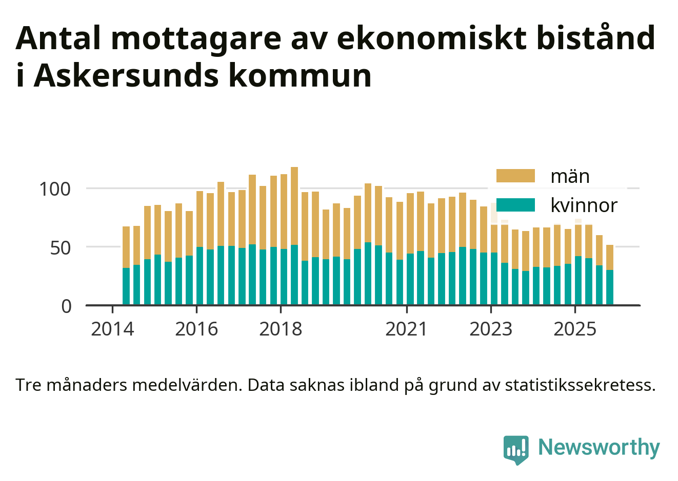 En majoritet av biståndstagarna var kvinnor: I genomsnitt 21 män och 30 kvinnor fick ekonomiskt bistånd varje månad under hösten.