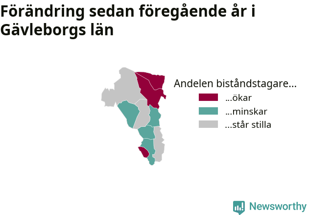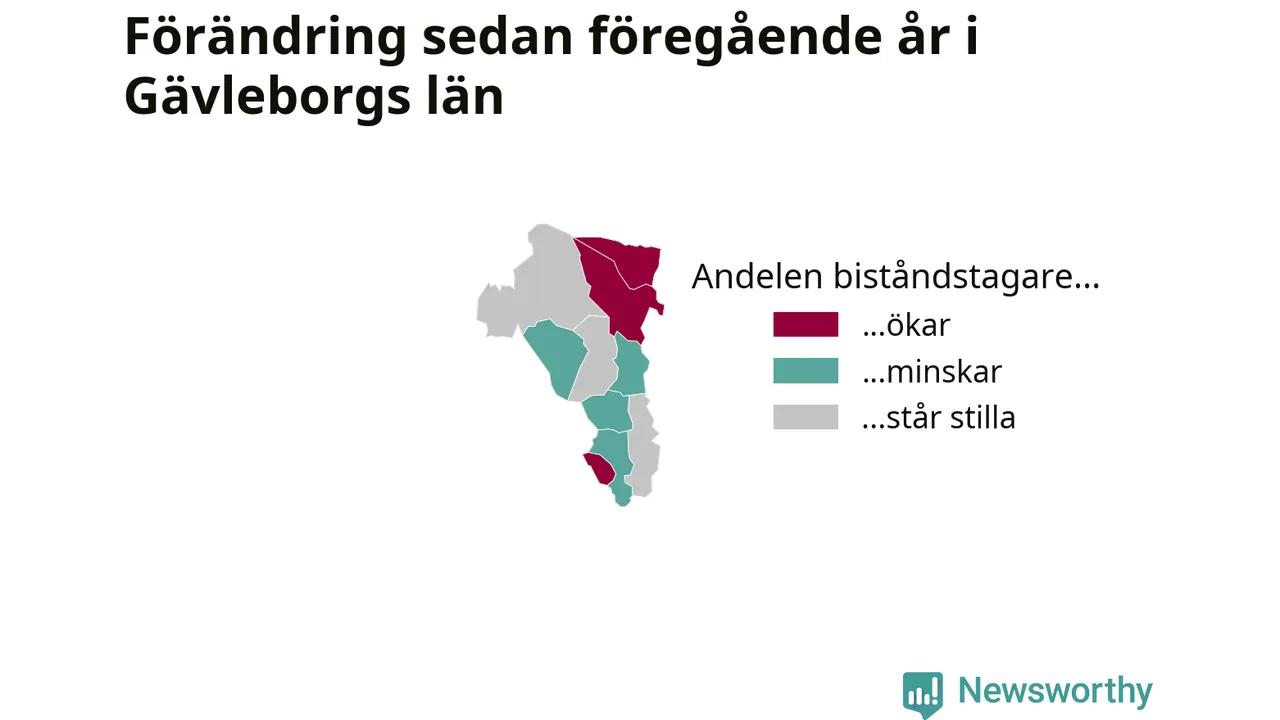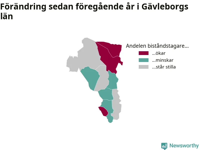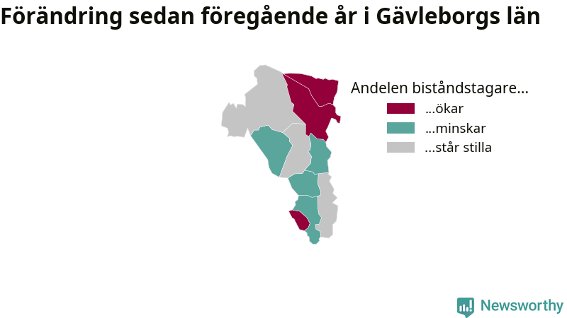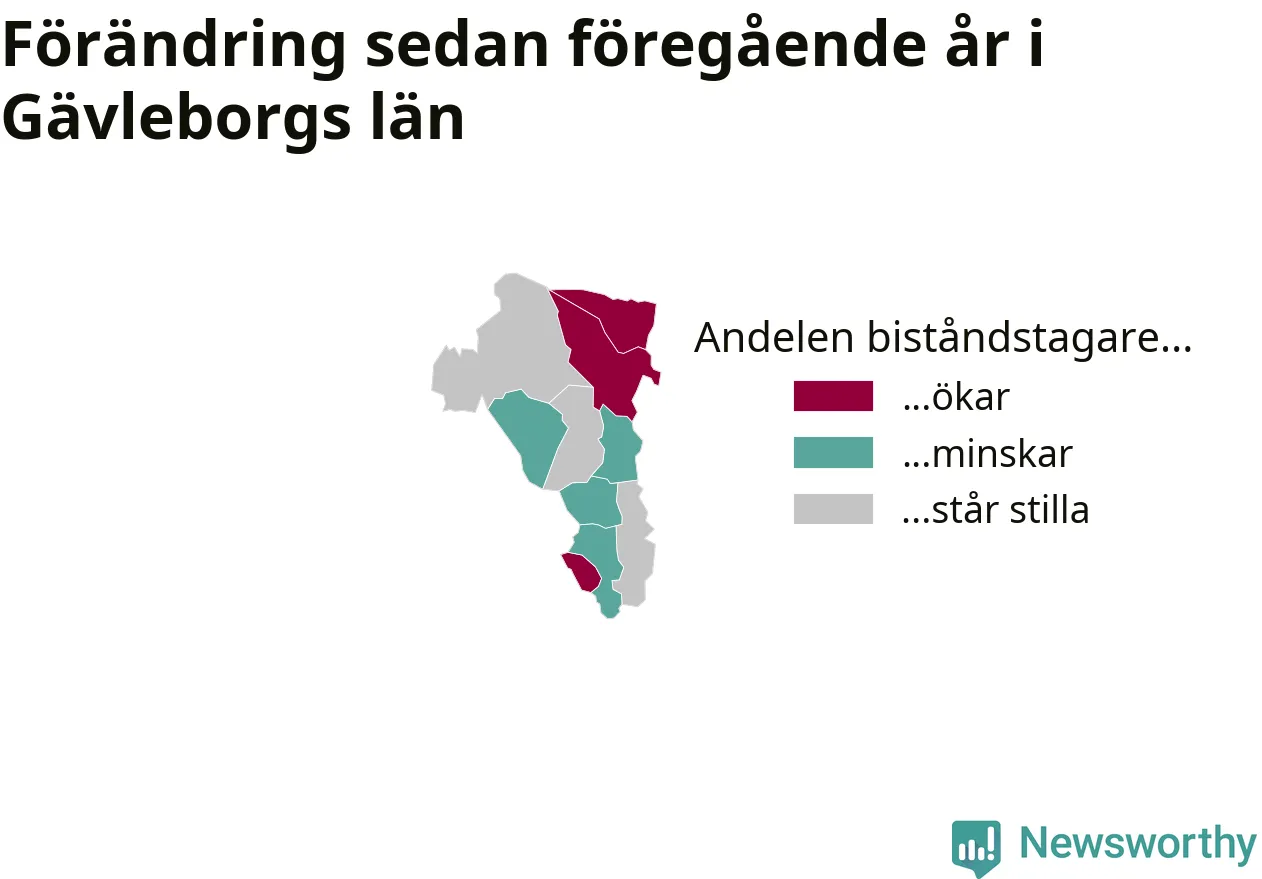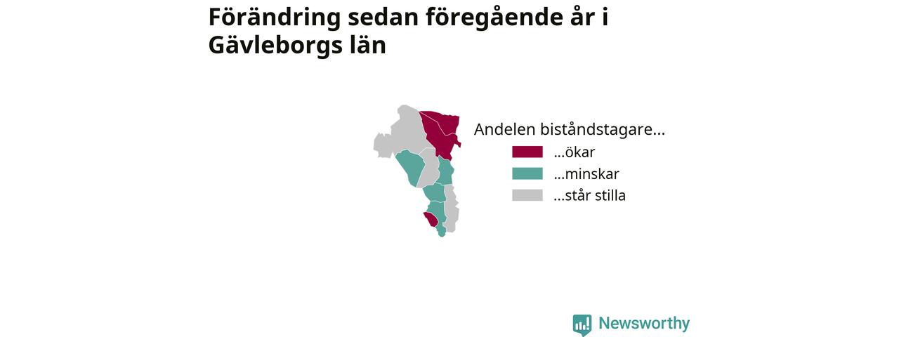 Högst andel biståndstagare bland kommunerna i Gävleborg hade Söderhamn (2,2 procent), och minst andel Ljusdal (0,6 procent). Andelen minskade eller var oförändrad under hösten i samtliga kommuner utom en (Ovanåkers kommun), jämfört med i somras.