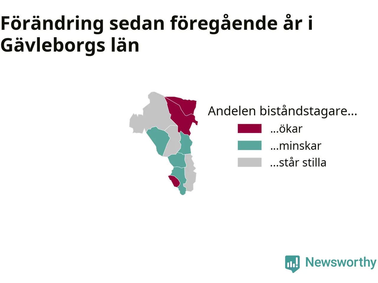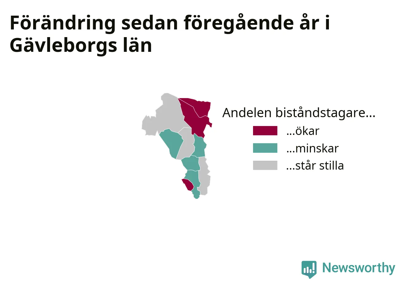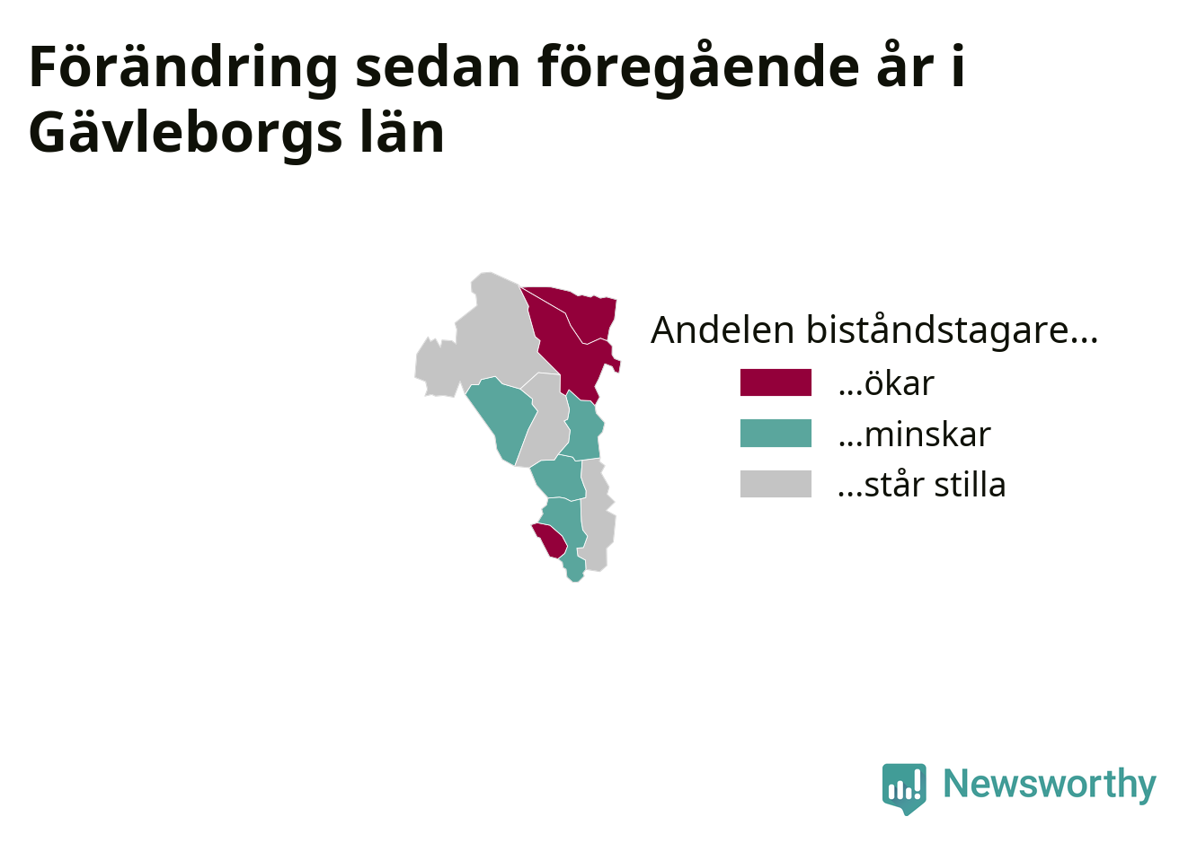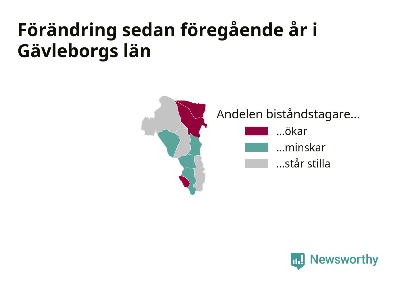 Högst andel biståndstagare bland kommunerna i Gävleborg hade Söderhamn (2,2 procent), och minst andel Ljusdal (0,6 procent). Andelen minskade eller var oförändrad under hösten i samtliga kommuner utom en (Ovanåkers kommun), jämfört med i somras.