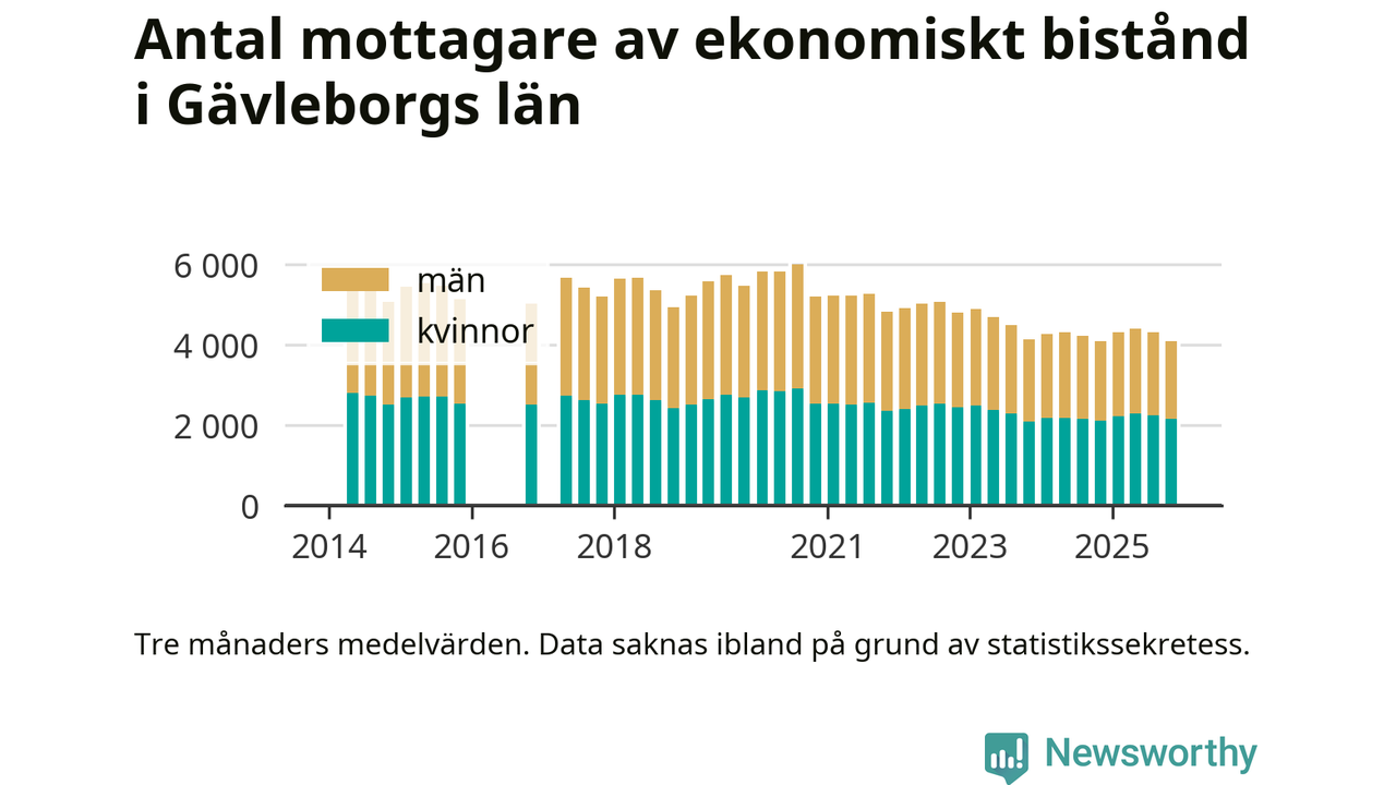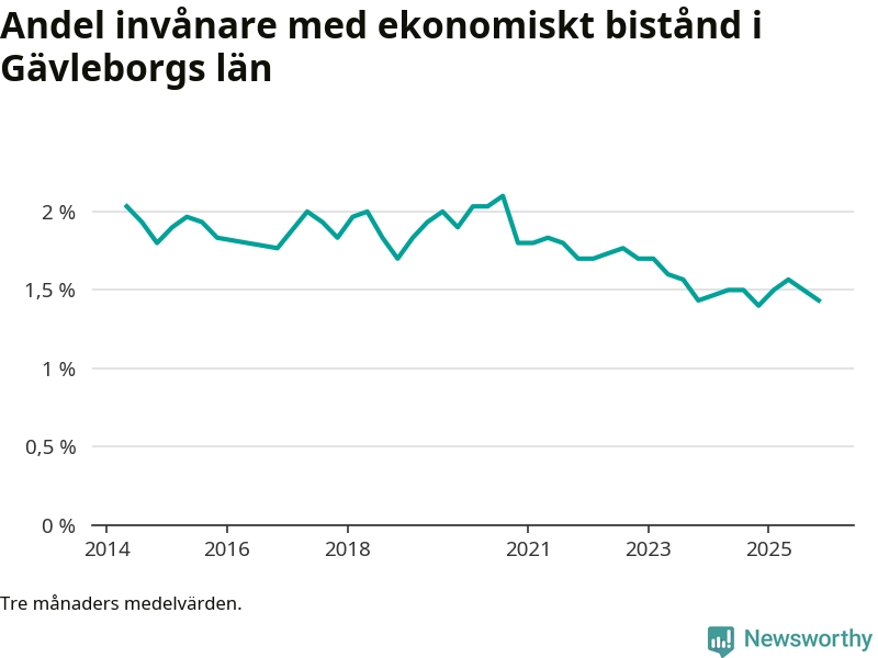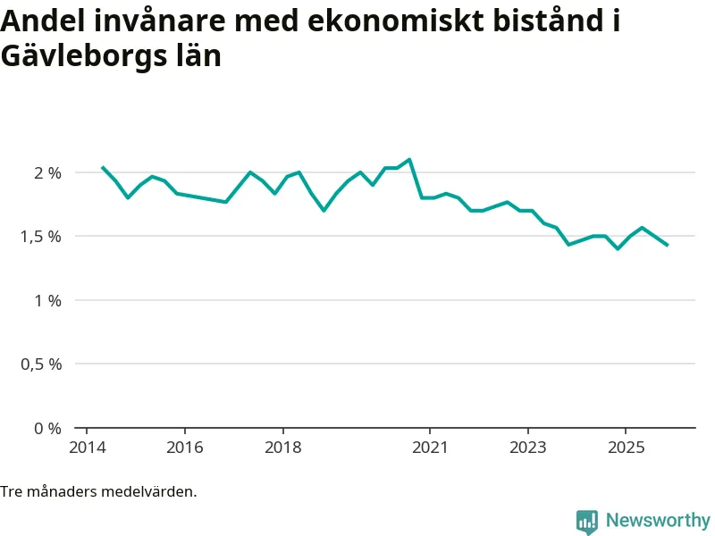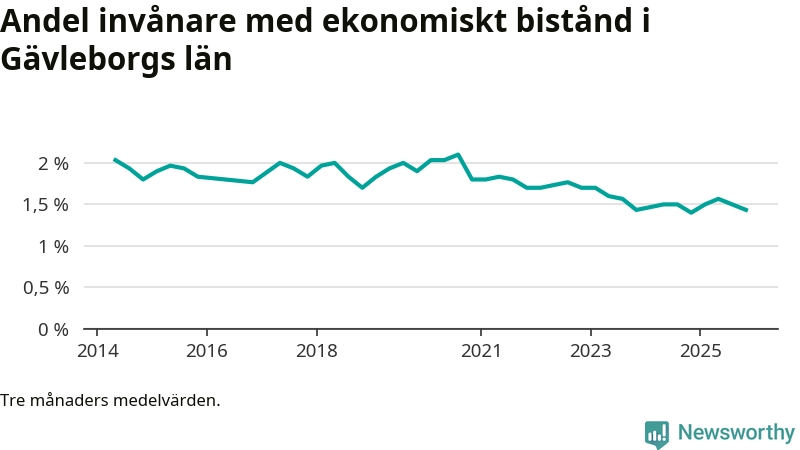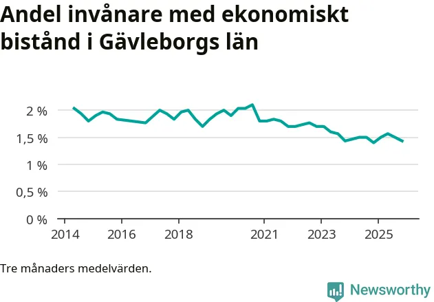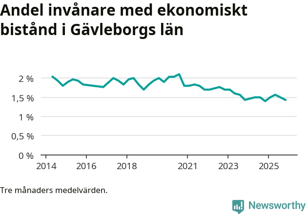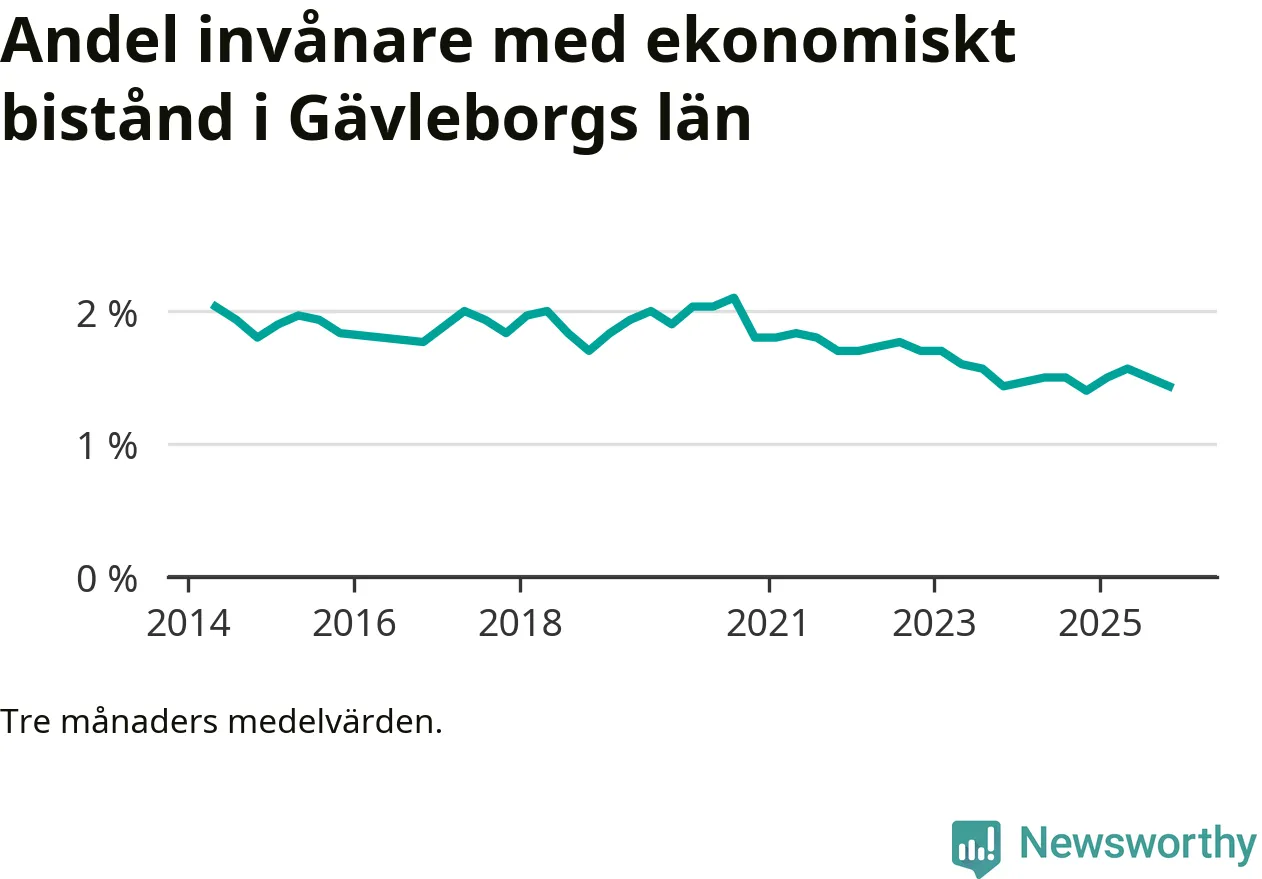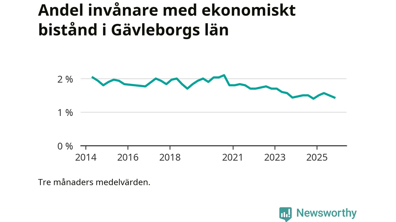 Andelen invånare med ekonomiskt bistånd i Gävleborgs län var under hösten den lägsta sedan åtminstone 2014. Det visar den senaste, preliminära statistiken från Socialstyrelsen.