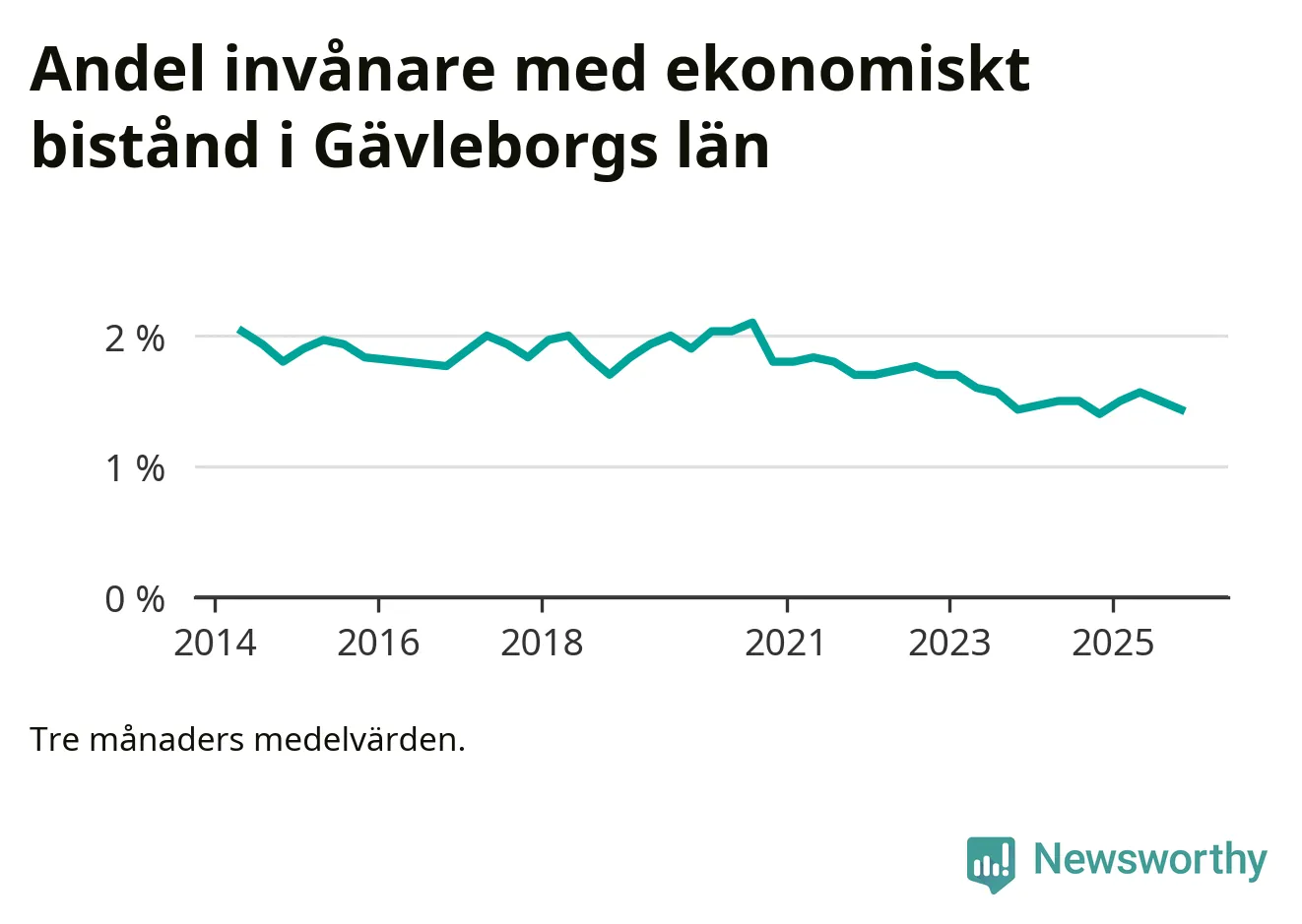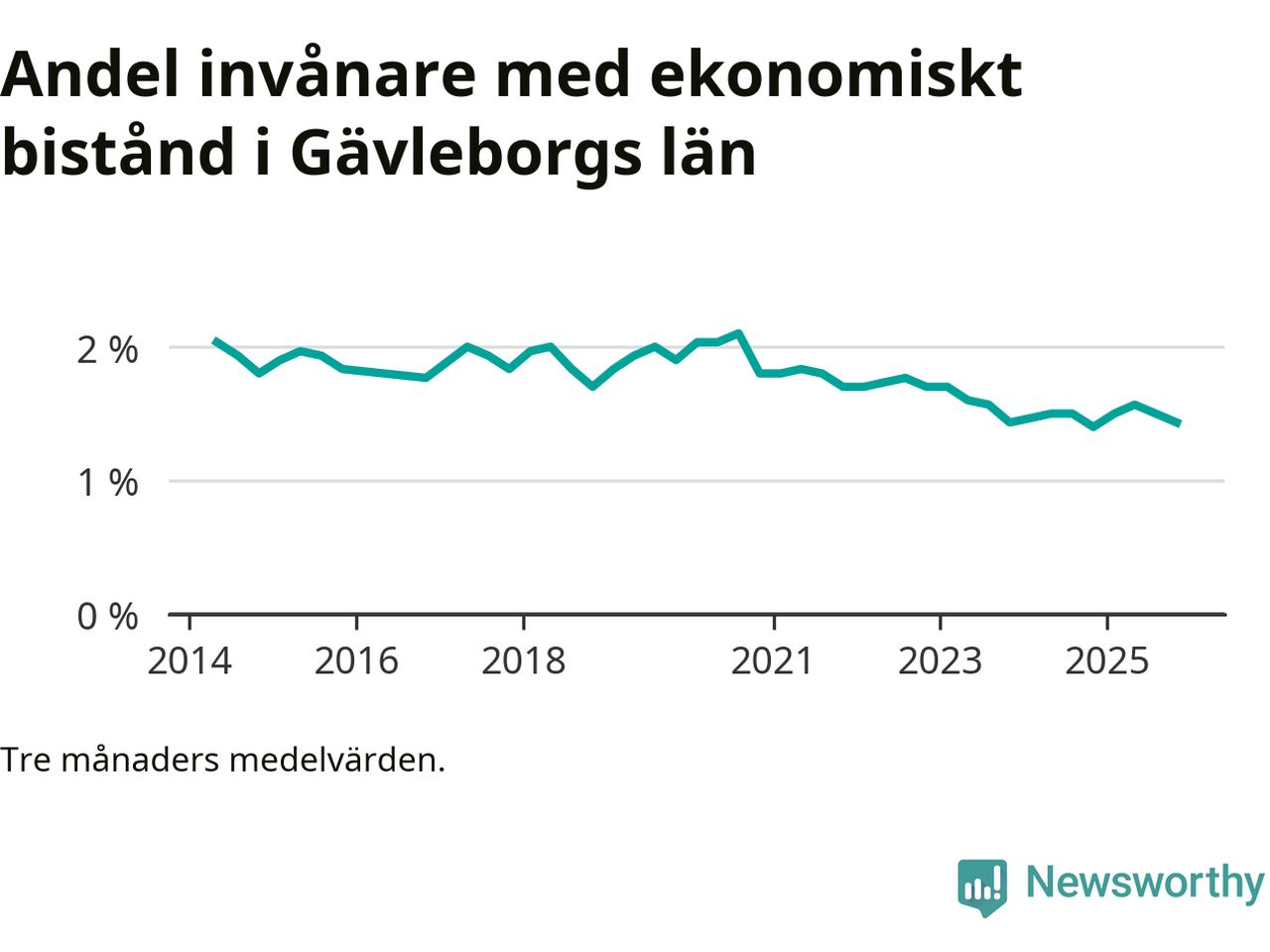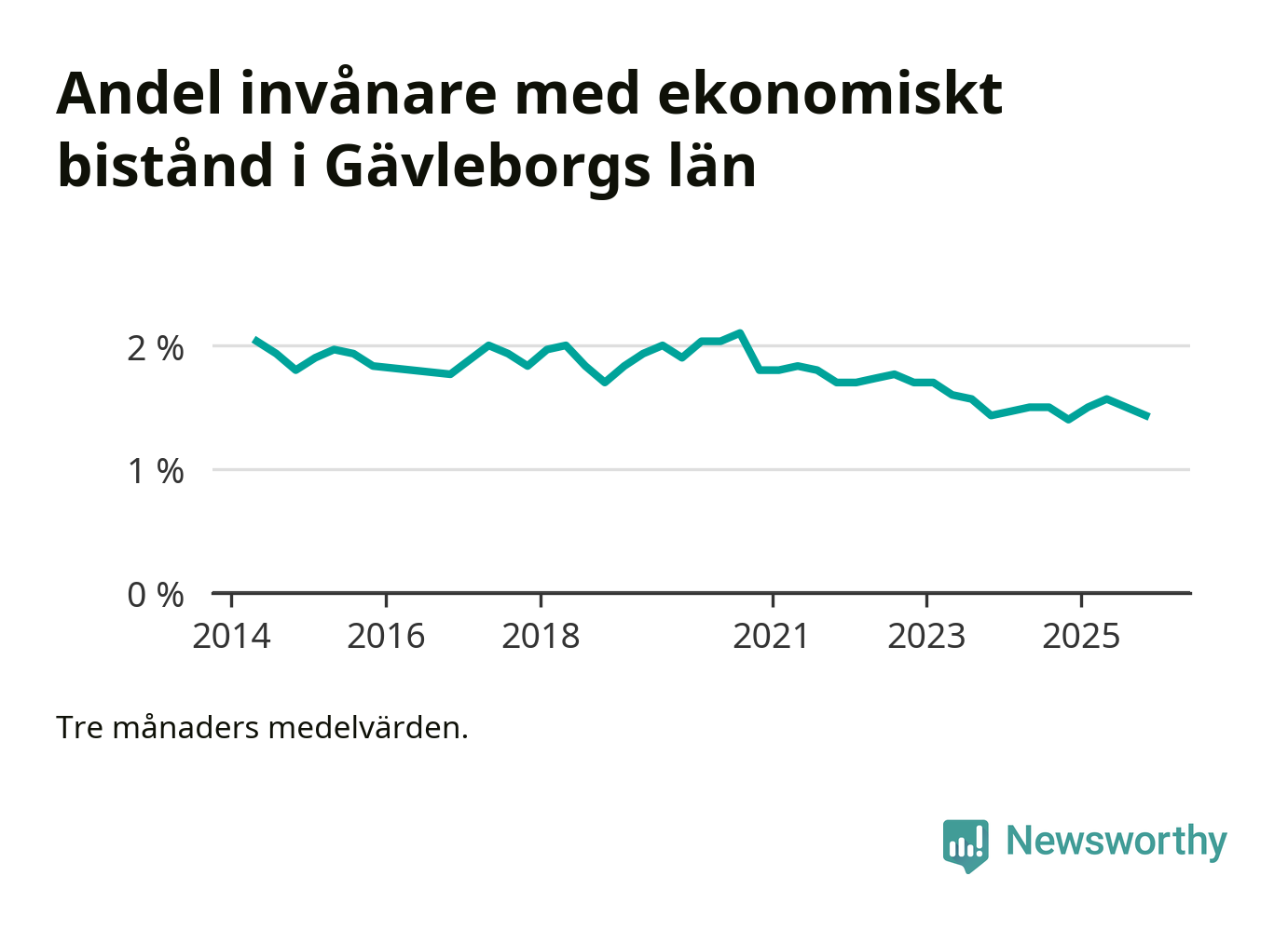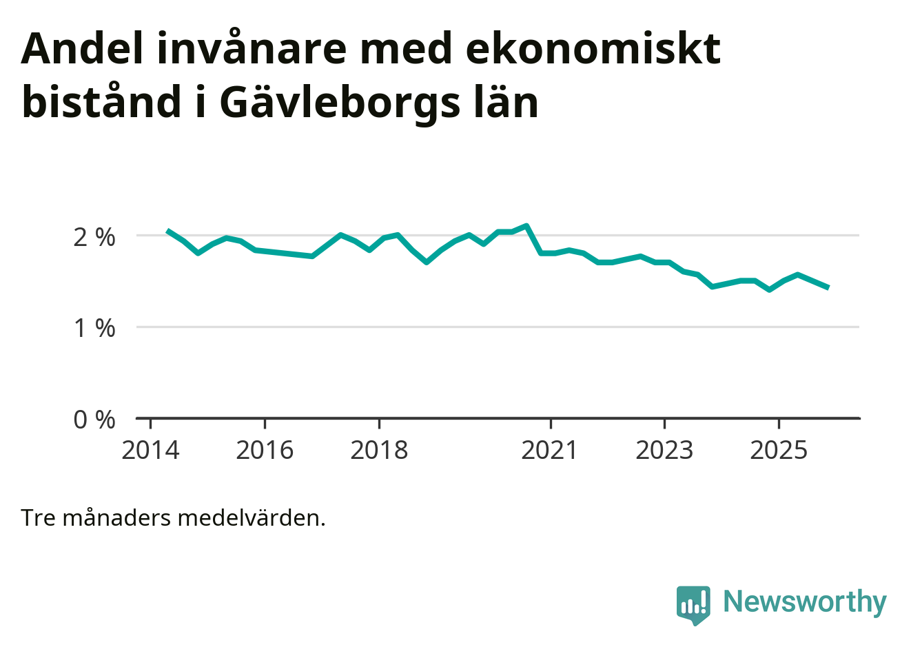 Höstens 1,4 procent är den lägsta andelen biståndstagare i länet under någon tremånadersperiod sedan åtminstone 2014, vilket är så långt tillbaka Socialstyrelsens statistik sträcker sig.