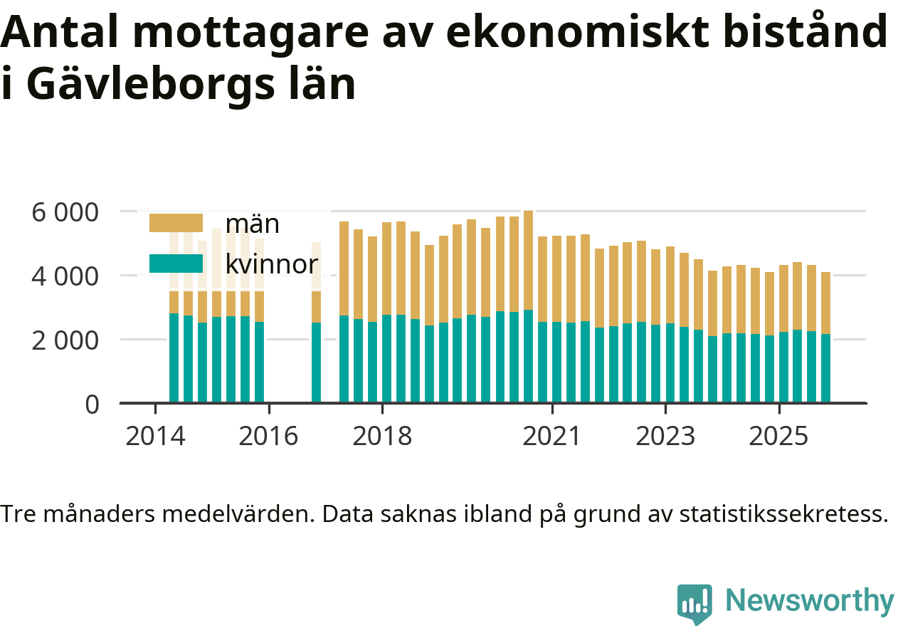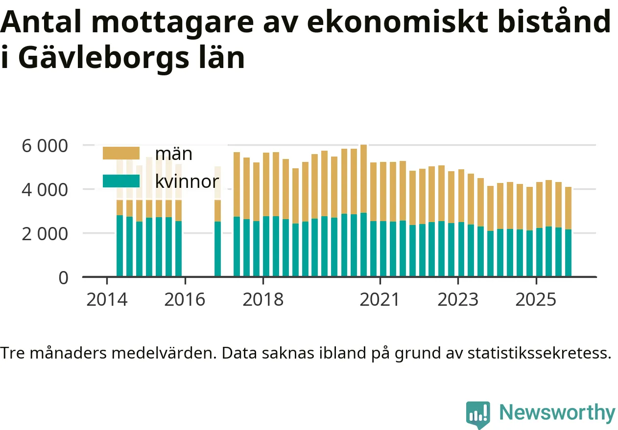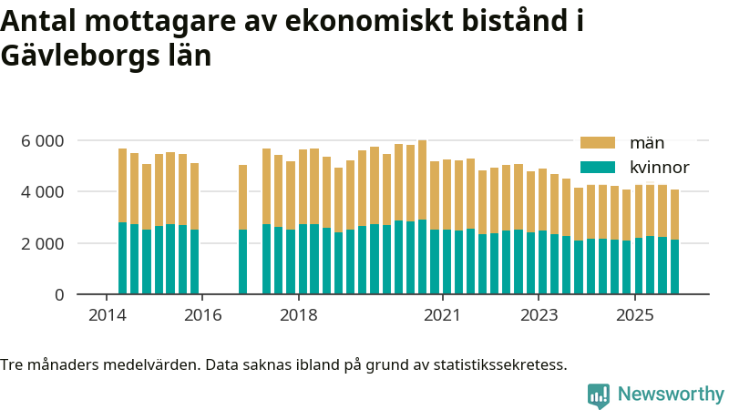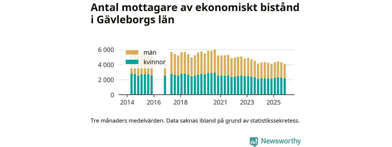 I genomsnitt 4 086 personer per månad fick ekonomiskt bistånd i Gävleborgs län under höstmånaderna (september till november), vilket motsvarar 1,4 procent av den vuxna befolkningen. Det är marginellt mindre än i somras, och något större andel än under hösten för ett år sedan.