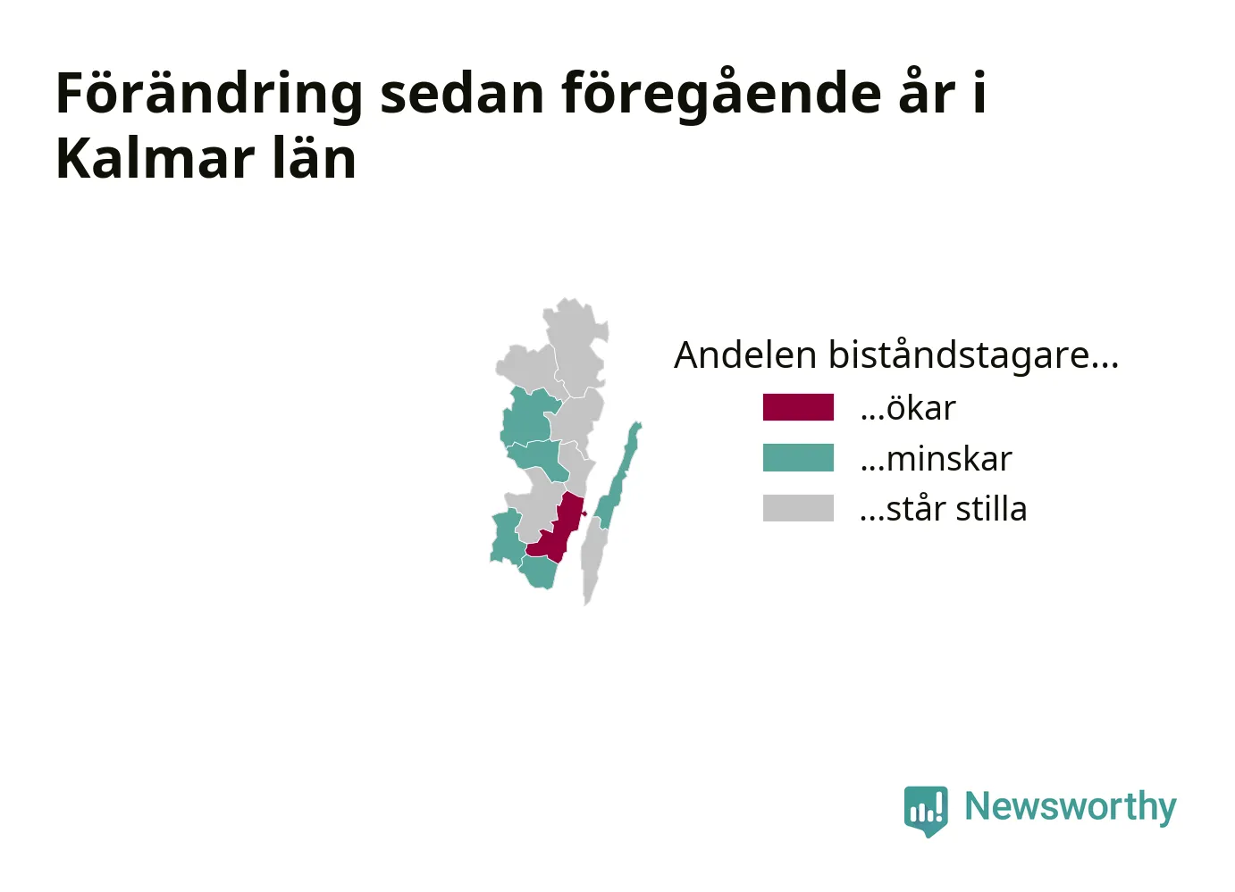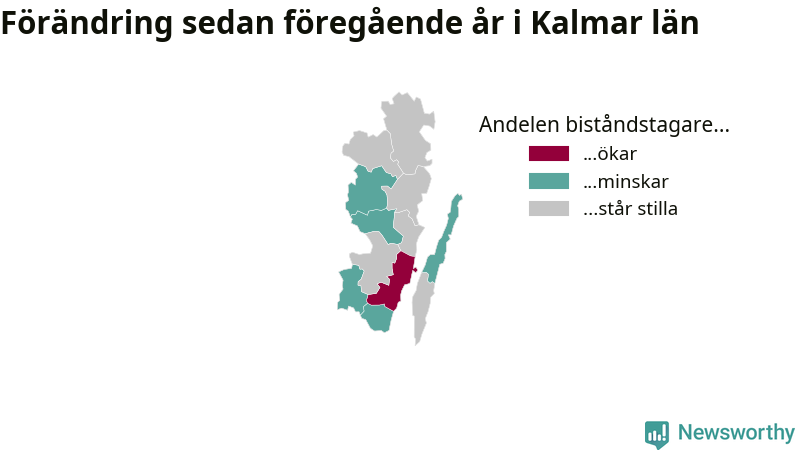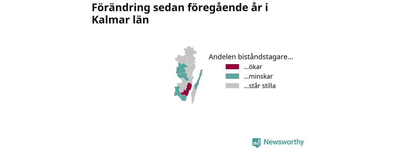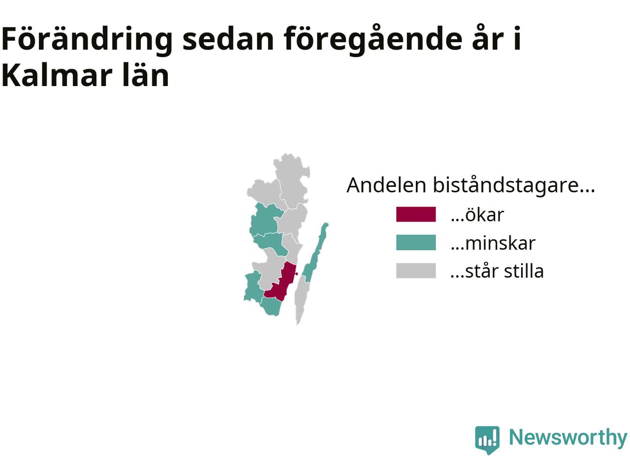 I Kalmar län som helhet var andelen biståndstagare 0,8 procent, vilket är ungefär samma nivå som månaden innan.