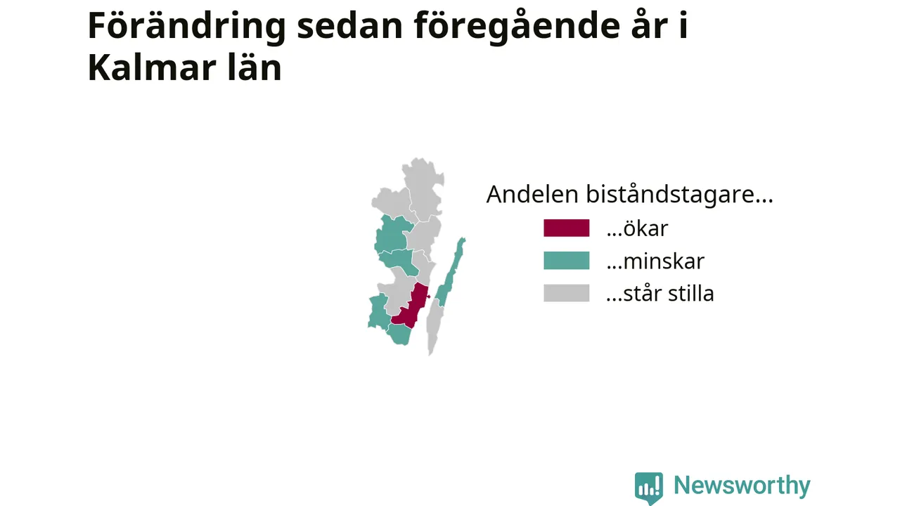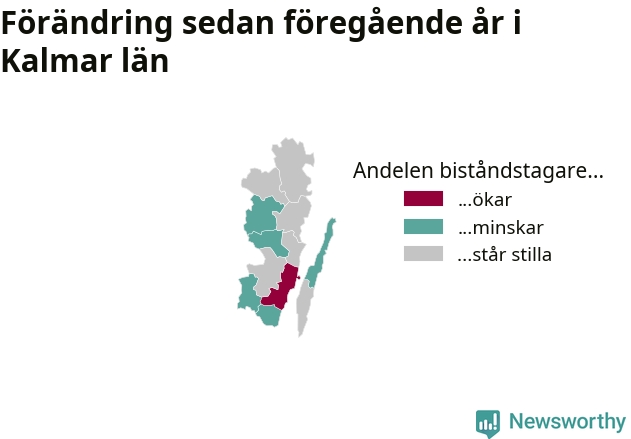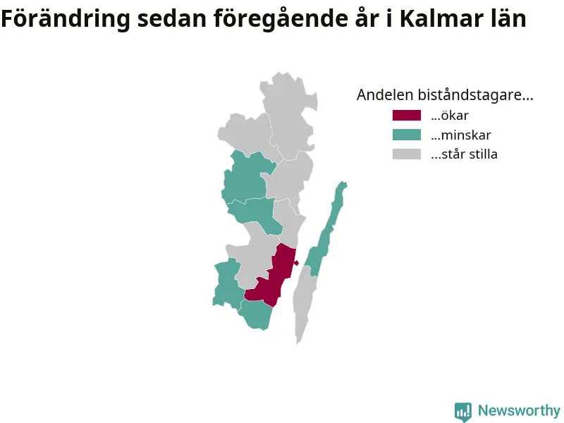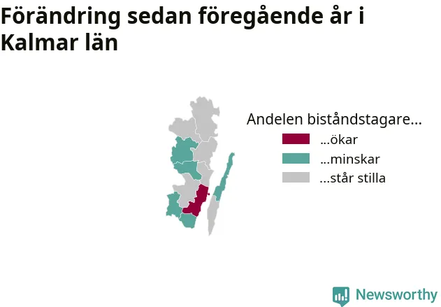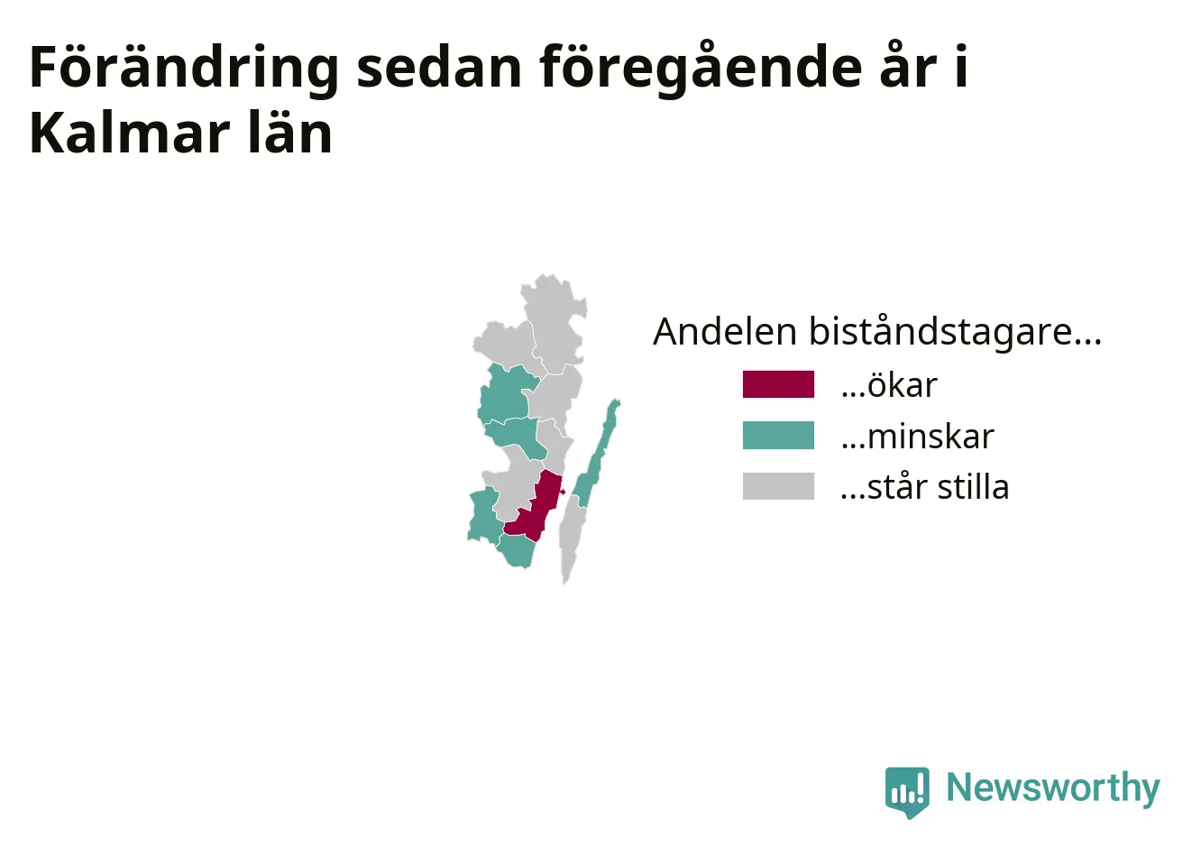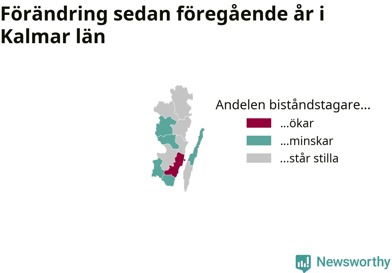 I Kalmar län som helhet var andelen biståndstagare 0,8 procent, vilket är ungefär samma nivå som månaden innan.