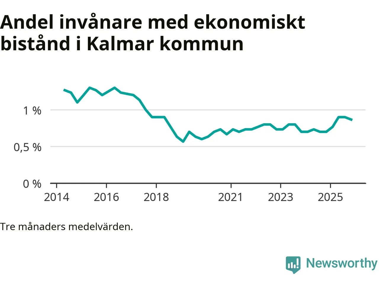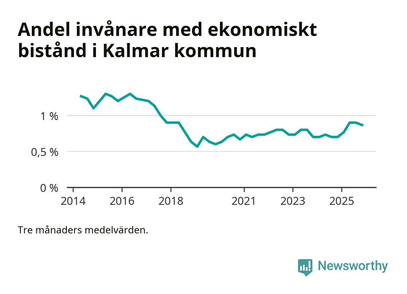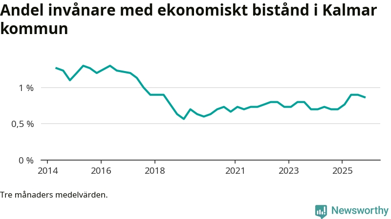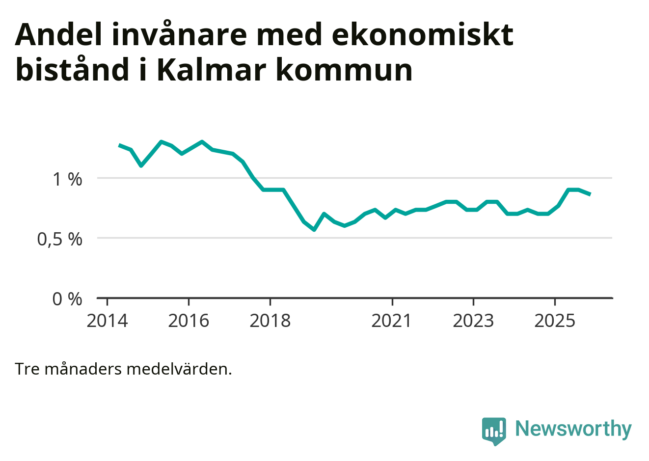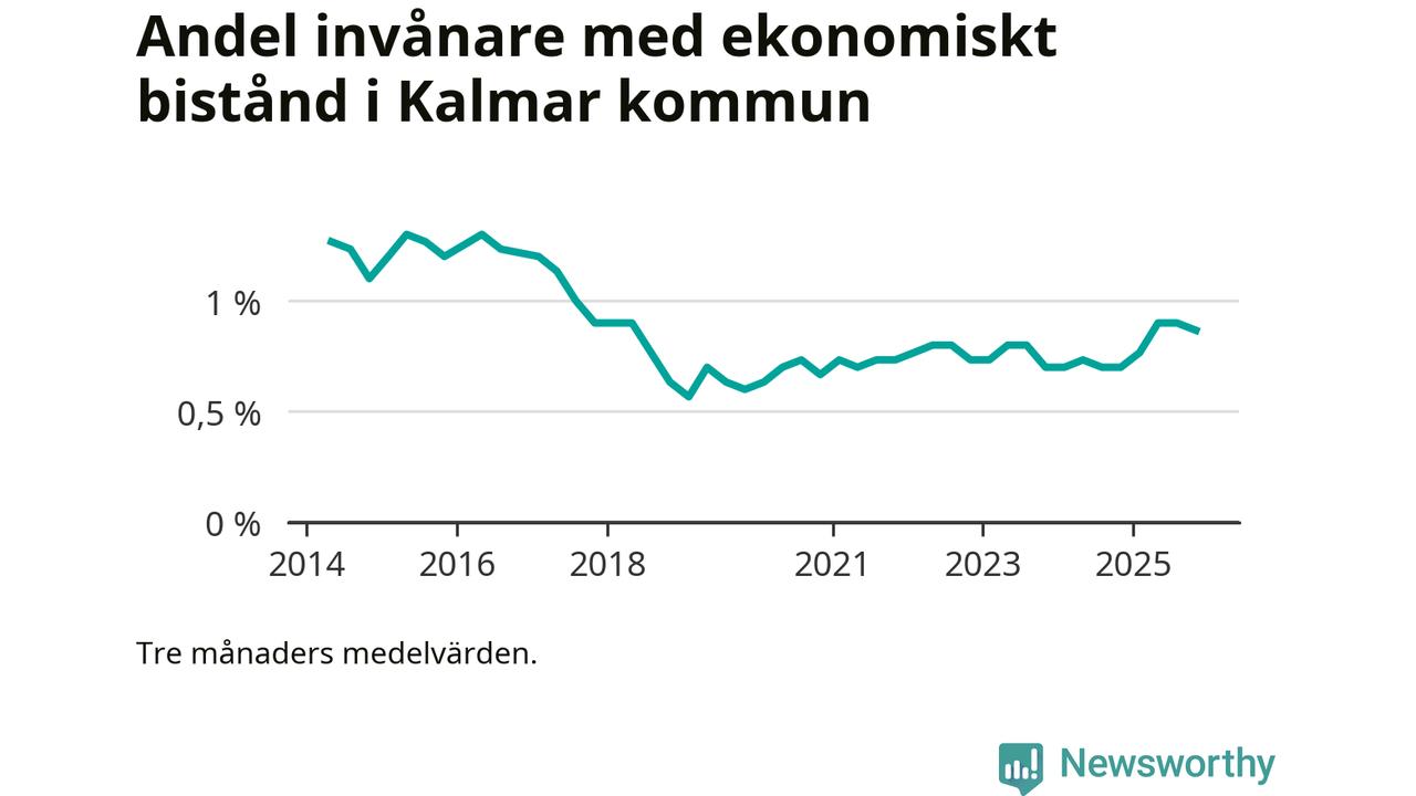 I genomsnitt 621 personer per månad fick ekonomiskt bistånd i Kalmar kommun under höstmånaderna (september till november), vilket motsvarar 0,9 procent av den vuxna befolkningen. Det är marginellt mindre än i somras, och något större andel än under hösten för ett år sedan.