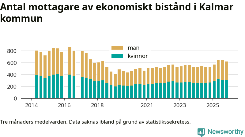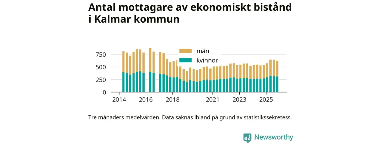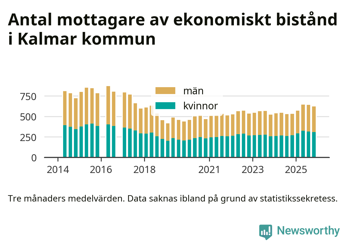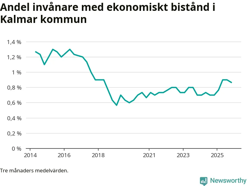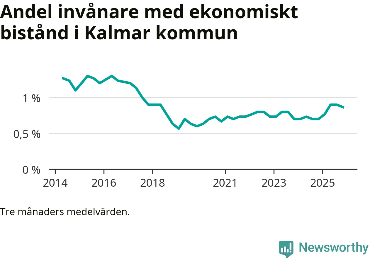 I genomsnitt 621 personer per månad fick ekonomiskt bistånd i Kalmar kommun under höstmånaderna (september till november), vilket motsvarar 0,9 procent av den vuxna befolkningen. Det är marginellt mindre än i somras, och något större andel än under hösten för ett år sedan.