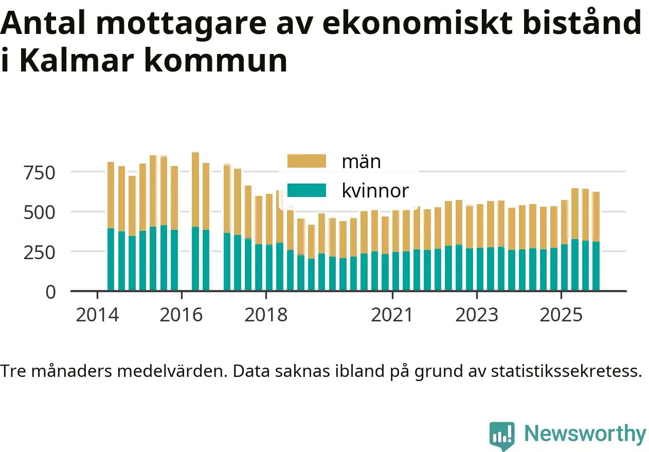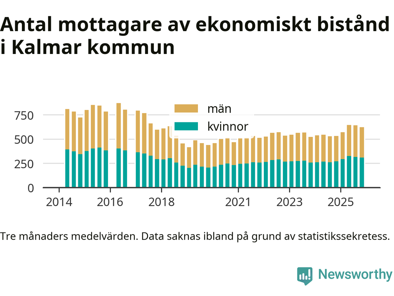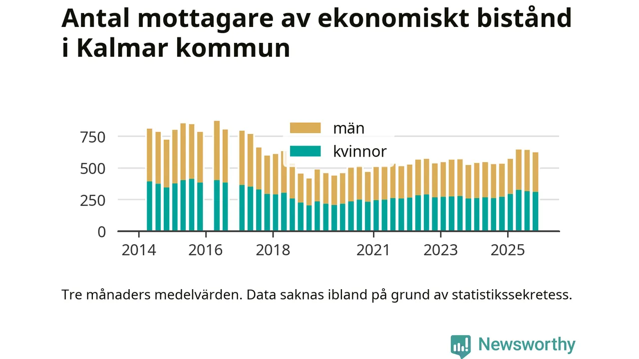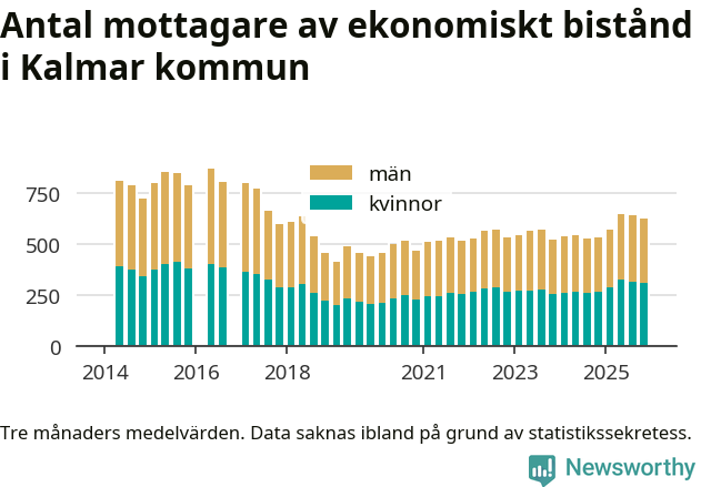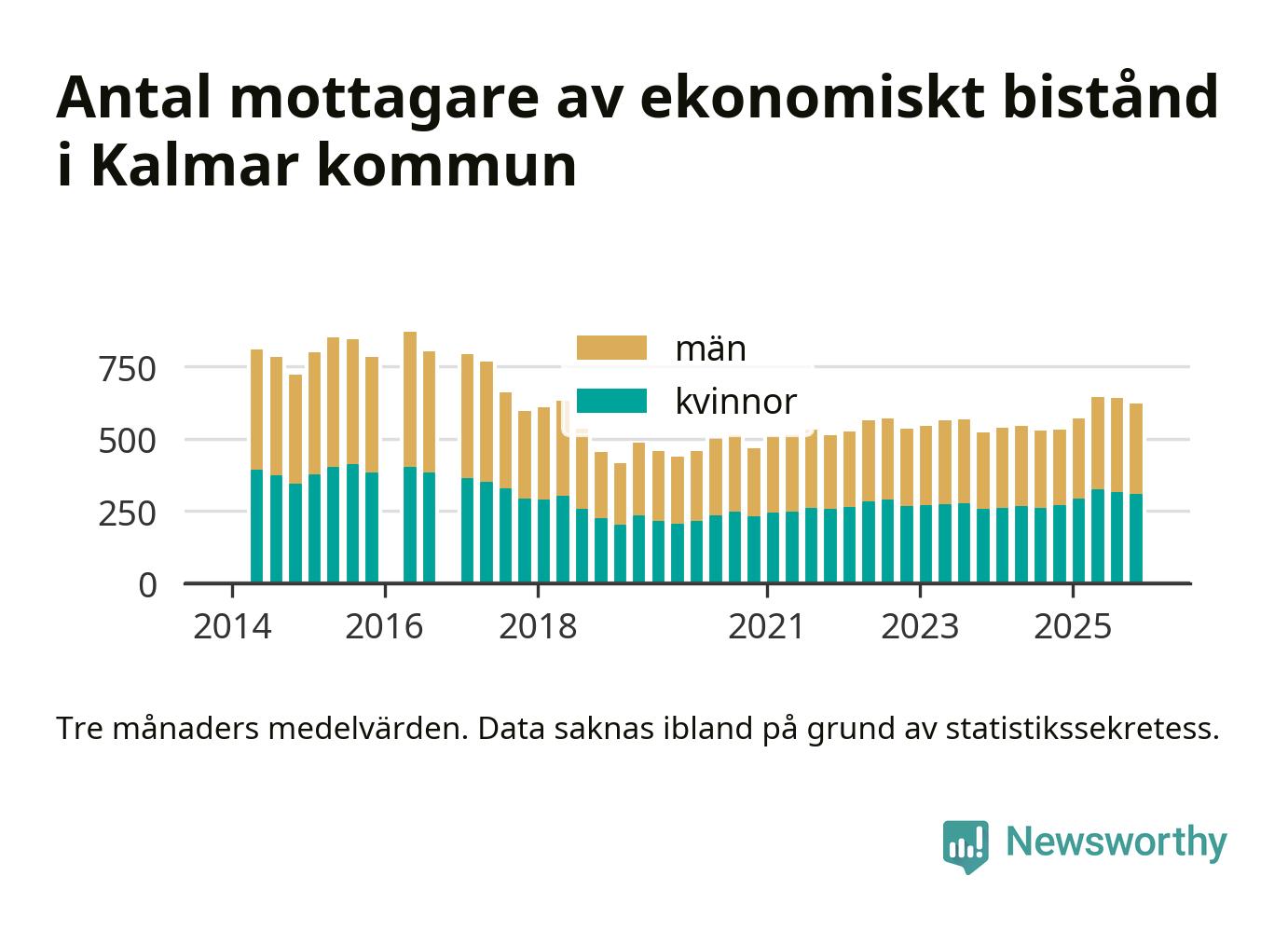 I genomsnitt 621 personer per månad fick ekonomiskt bistånd i Kalmar kommun under höstmånaderna (september till november), vilket motsvarar 0,9 procent av den vuxna befolkningen. Det är marginellt mindre än i somras, och något större andel än under hösten för ett år sedan.