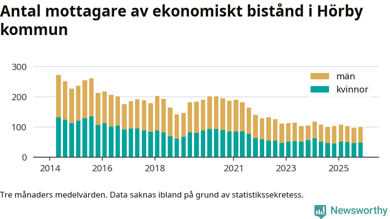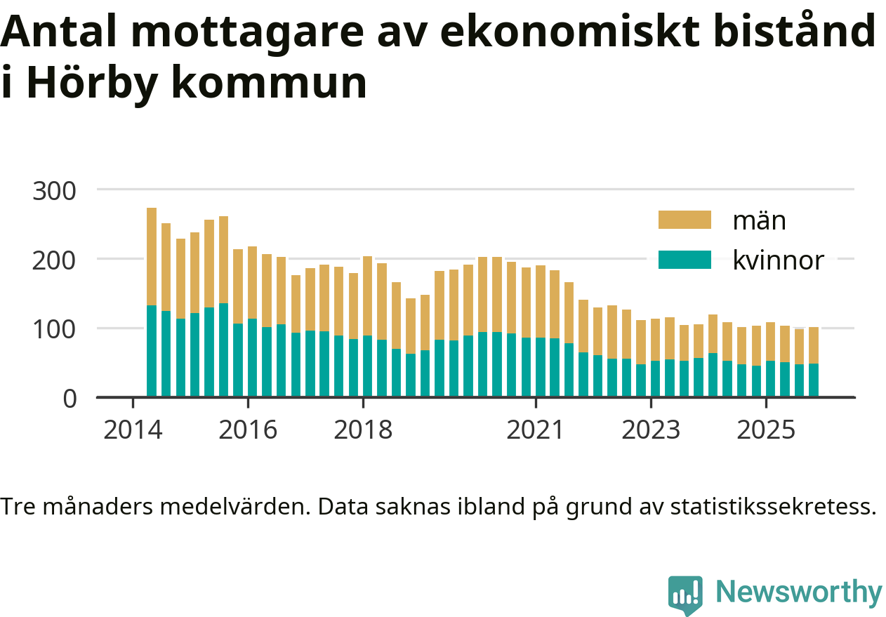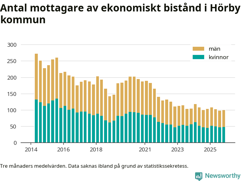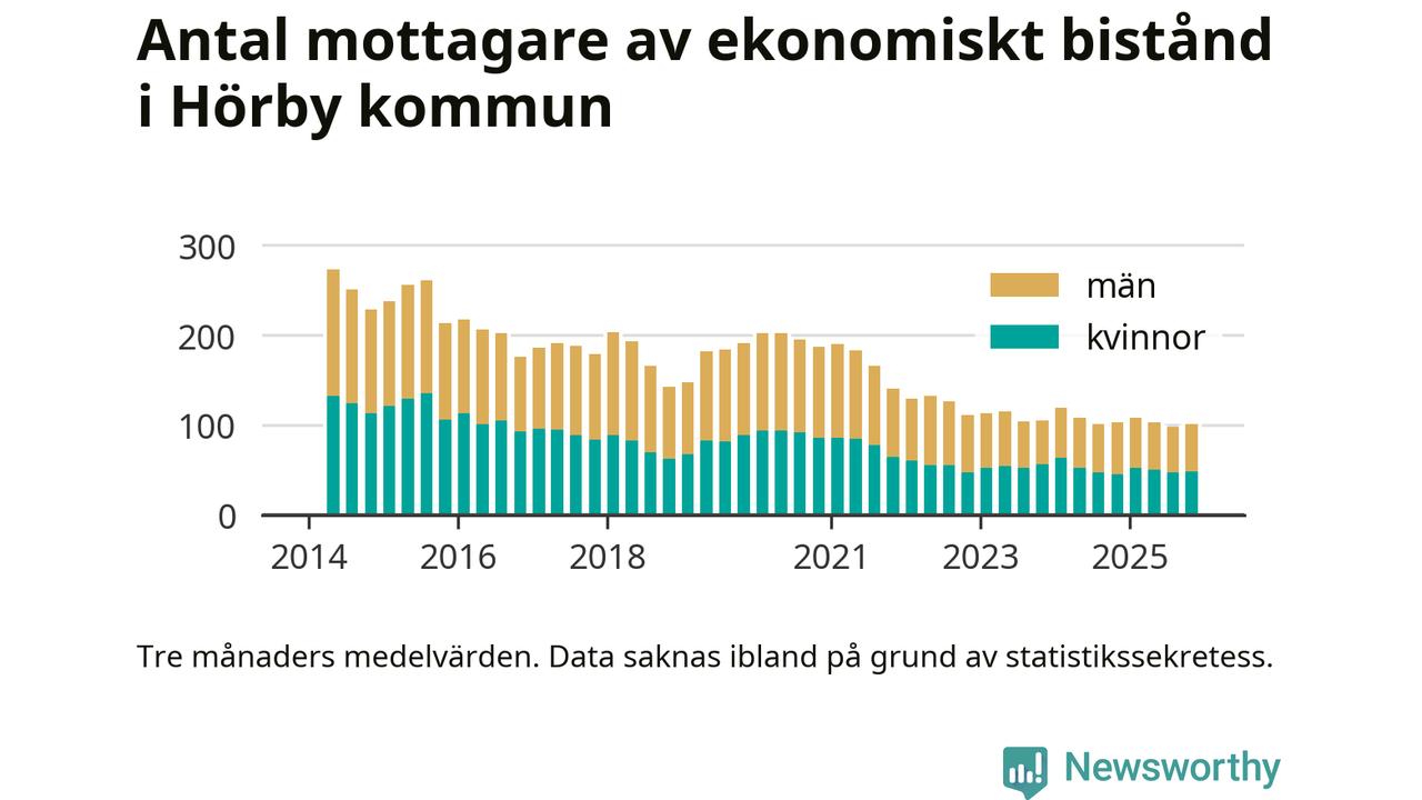 I genomsnitt 100 personer per månad fick ekonomiskt bistånd i Hörby kommun under höstmånaderna (september till november), vilket motsvarar 0,6 procent av den vuxna befolkningen. Det är marginellt mer än i somras, och något mindre andel än under hösten för ett år sedan.
