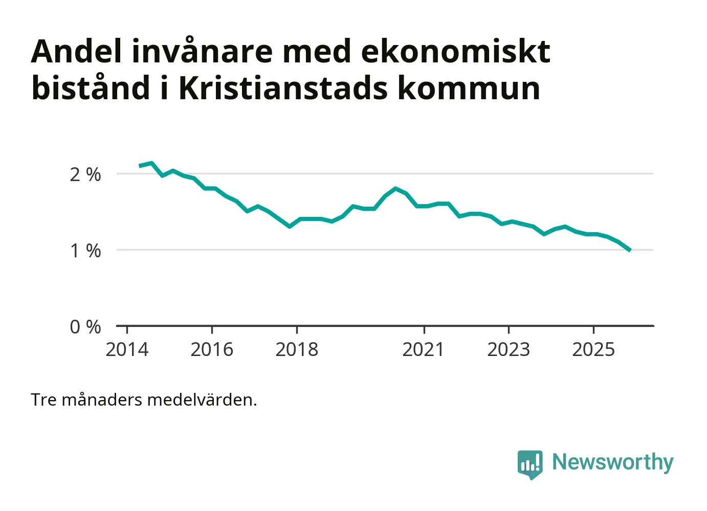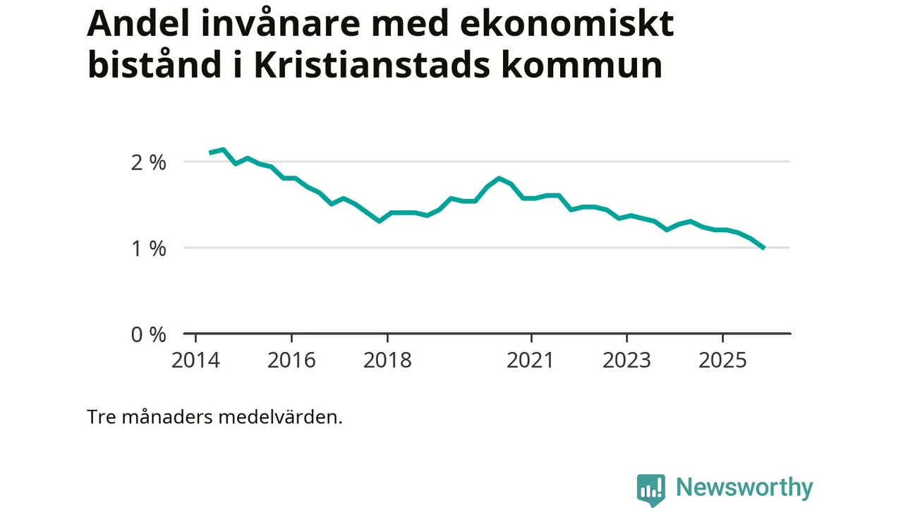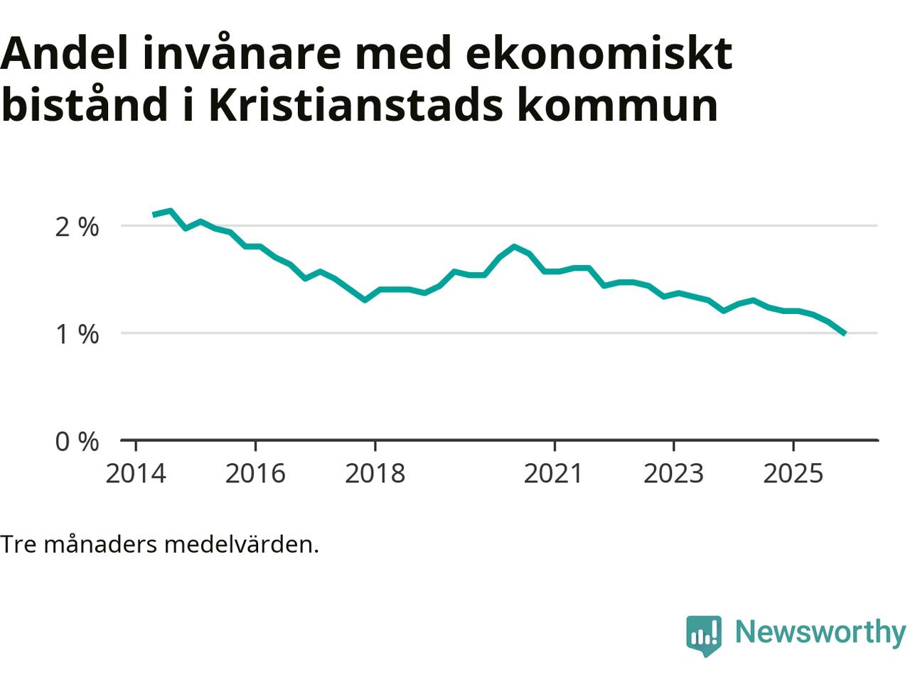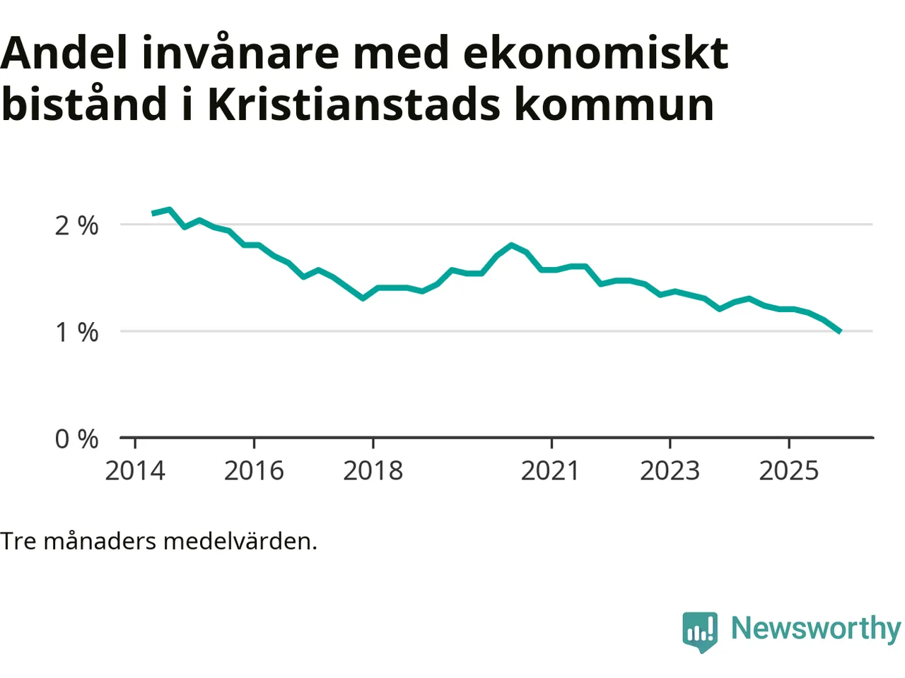 Andelen invånare med ekonomiskt bistånd i Kristianstads kommun var under hösten den lägsta sedan åtminstone 2014. Det visar den senaste, preliminära statistiken från Socialstyrelsen.