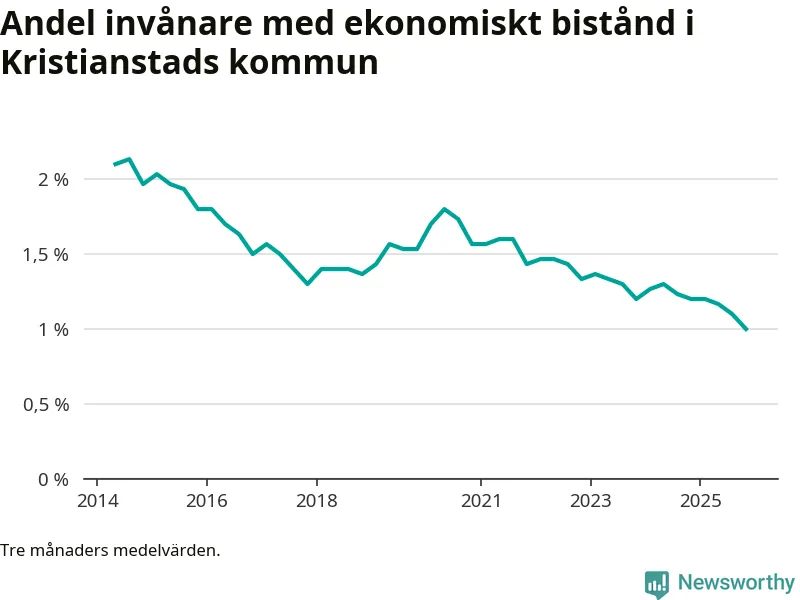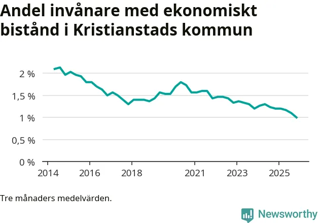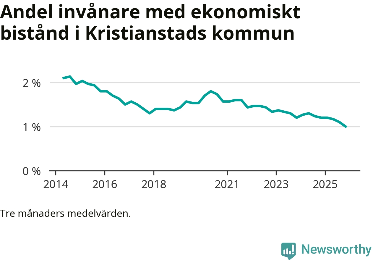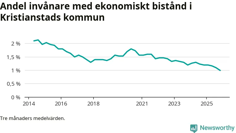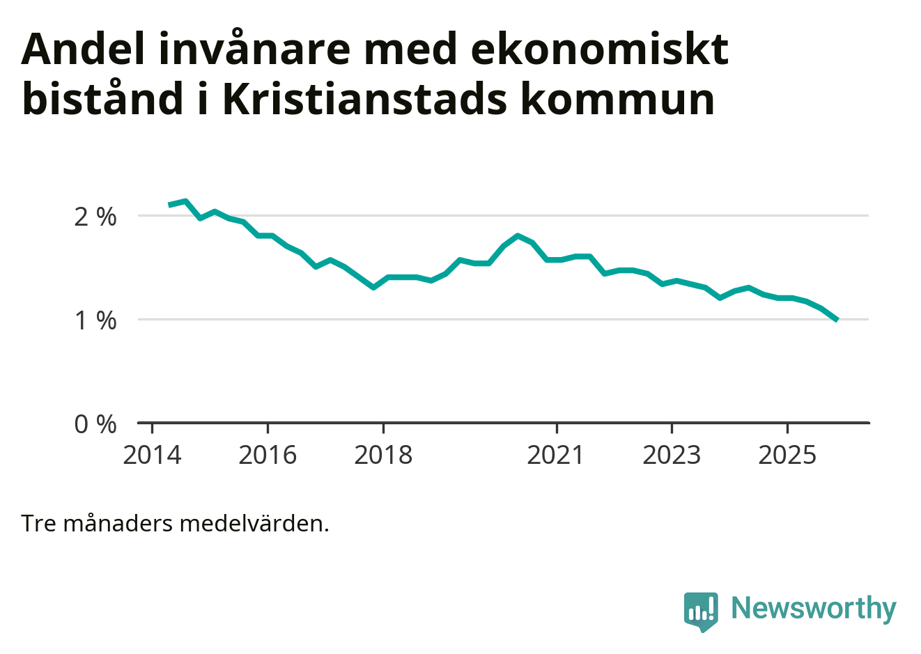 Andelen invånare med ekonomiskt bistånd i Kristianstads kommun var under hösten den lägsta sedan åtminstone 2014. Det visar den senaste, preliminära statistiken från Socialstyrelsen.