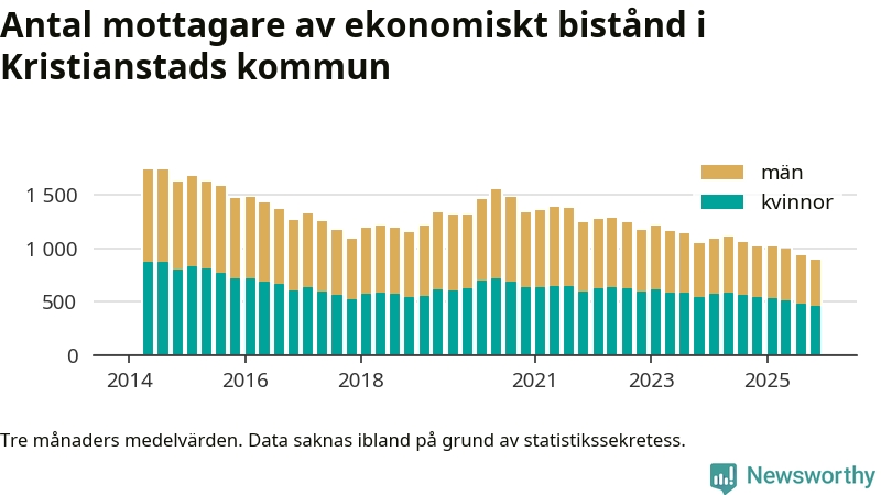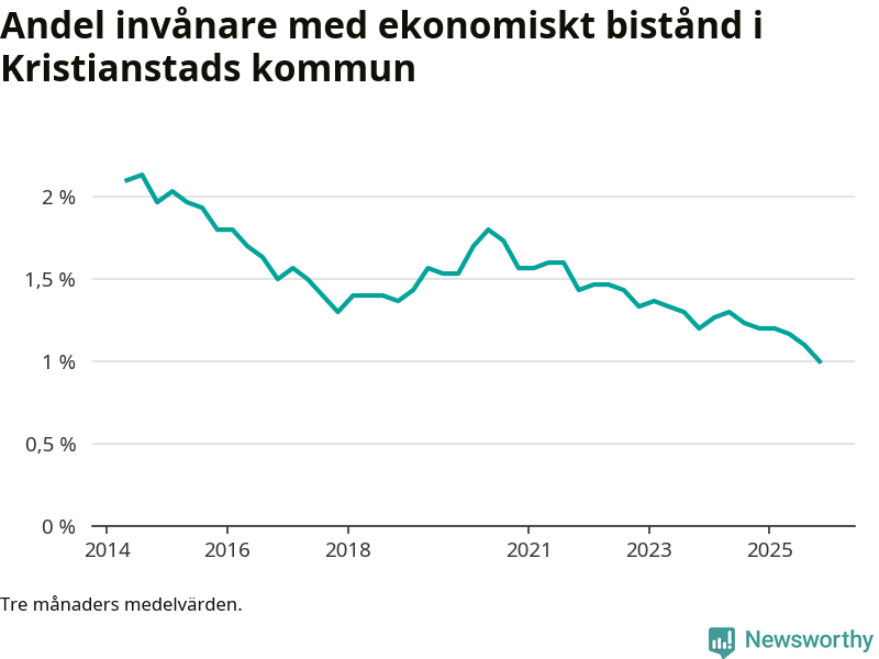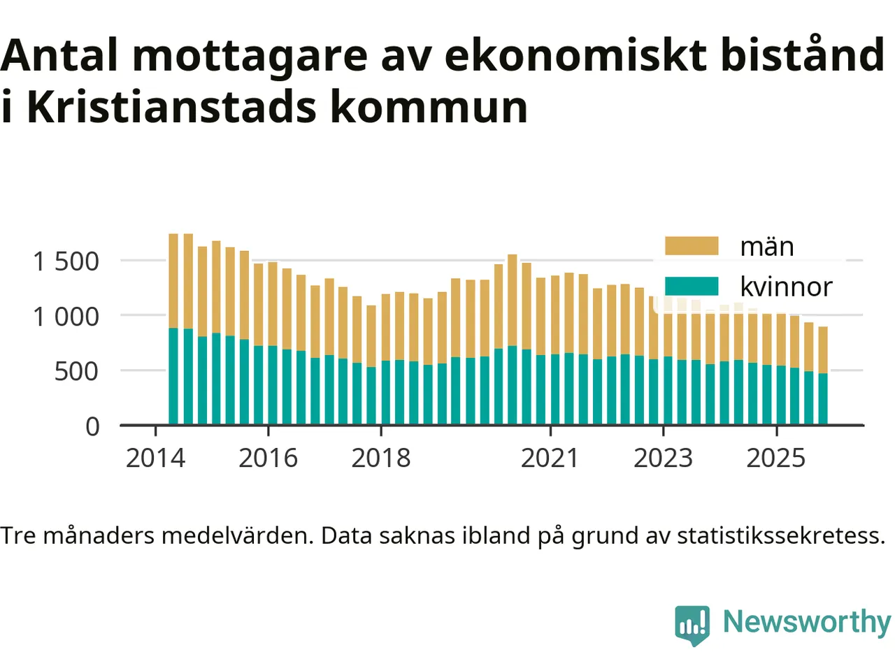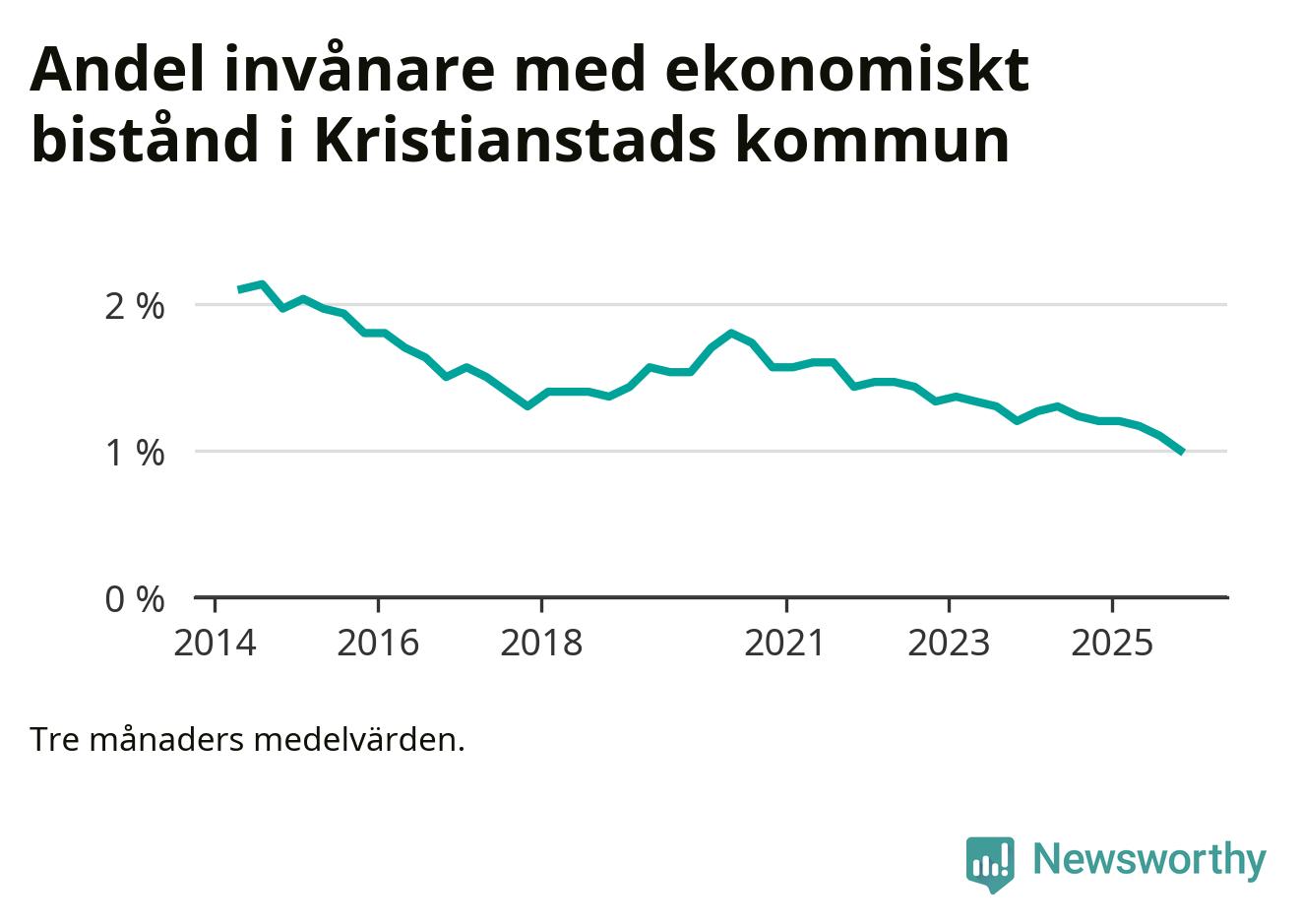 I genomsnitt 891 personer per månad fick ekonomiskt bistånd i Kristianstads kommun under höstmånaderna (september till november), vilket motsvarar 1,0 procent av den vuxna befolkningen. Det är marginellt mindre än i somras, och något mindre andel än under hösten för ett år sedan.