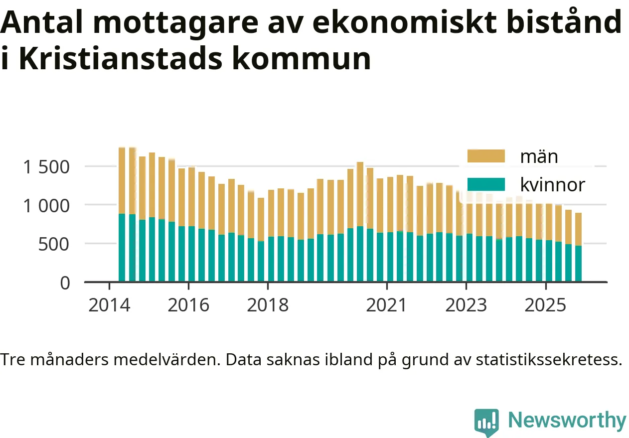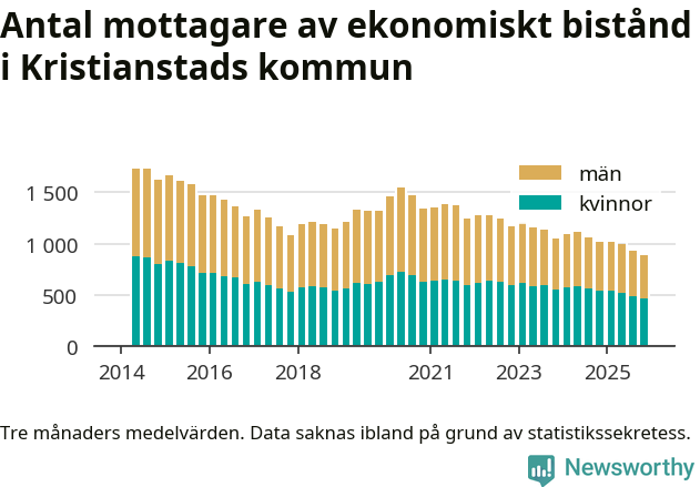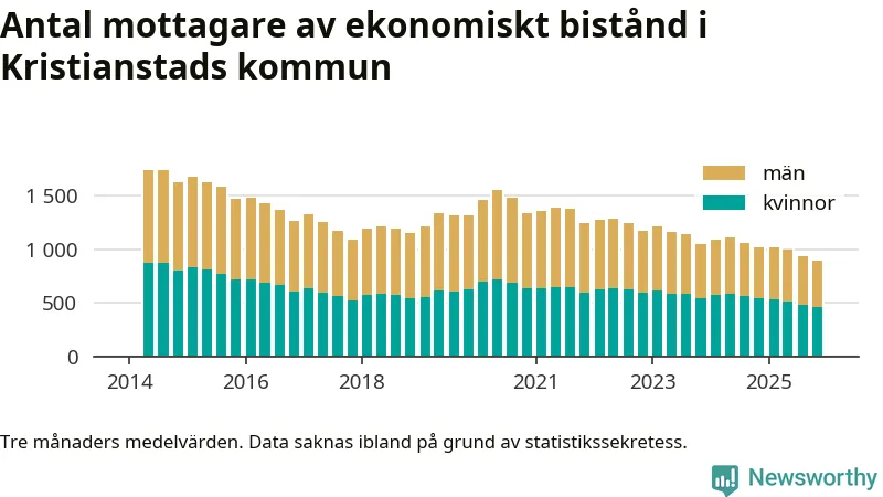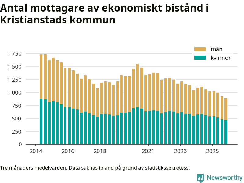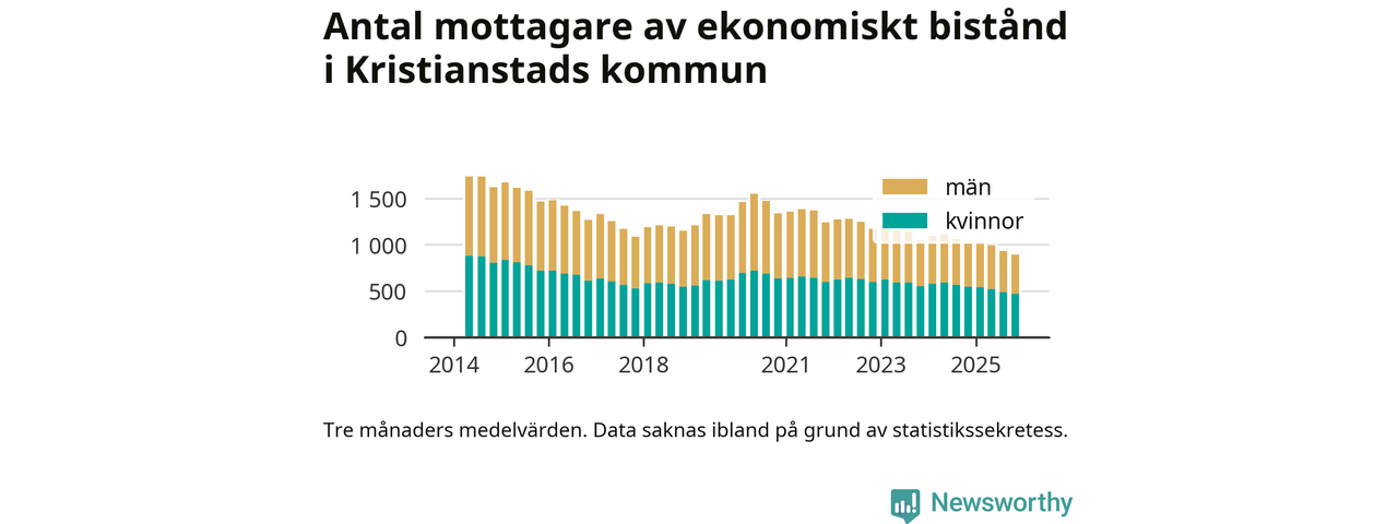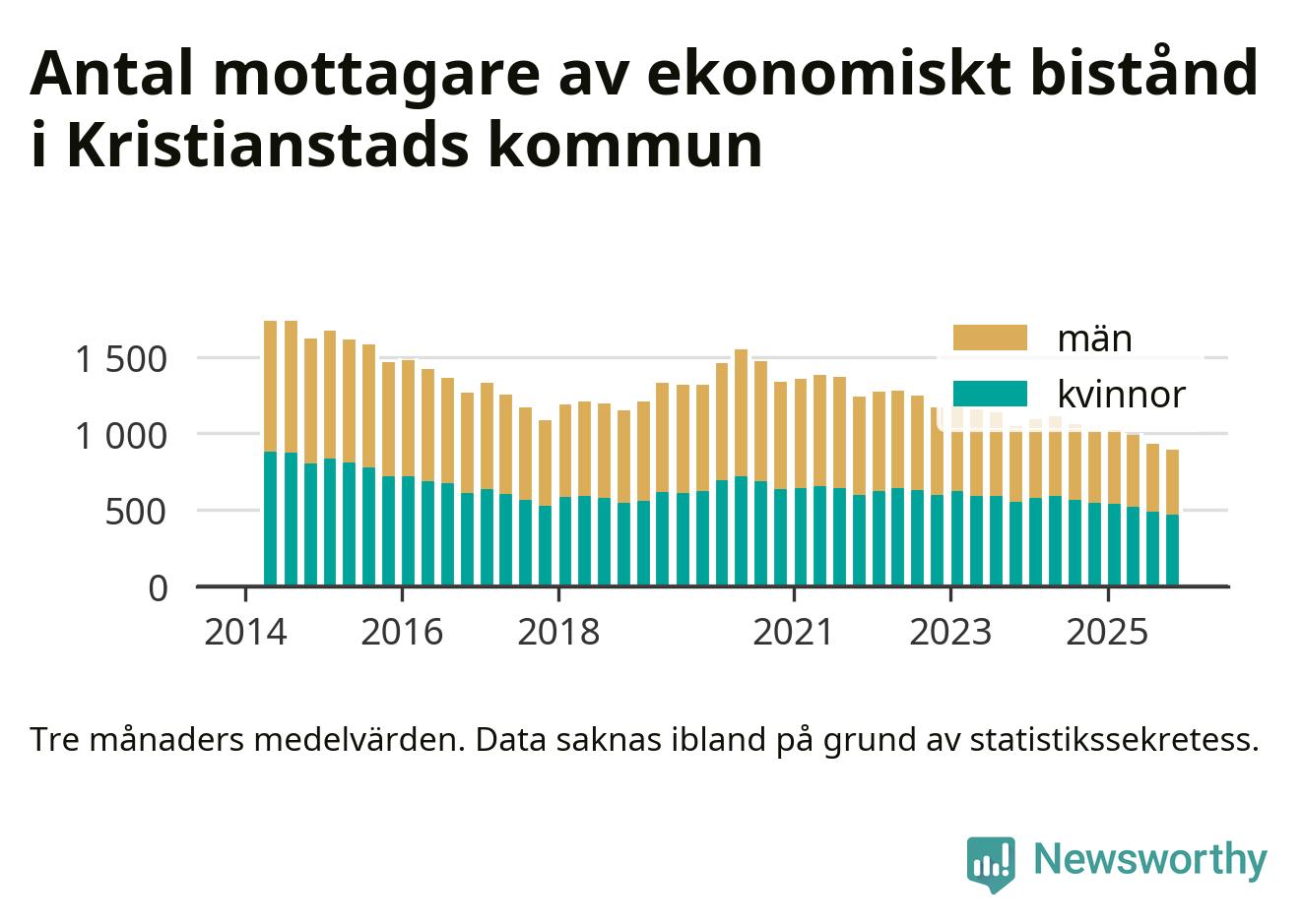 I genomsnitt 891 personer per månad fick ekonomiskt bistånd i Kristianstads kommun under höstmånaderna (september till november), vilket motsvarar 1,0 procent av den vuxna befolkningen. Det är marginellt mindre än i somras, och något mindre andel än under hösten för ett år sedan.