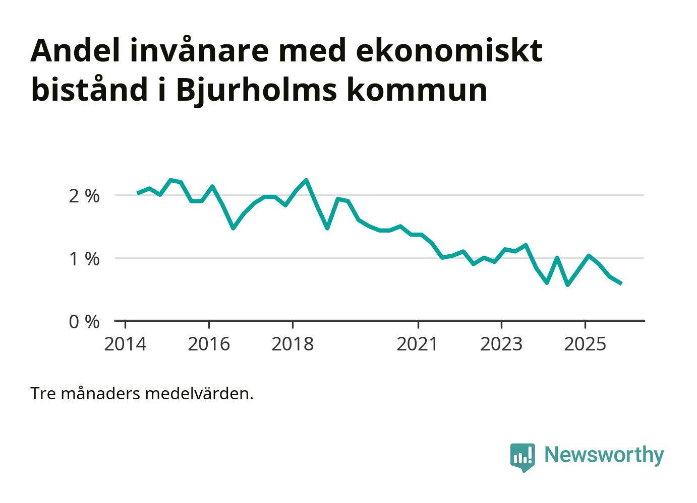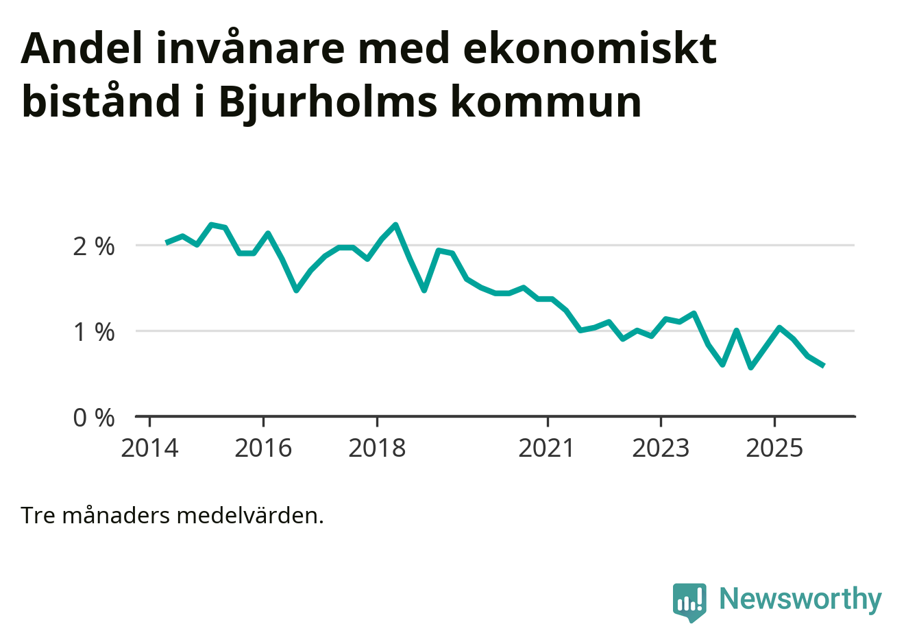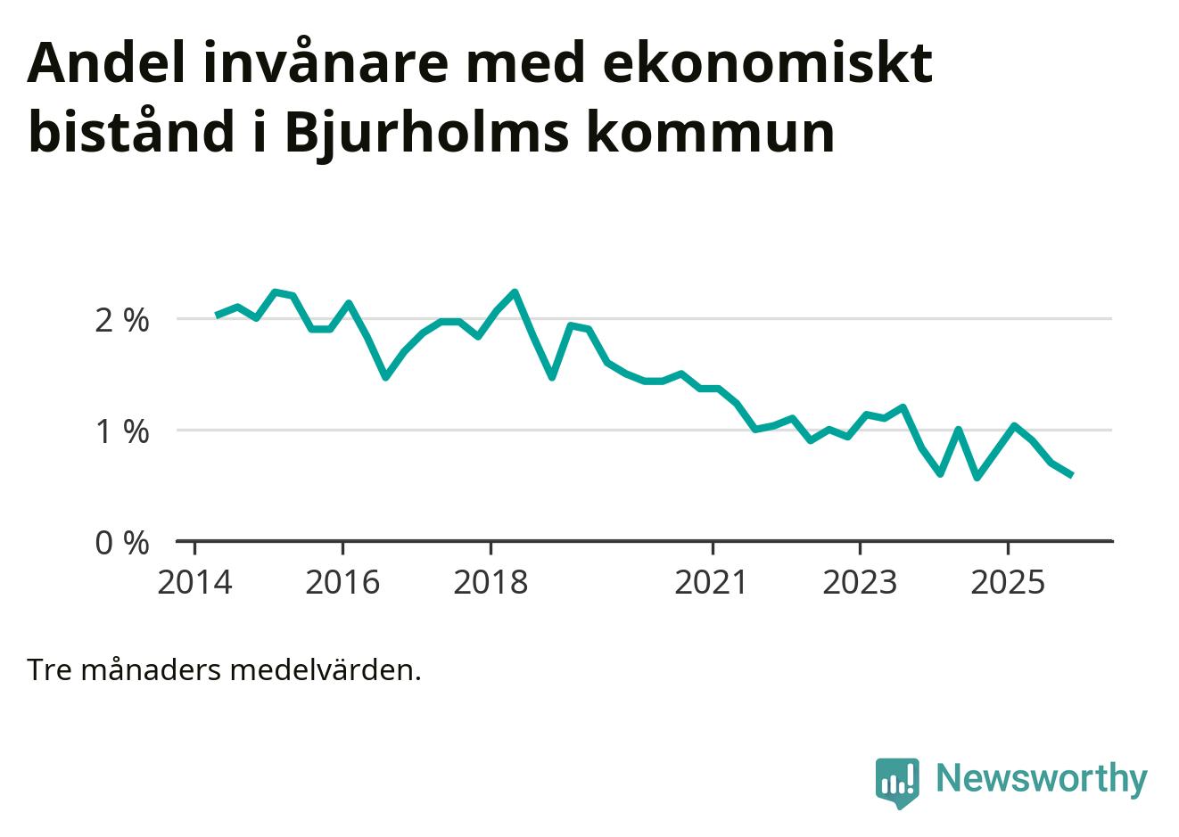 Den högsta andelen biståndstagare under det senaste decenniet hade kommunen under vintern 2015 (2,2 procent), och den lägsta andelen under sommaren 2024 (0,6 procent).