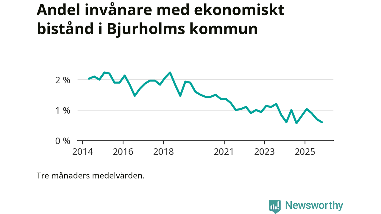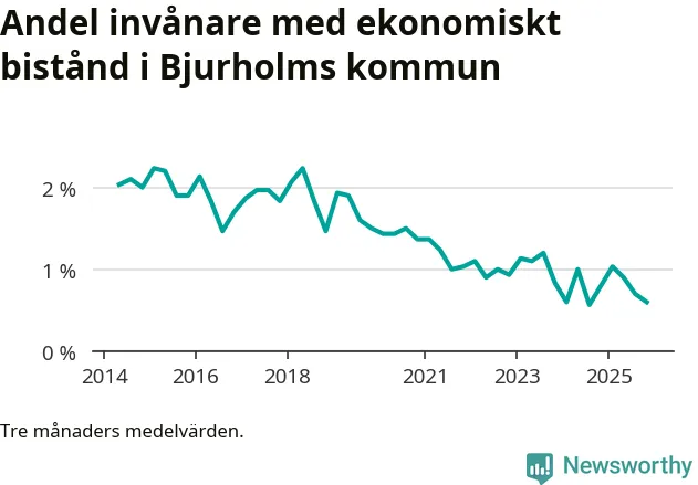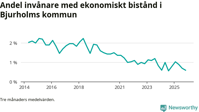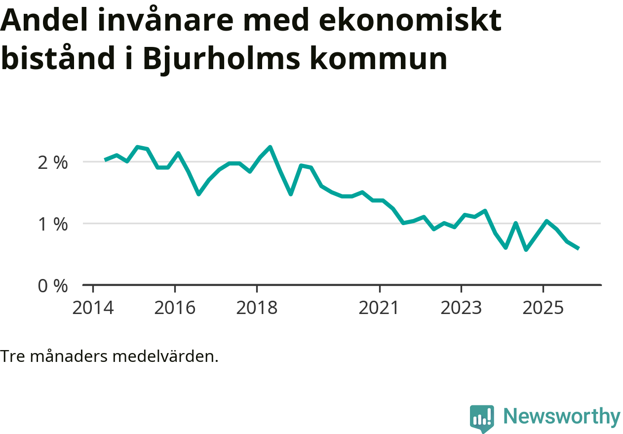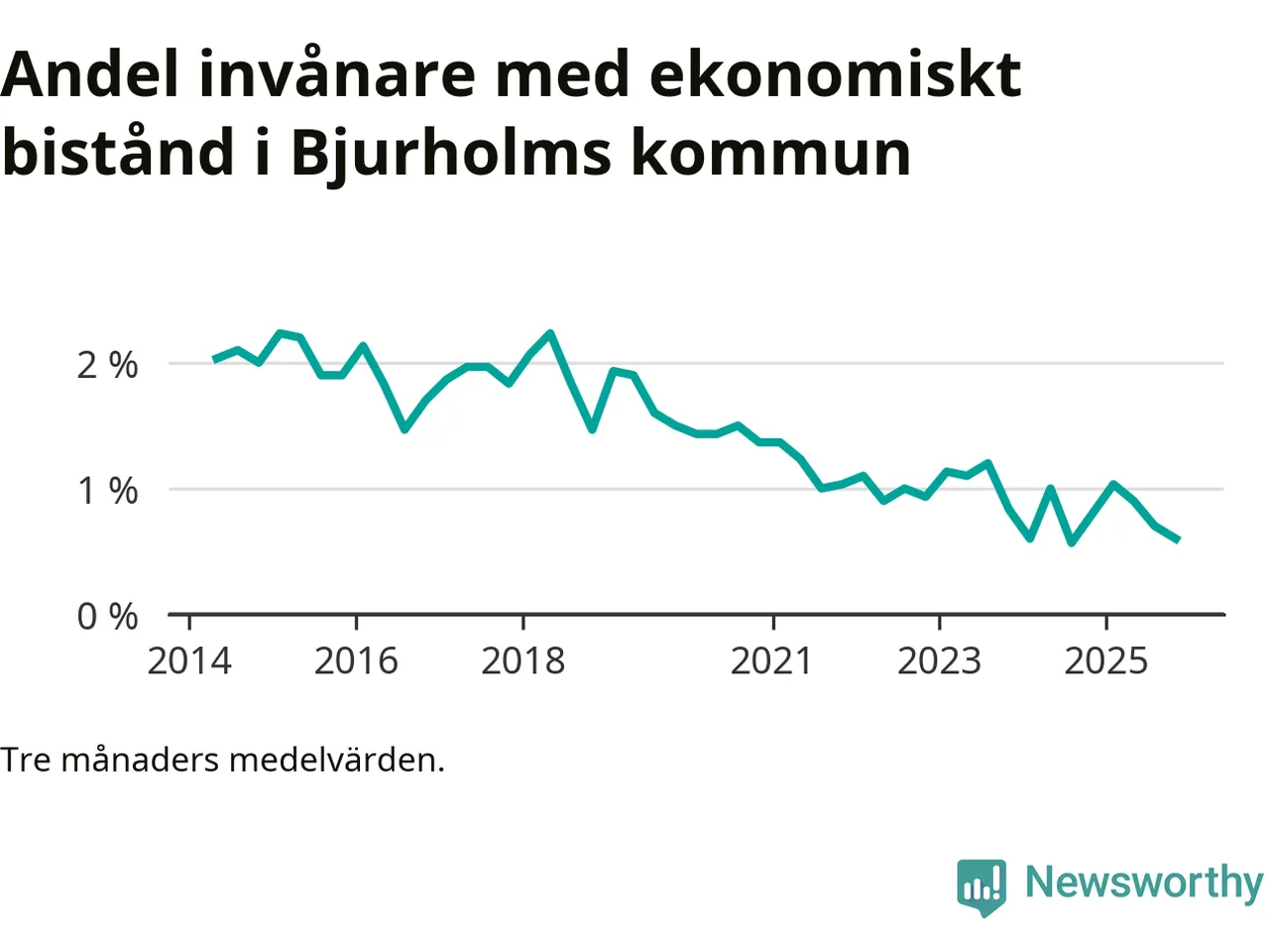 Den högsta andelen biståndstagare under det senaste decenniet hade kommunen under vintern 2015 (2,2 procent), och den lägsta andelen under sommaren 2024 (0,6 procent).