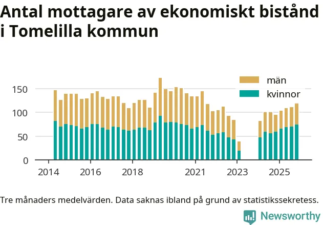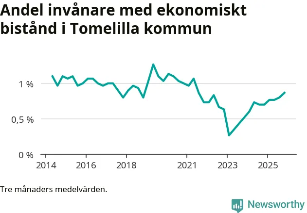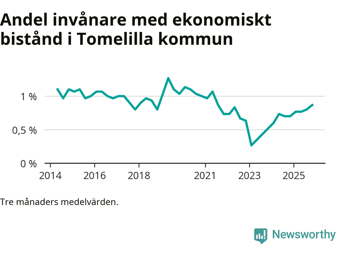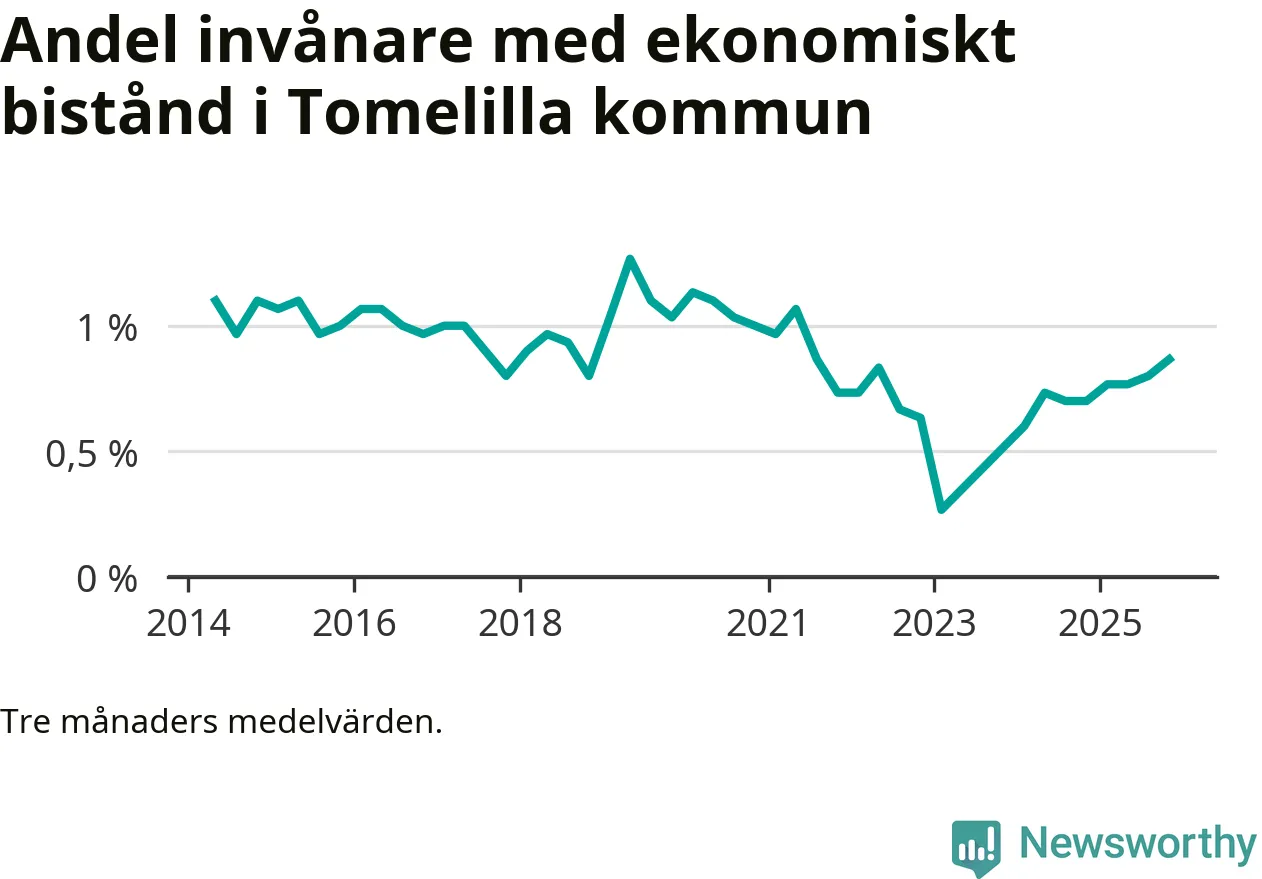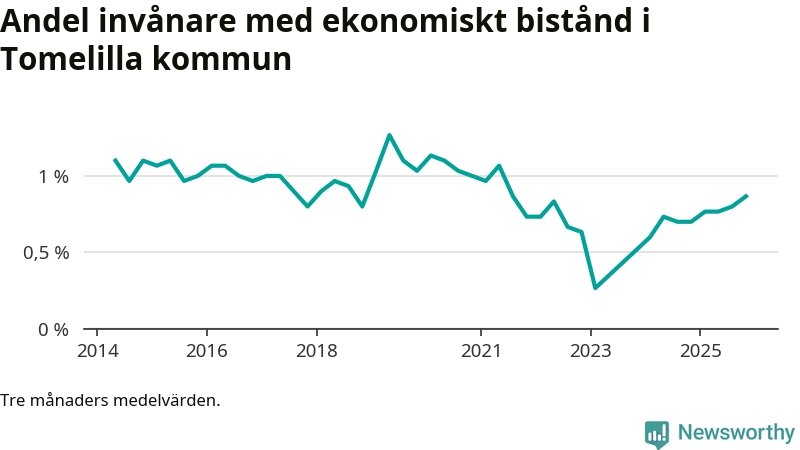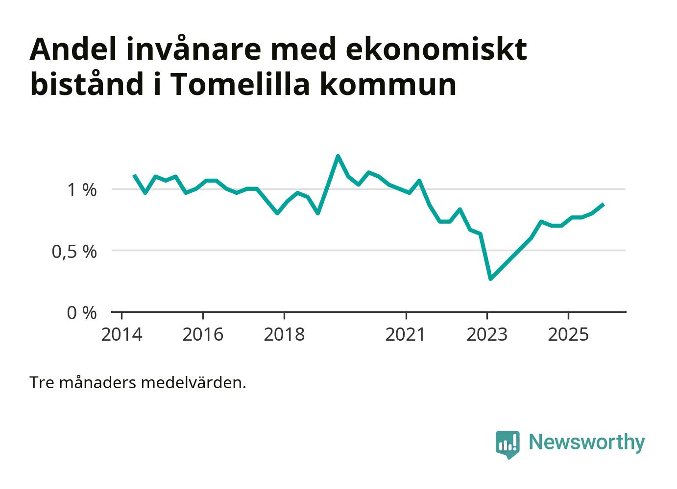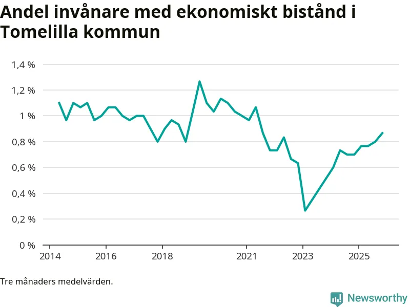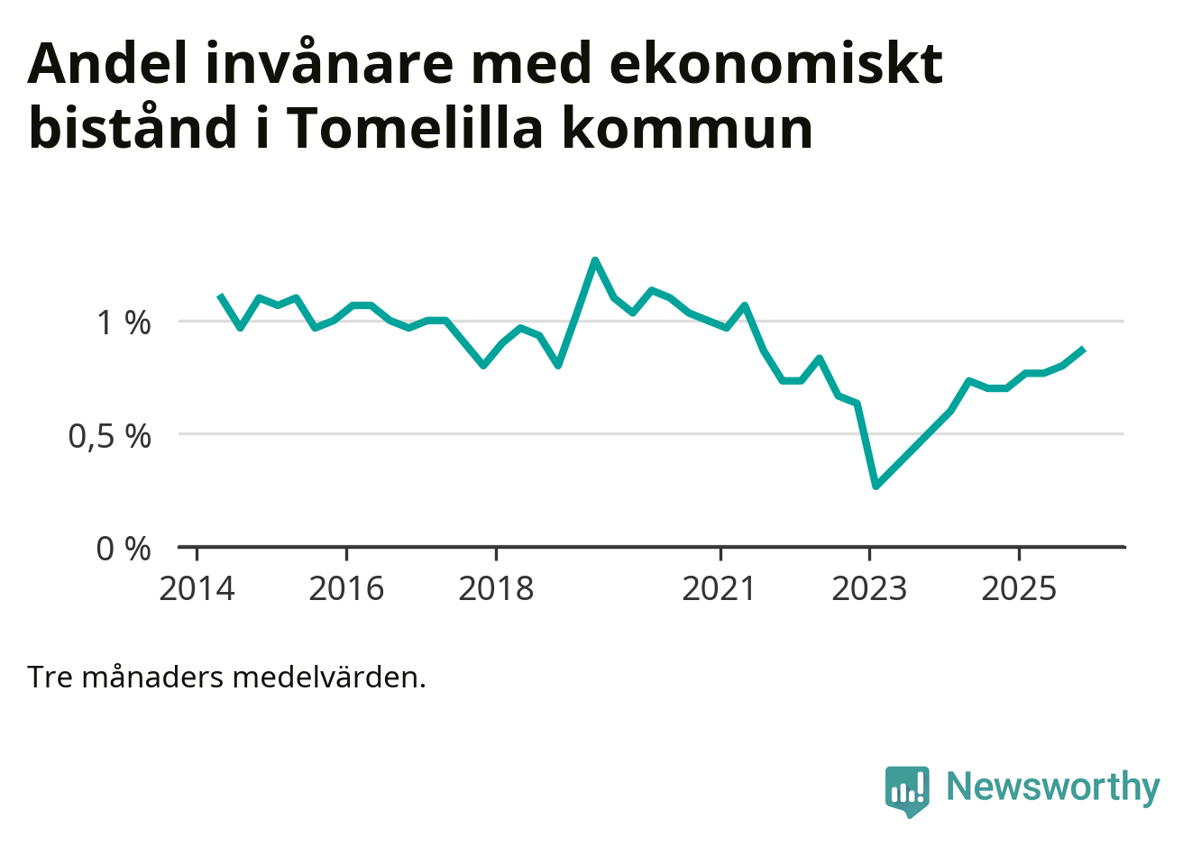 Den högsta andelen biståndstagare under det senaste decenniet hade kommunen under våren 2019 (1,3 procent), och den lägsta andelen under vintern 2023 (0,3 procent).
