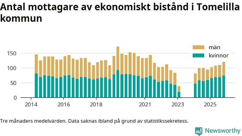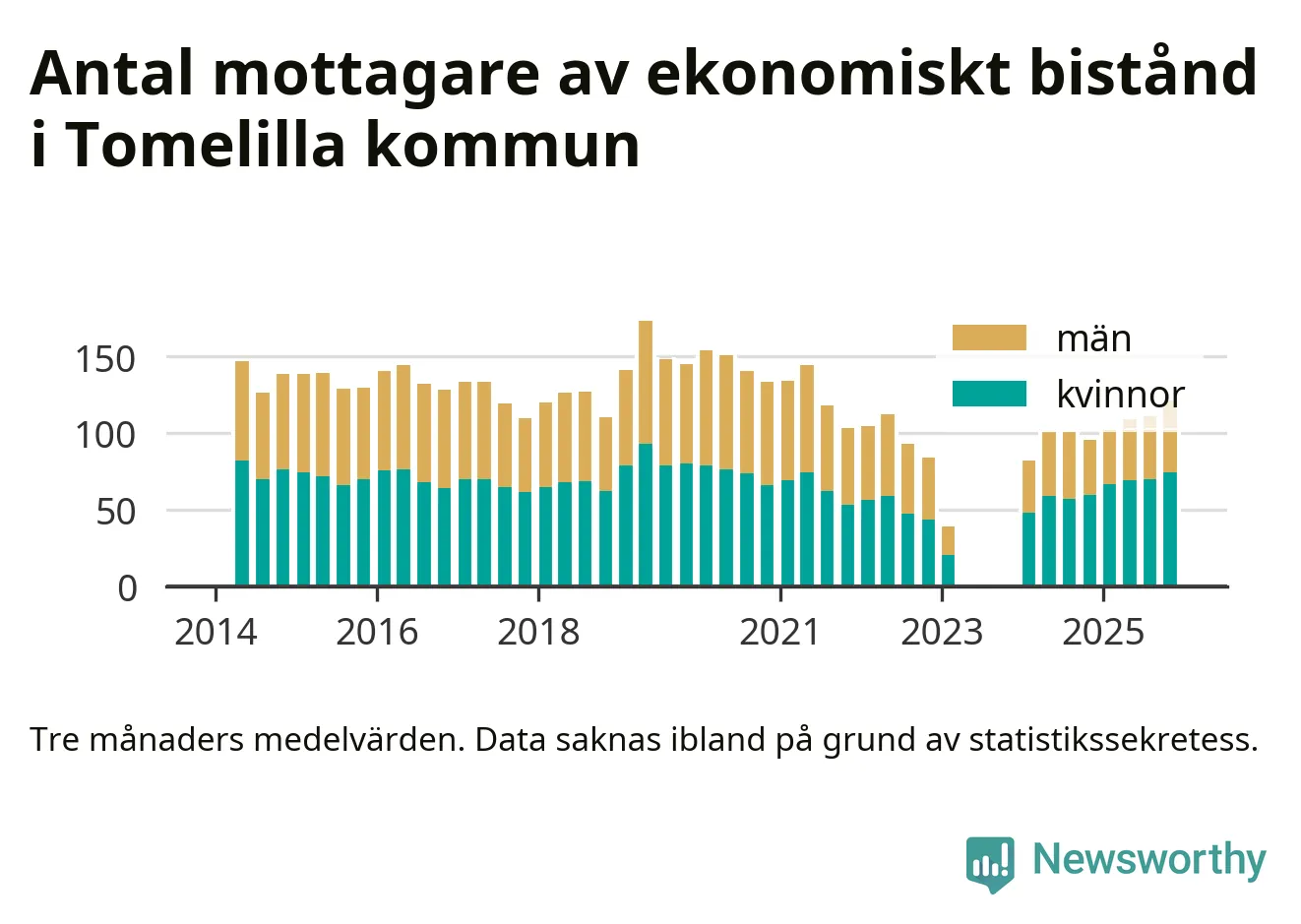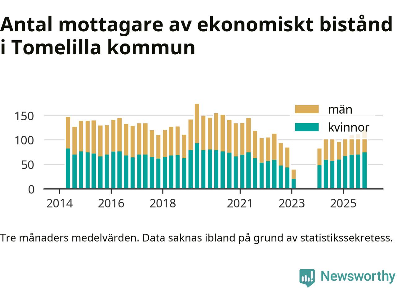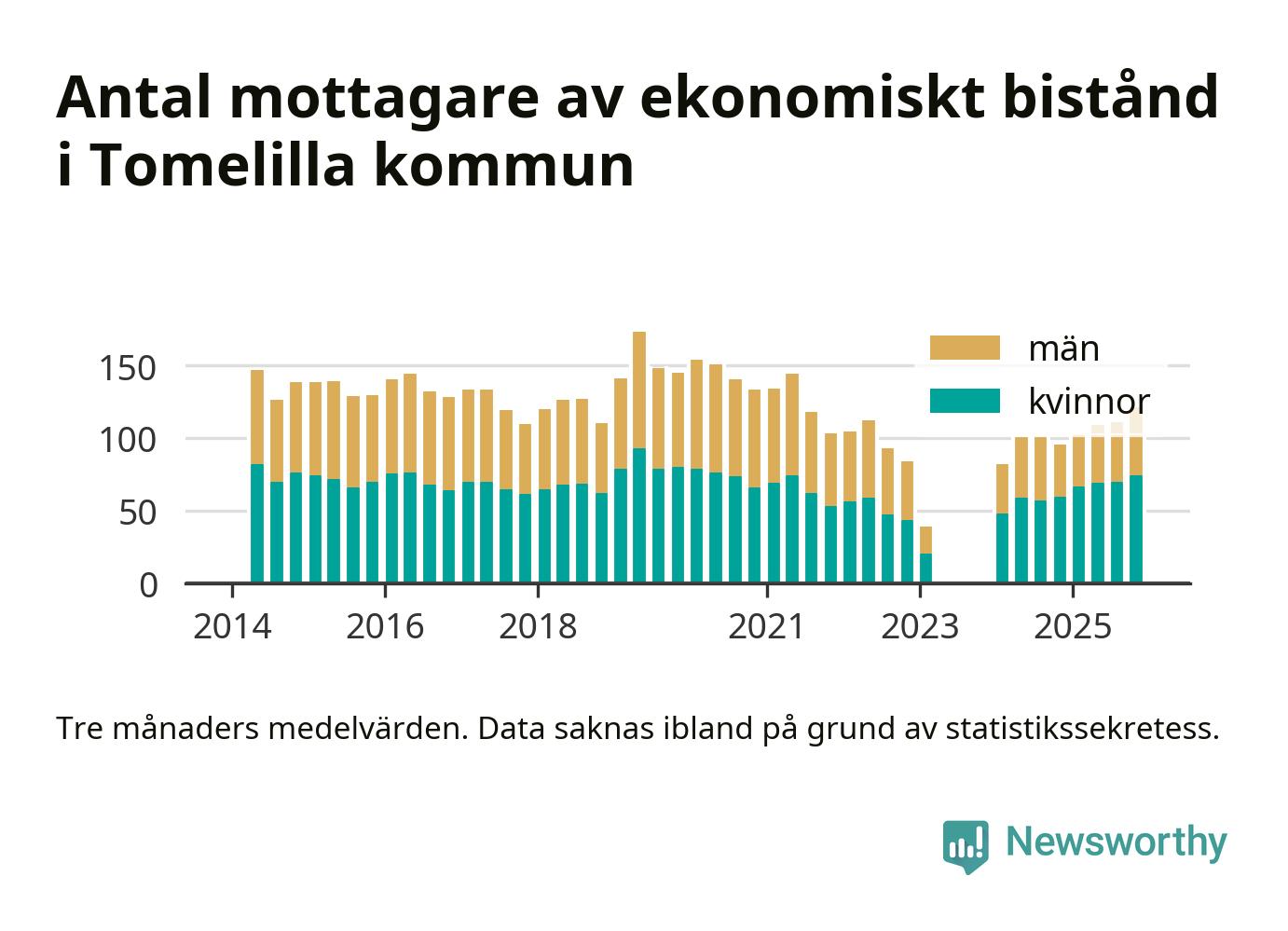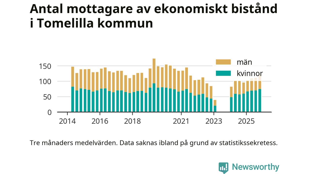I genomsnitt 121 personer per månad fick ekonomiskt bistånd i Tomelilla kommun under höstmånaderna (september till november), vilket motsvarar 0,9 procent av den vuxna befolkningen. Det är marginellt mer än i somras, och något större andel än under hösten för ett år sedan.