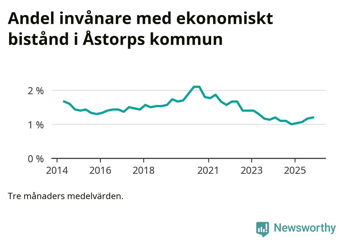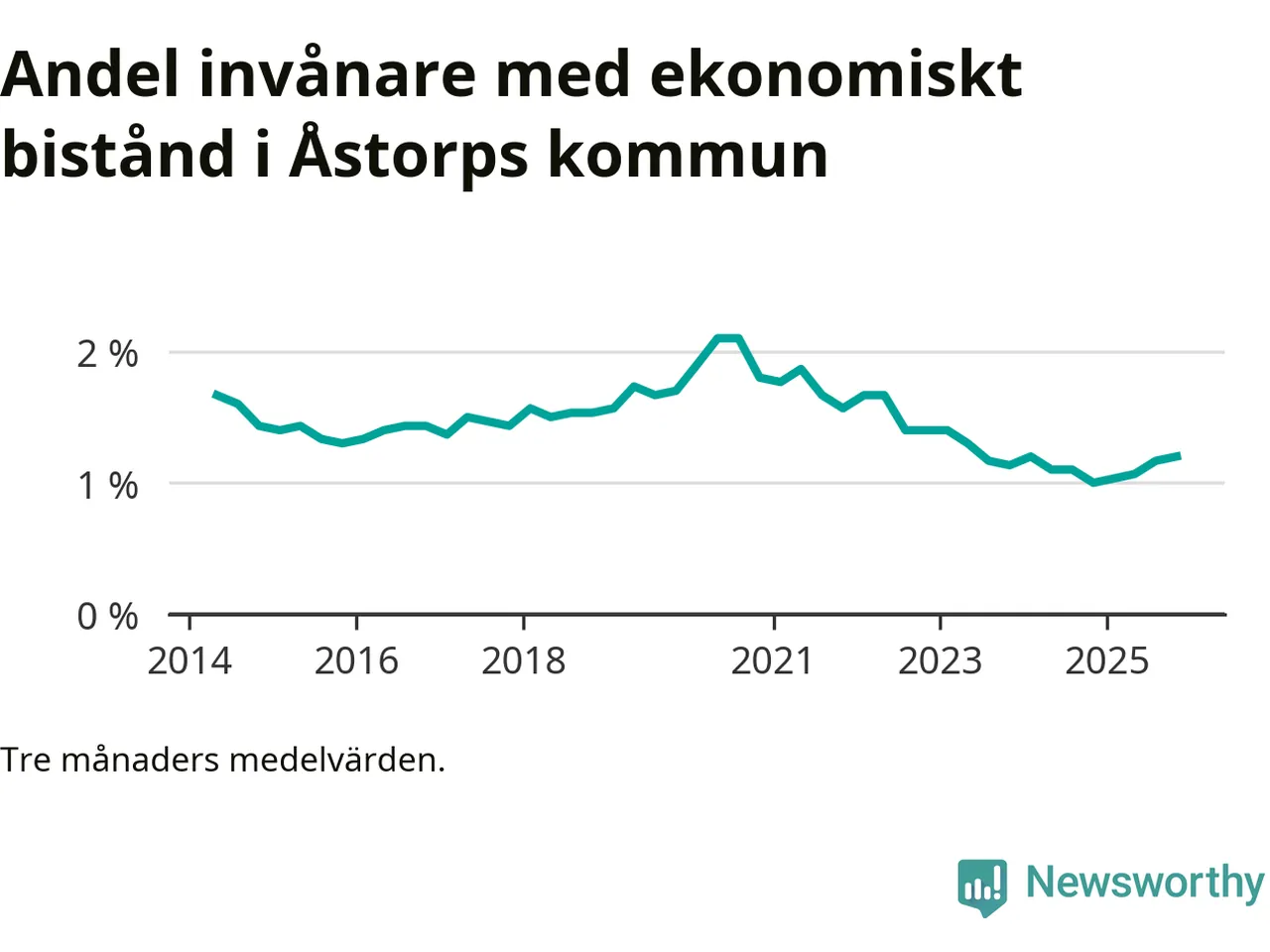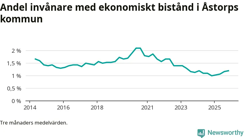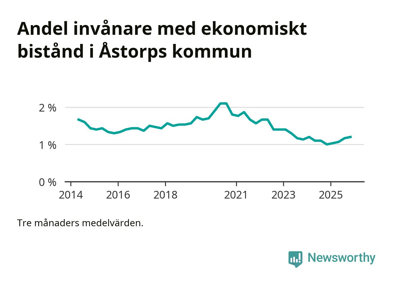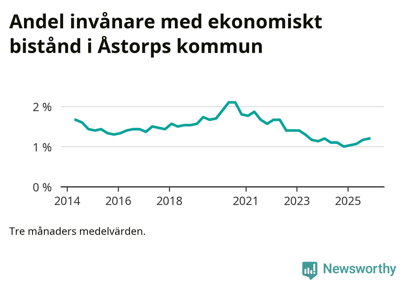 I genomsnitt 197 personer per månad fick ekonomiskt bistånd i Åstorps kommun under höstmånaderna (september till november), vilket motsvarar 1,2 procent av den vuxna befolkningen. Det är marginellt mer än i somras, och något större andel än under hösten för ett år sedan.