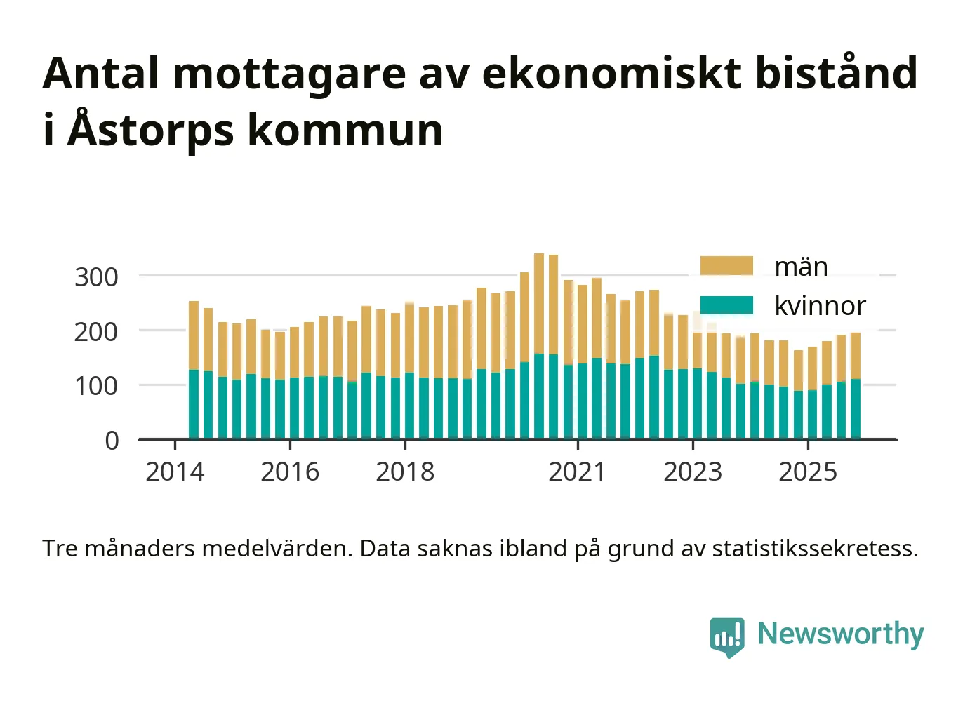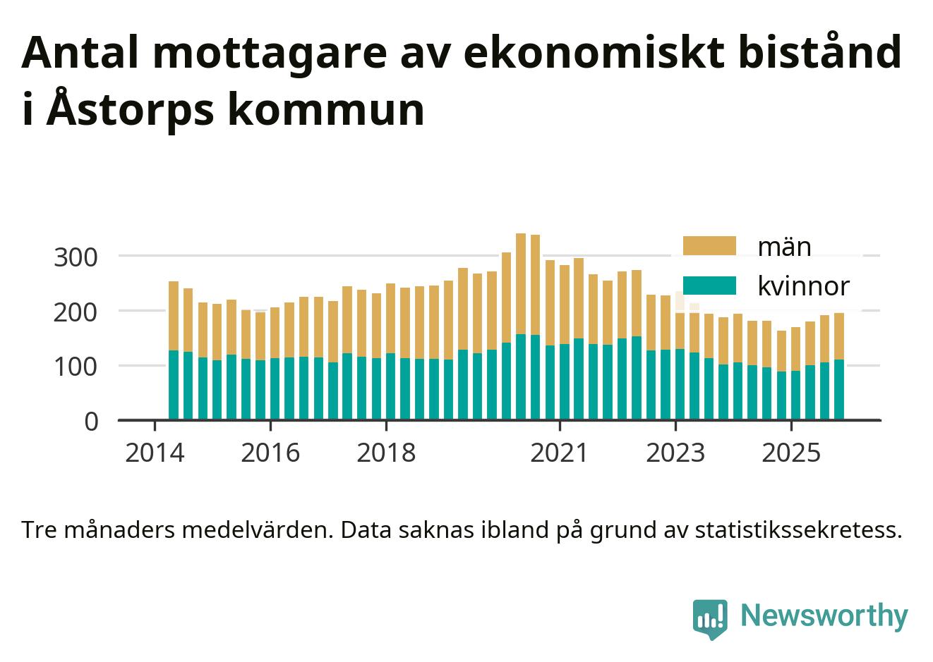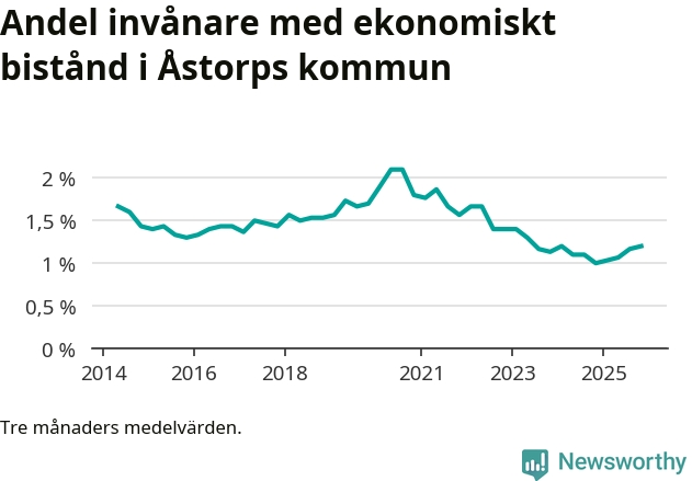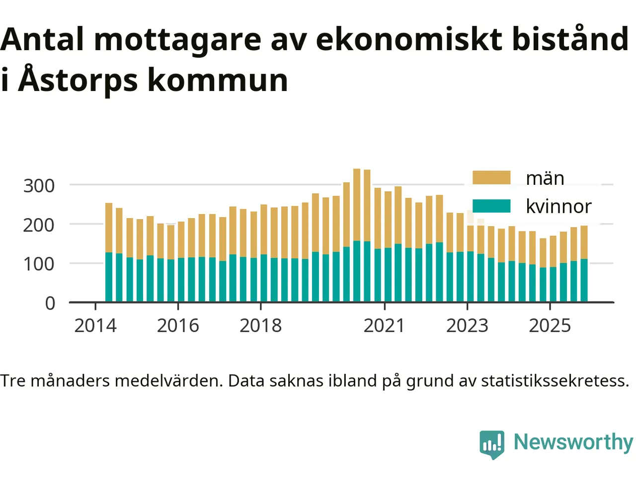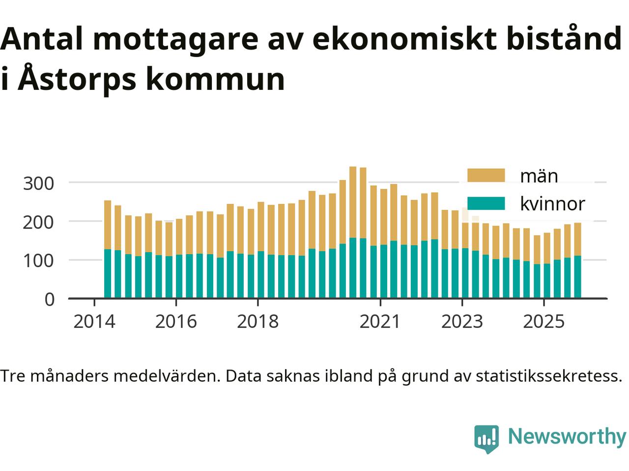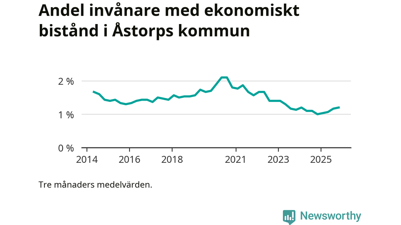 I genomsnitt 197 personer per månad fick ekonomiskt bistånd i Åstorps kommun under höstmånaderna (september till november), vilket motsvarar 1,2 procent av den vuxna befolkningen. Det är marginellt mer än i somras, och något större andel än under hösten för ett år sedan.