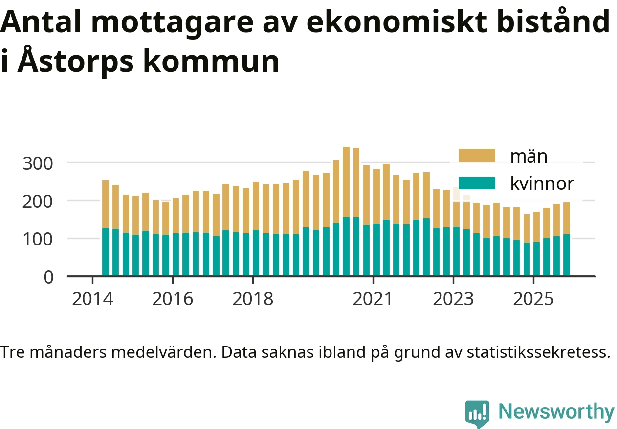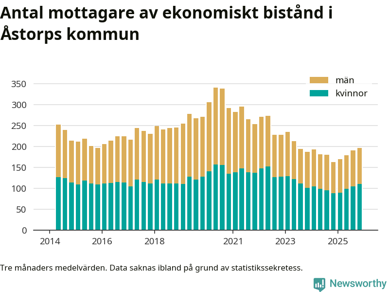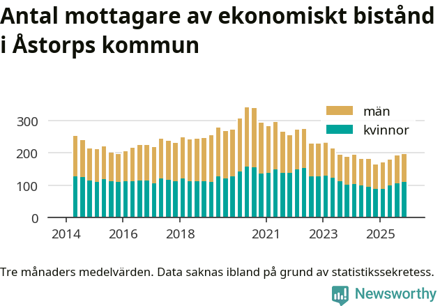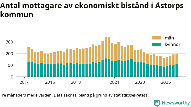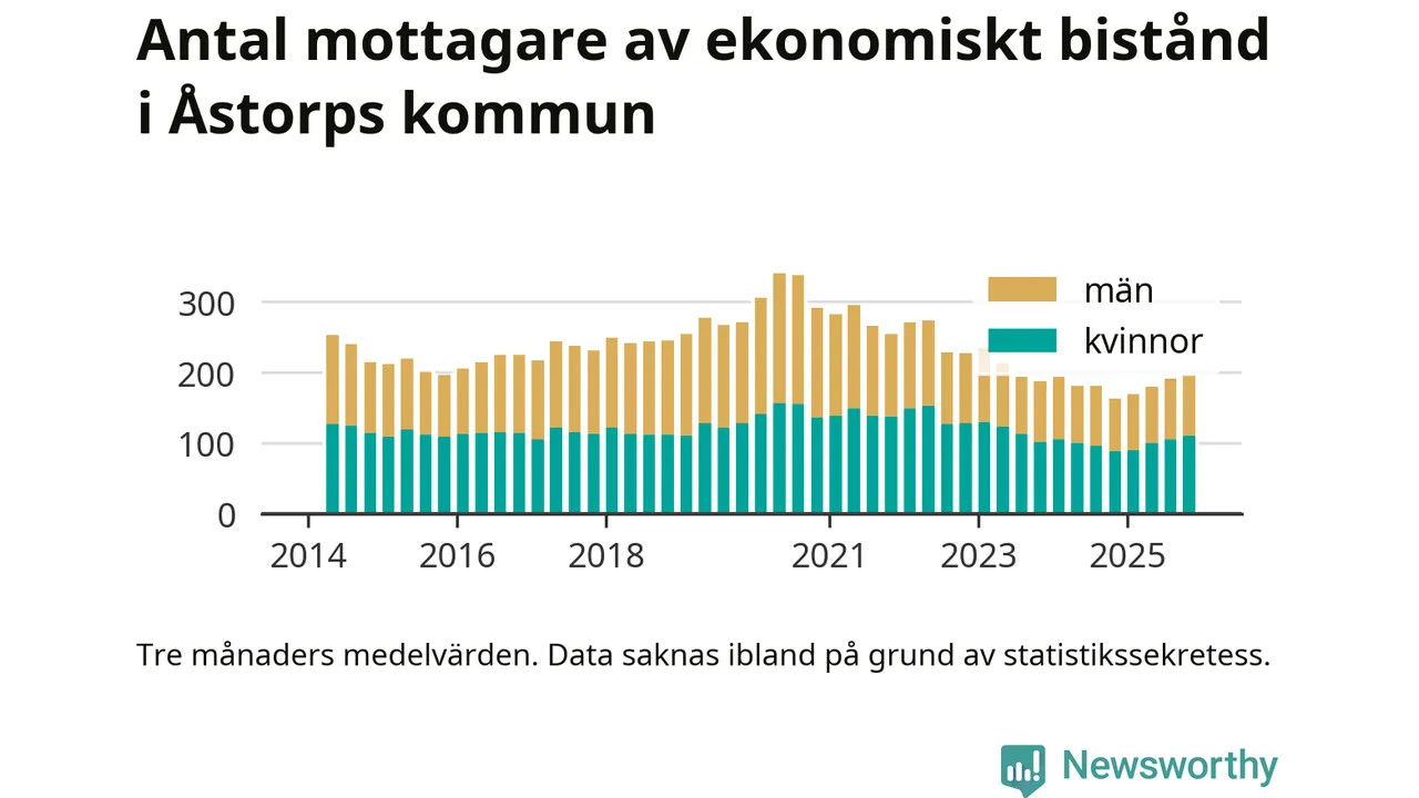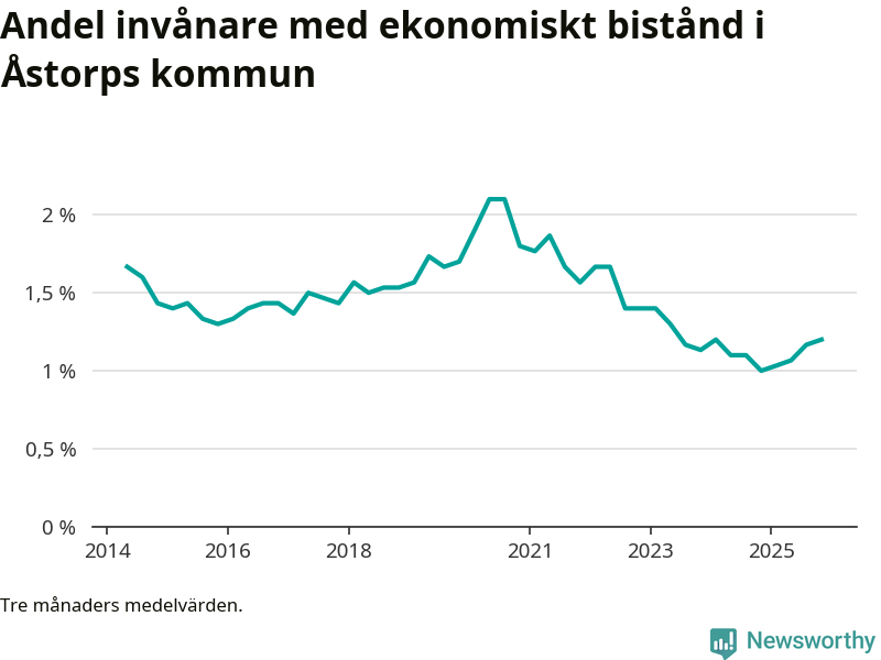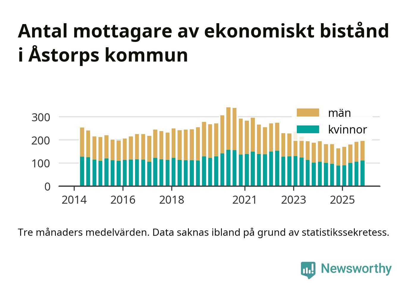 I genomsnitt 197 personer per månad fick ekonomiskt bistånd i Åstorps kommun under höstmånaderna (september till november), vilket motsvarar 1,2 procent av den vuxna befolkningen. Det är marginellt mer än i somras, och något större andel än under hösten för ett år sedan.