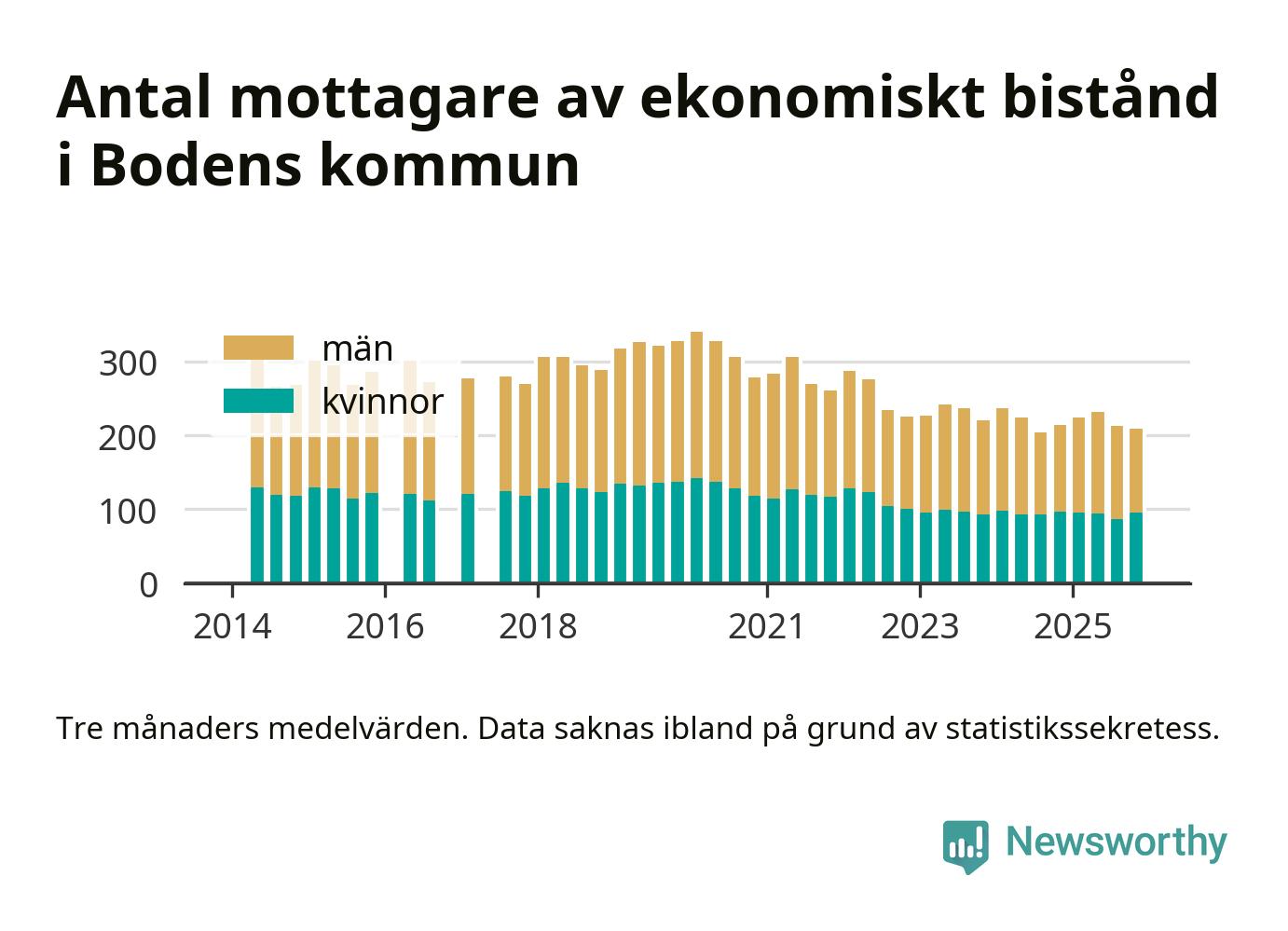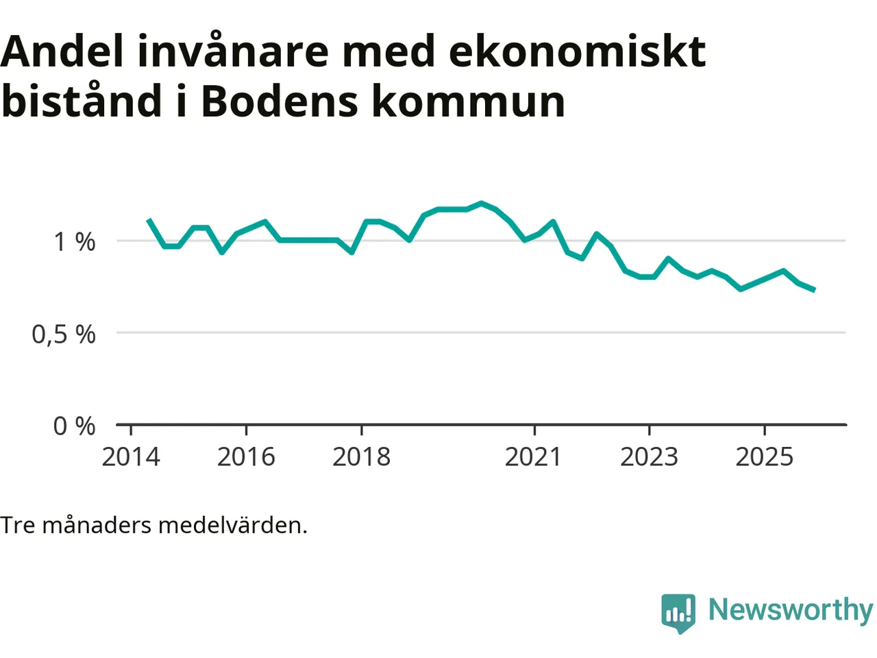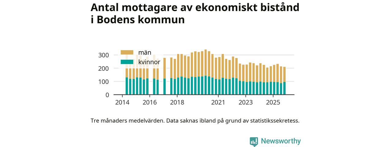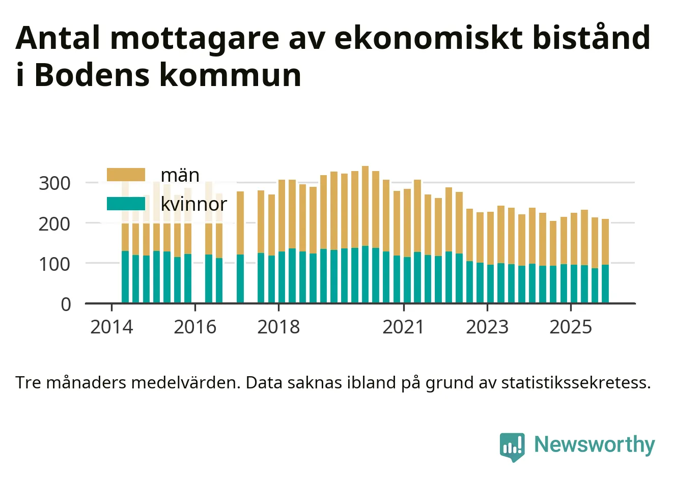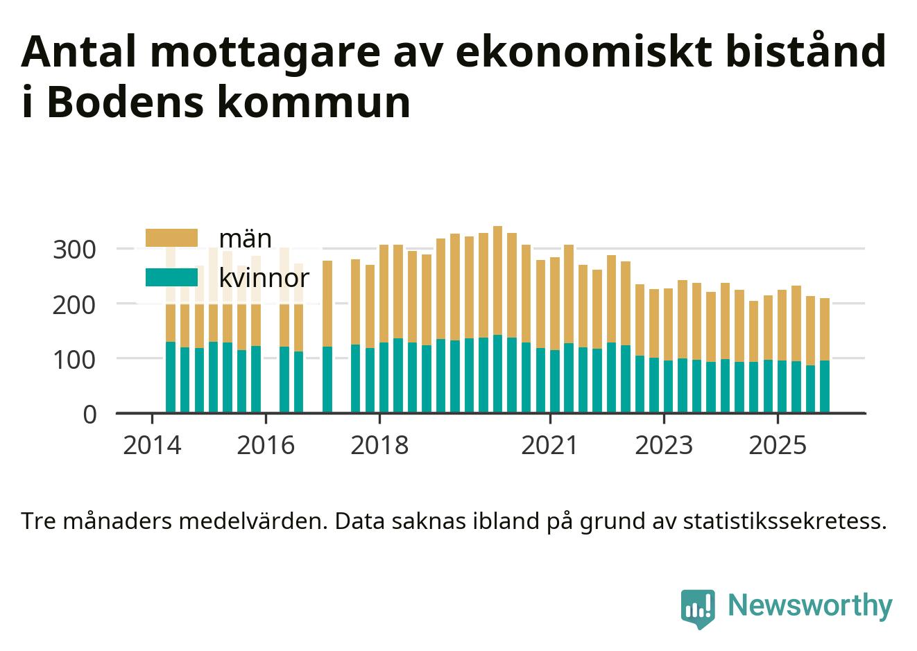 I genomsnitt 209 personer per månad fick ekonomiskt bistånd i Bodens kommun
