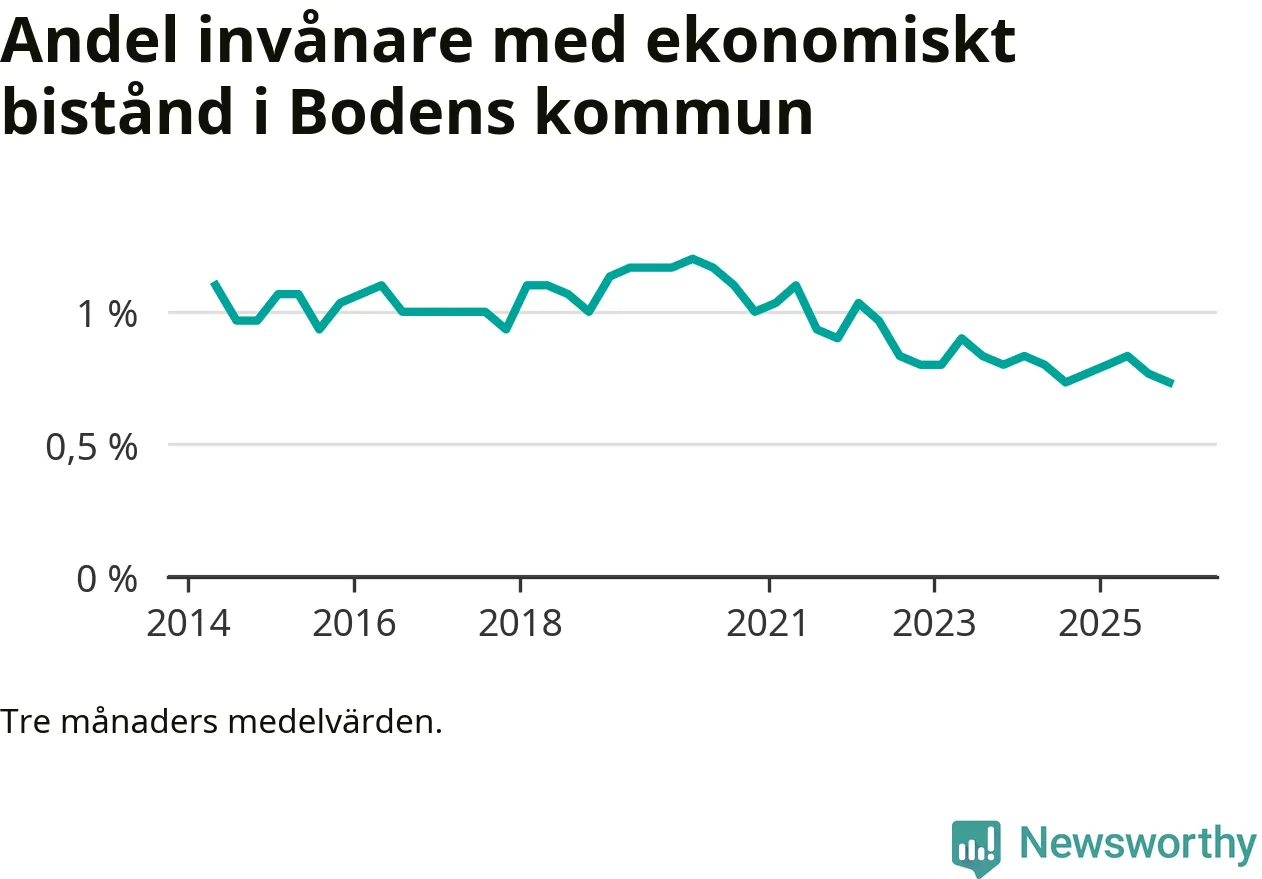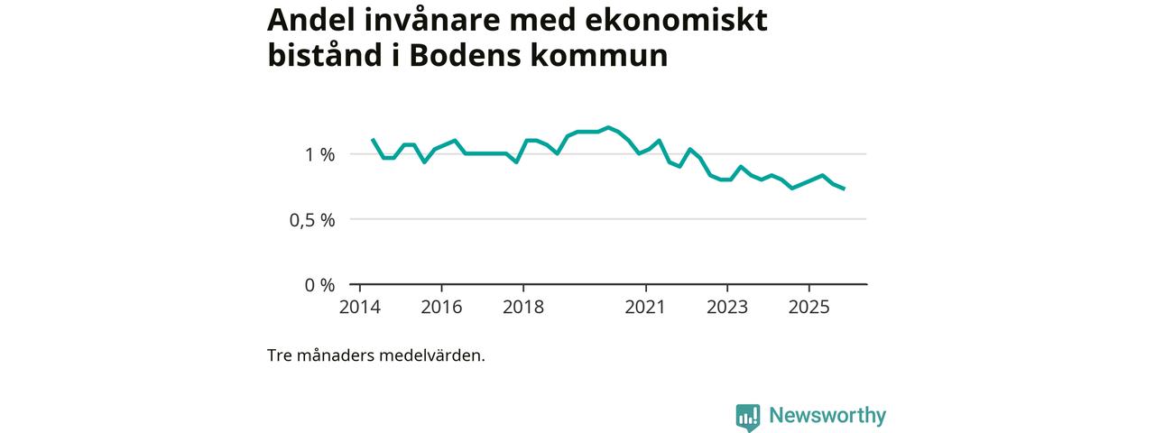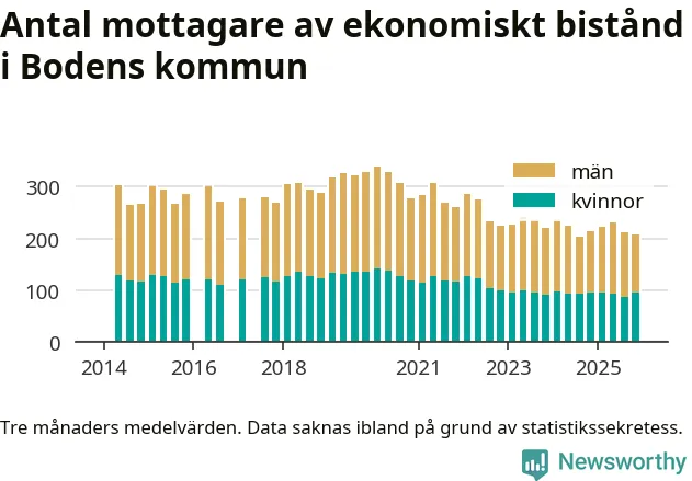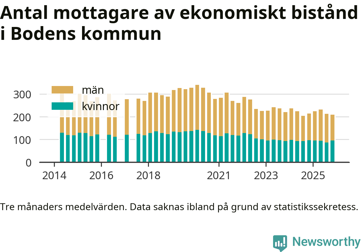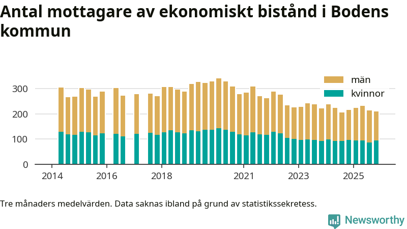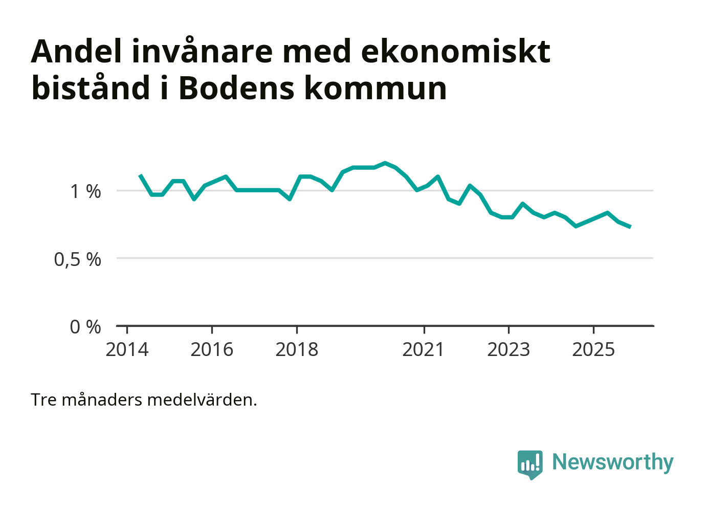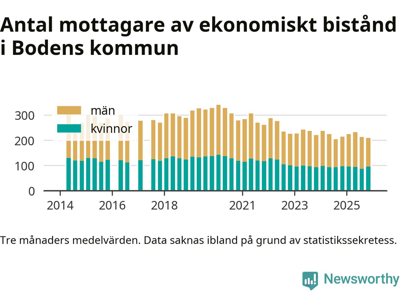 I genomsnitt 209 personer per månad fick ekonomiskt bistånd i Bodens kommun