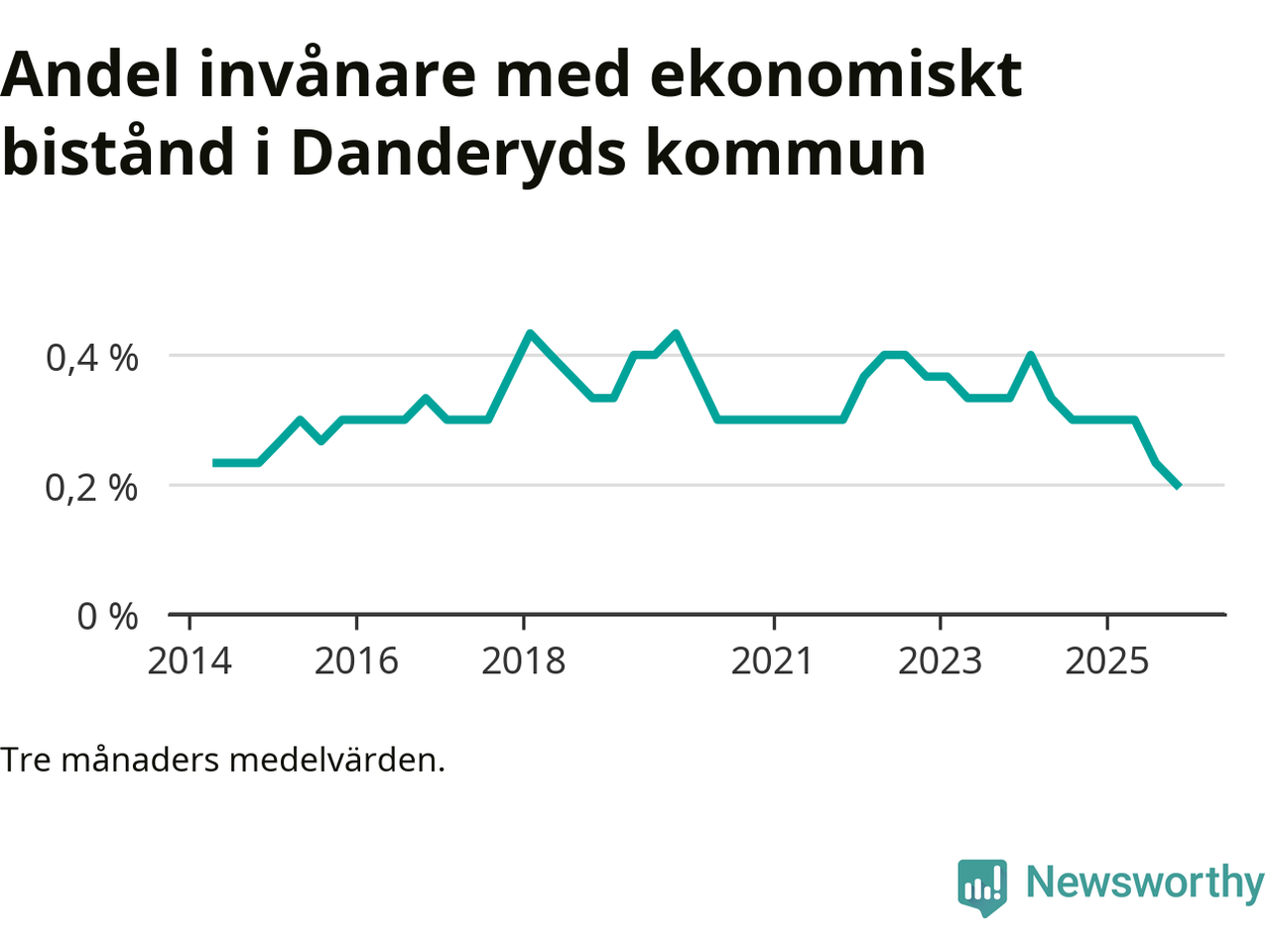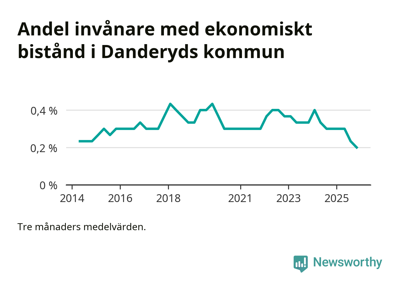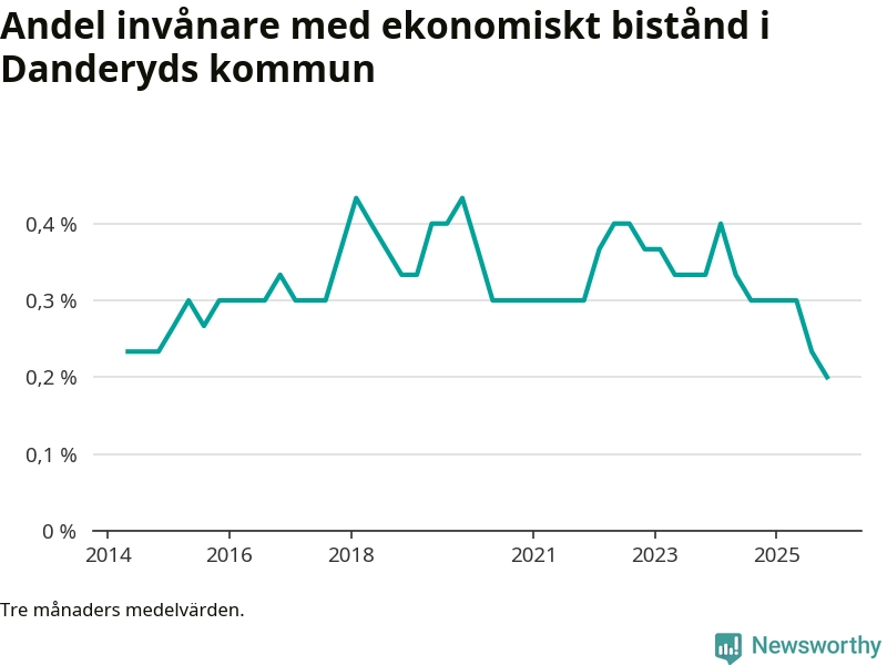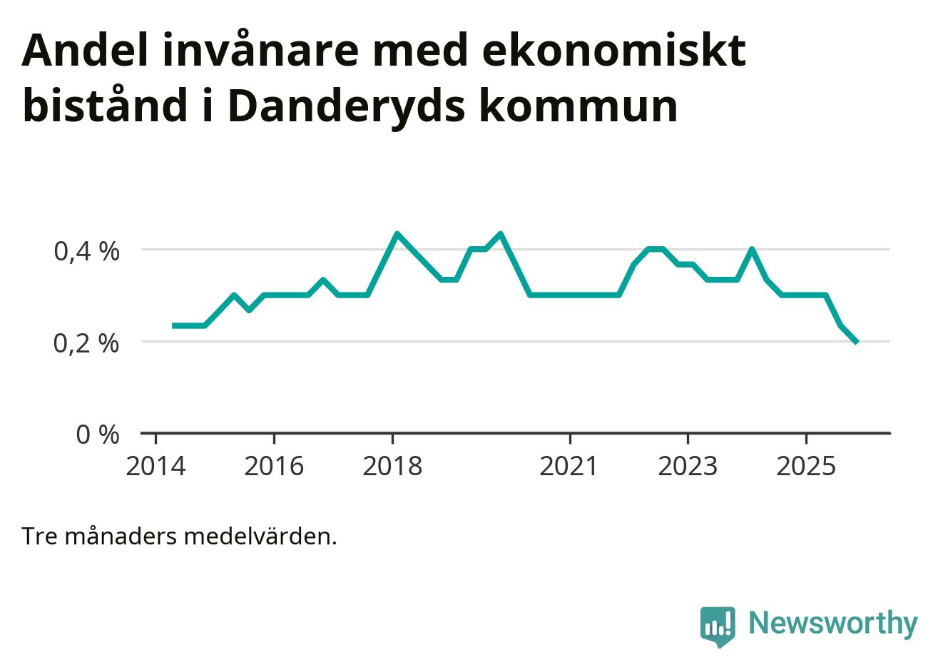 Höstens 0,2 procent är den lägsta andelen biståndstagare i kommunen under någon tremånadersperiod sedan åtminstone 2014, vilket är så långt tillbaka Socialstyrelsens statistik sträcker sig.