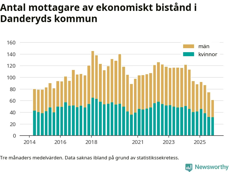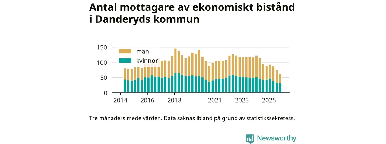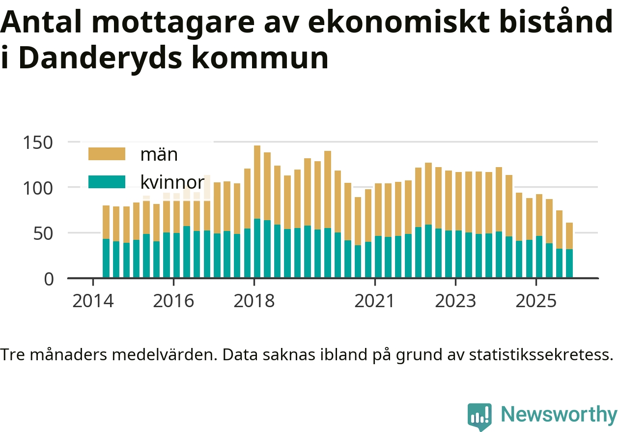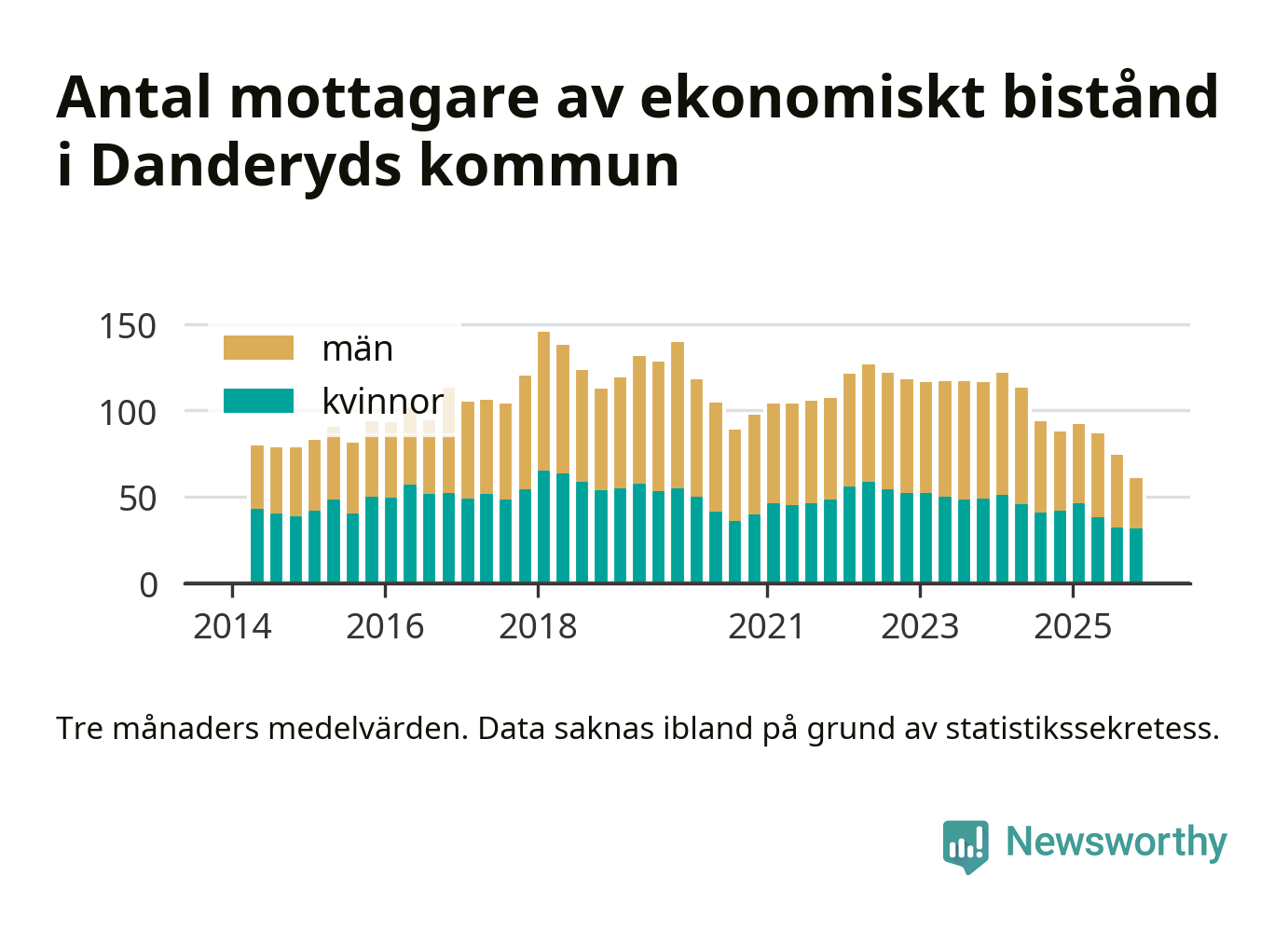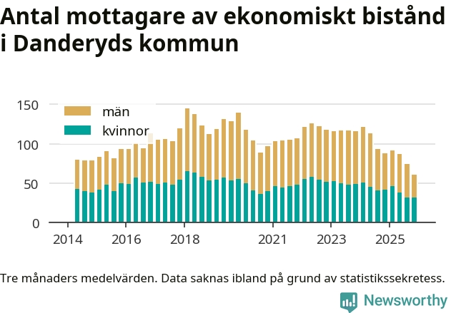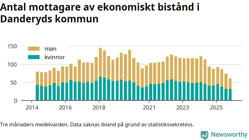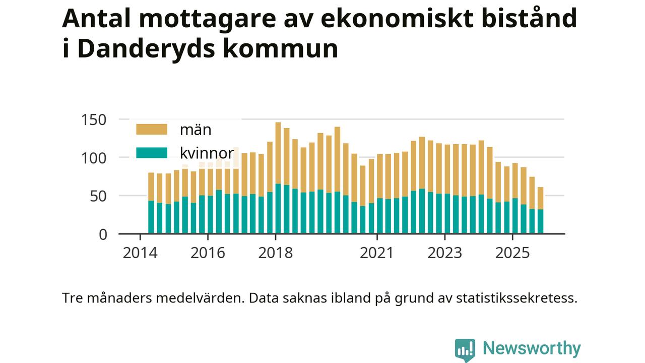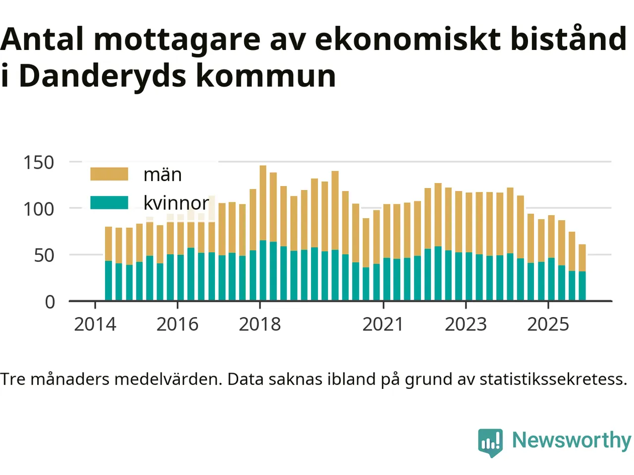 I genomsnitt 61 personer per månad fick ekonomiskt bistånd i Danderyds kommun under höstmånaderna (september till november), vilket motsvarar 0,2 procent av den vuxna befolkningen. Det är marginellt mindre än i somras, och något mindre andel än under hösten för ett år sedan.