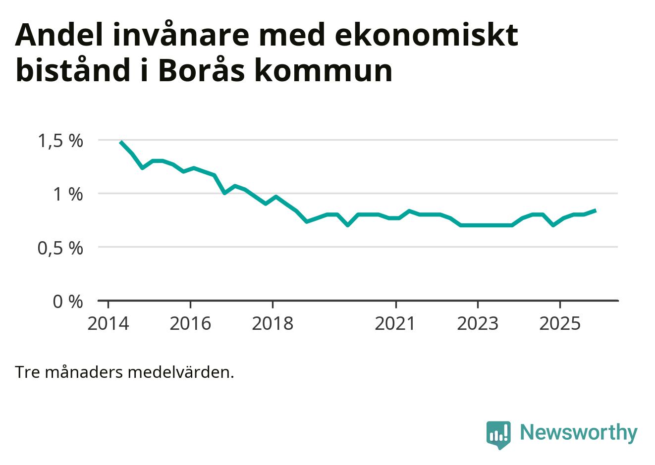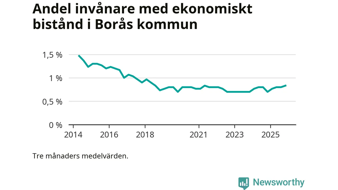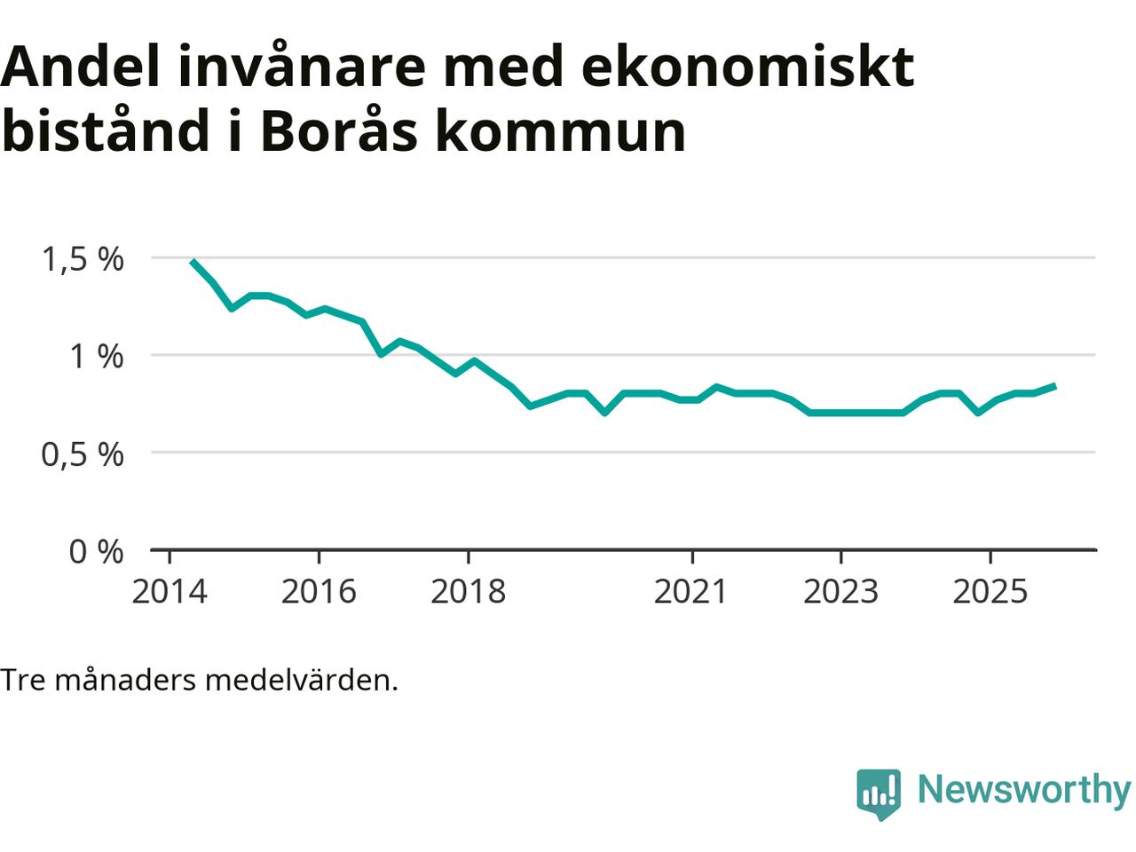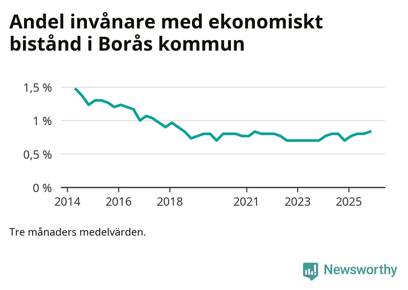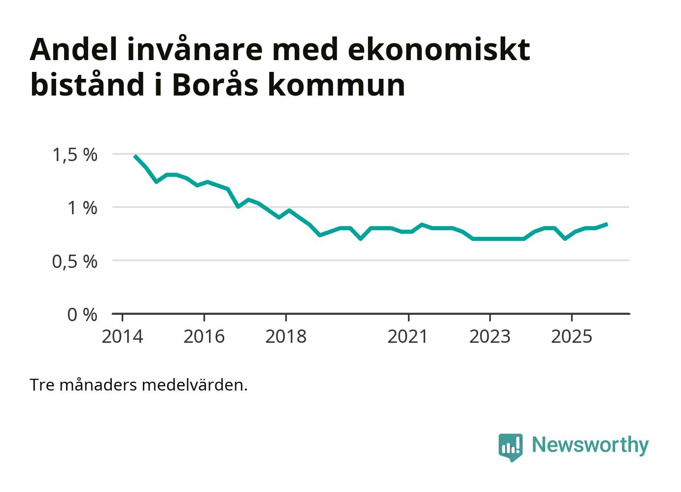 I genomsnitt 969 personer per månad fick ekonomiskt bistånd i Borås kommun under höstmånaderna (september till november), vilket motsvarar 0,8 procent av den vuxna befolkningen. Det är marginellt mer än i somras, och något större andel än under hösten för ett år sedan.