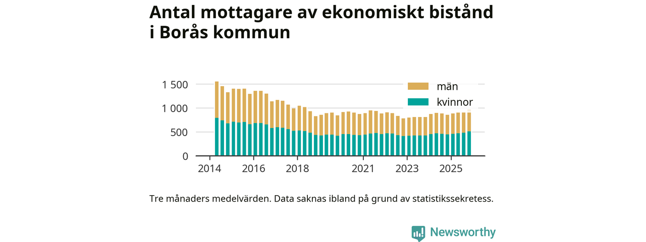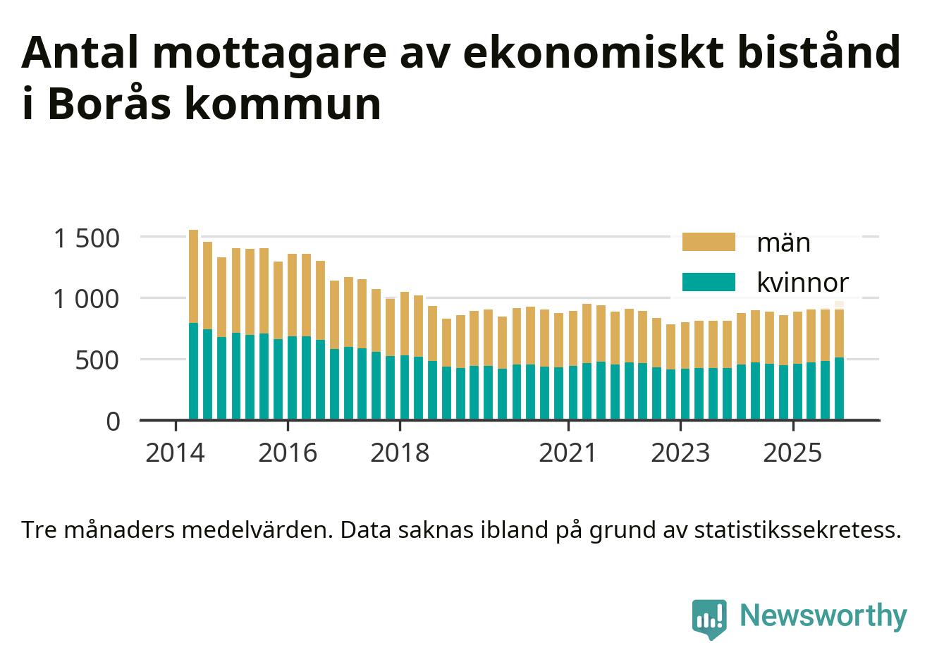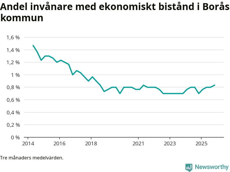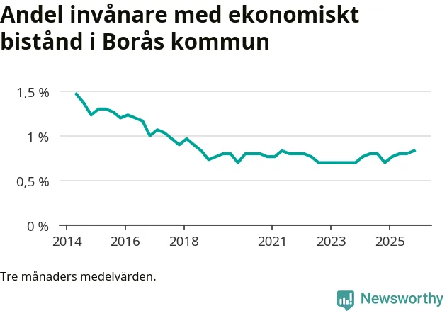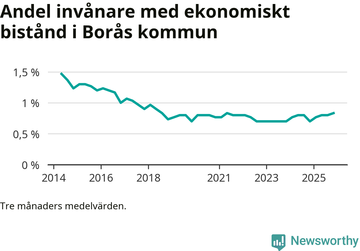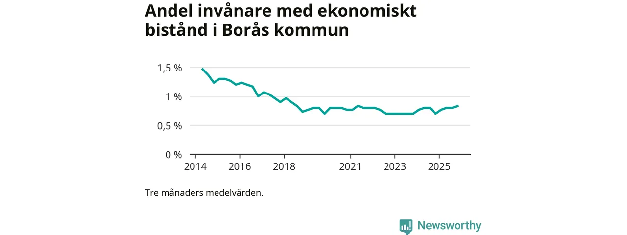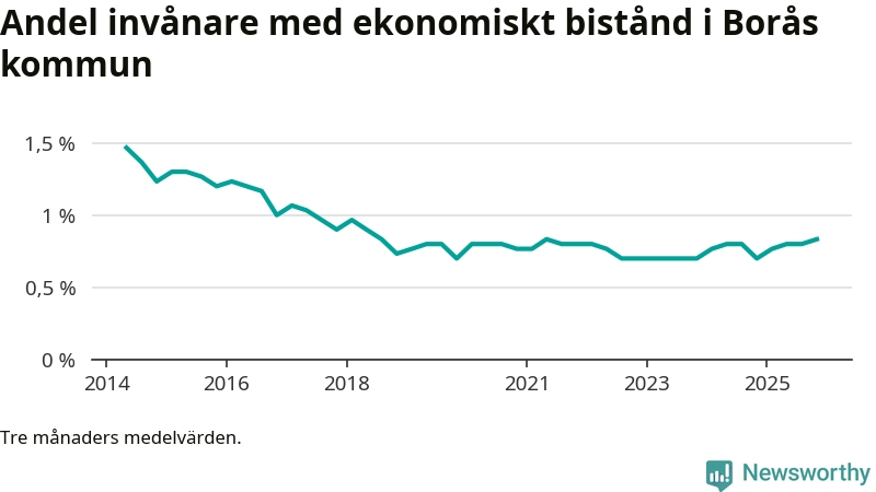 I genomsnitt 969 personer per månad fick ekonomiskt bistånd i Borås kommun under höstmånaderna (september till november), vilket motsvarar 0,8 procent av den vuxna befolkningen. Det är marginellt mer än i somras, och något större andel än under hösten för ett år sedan.