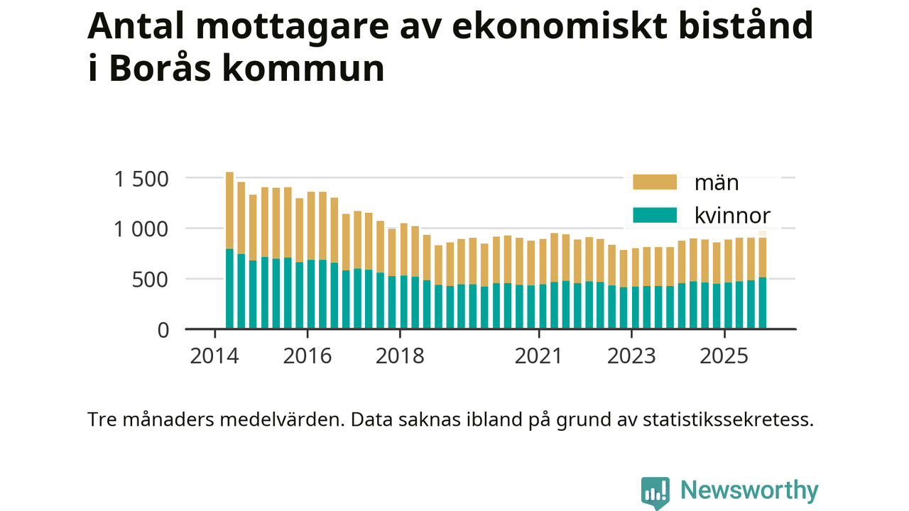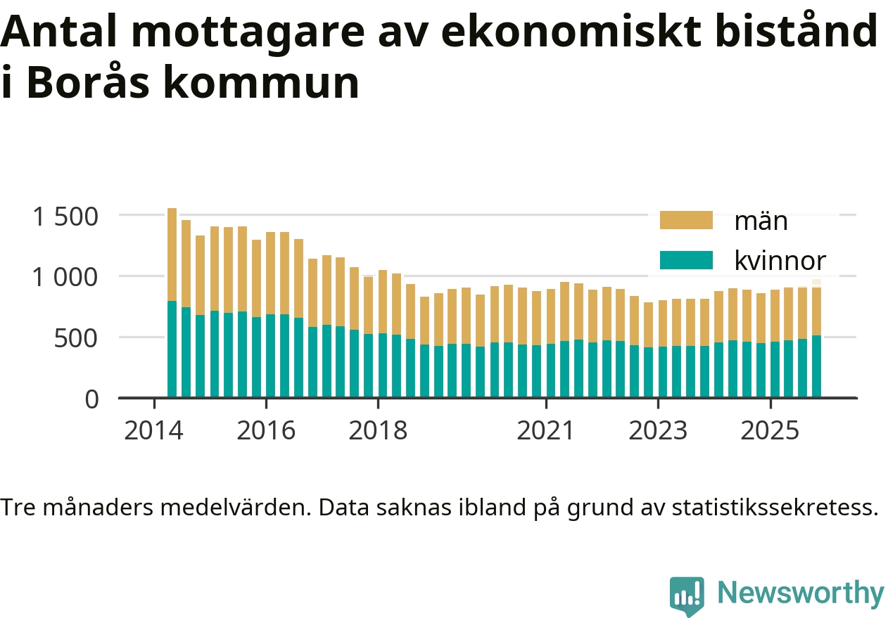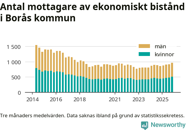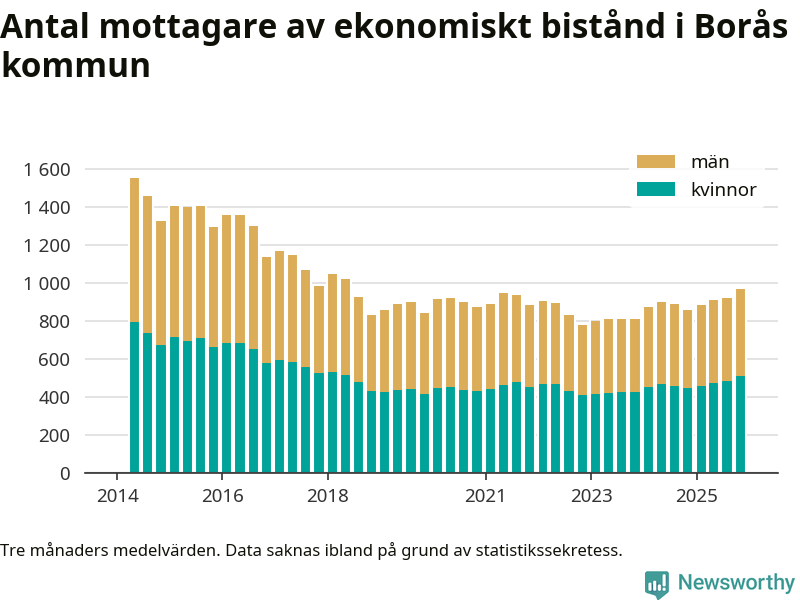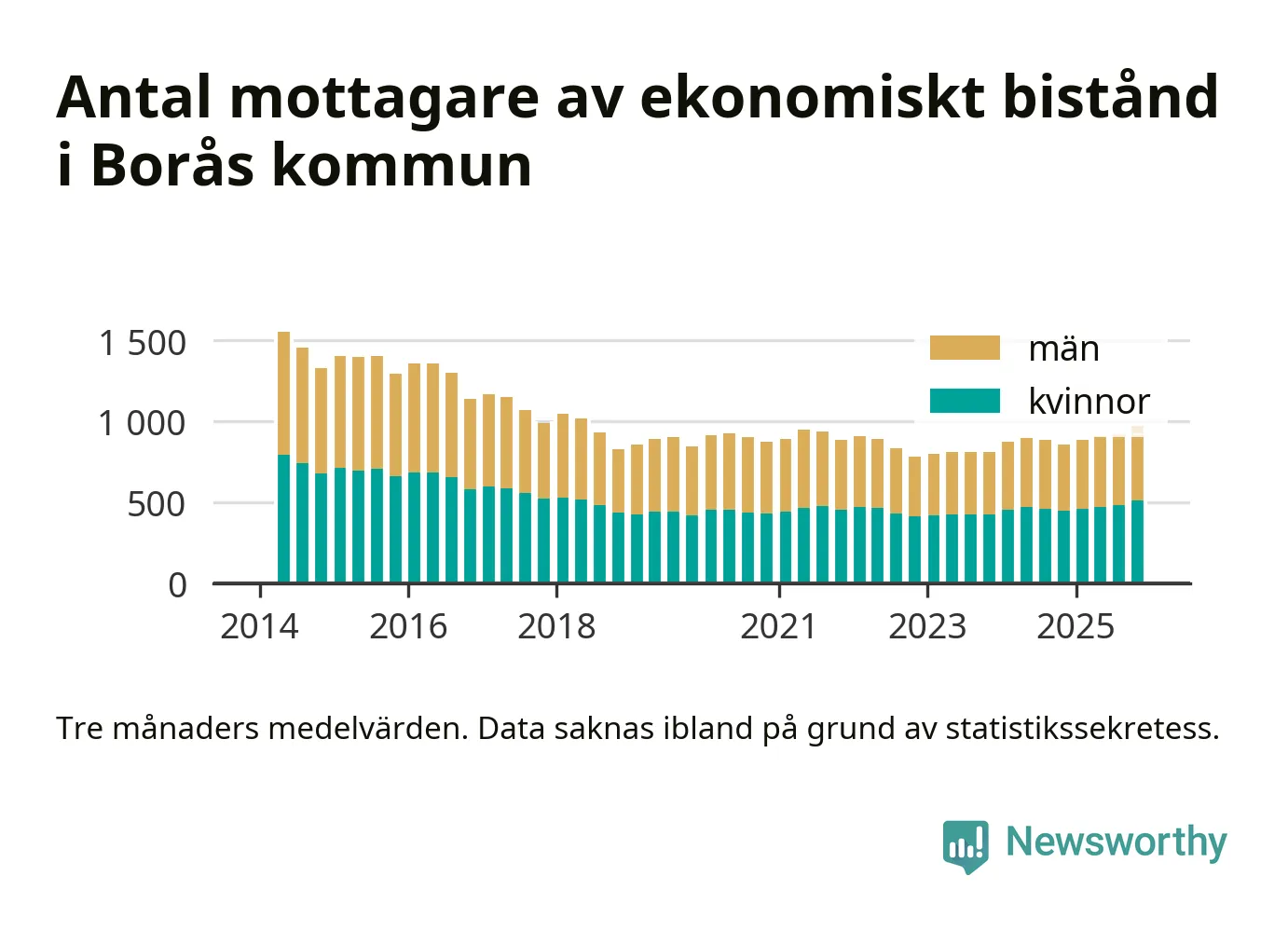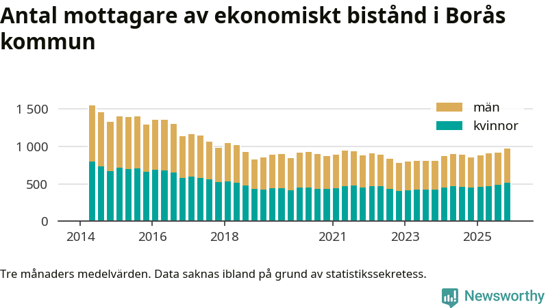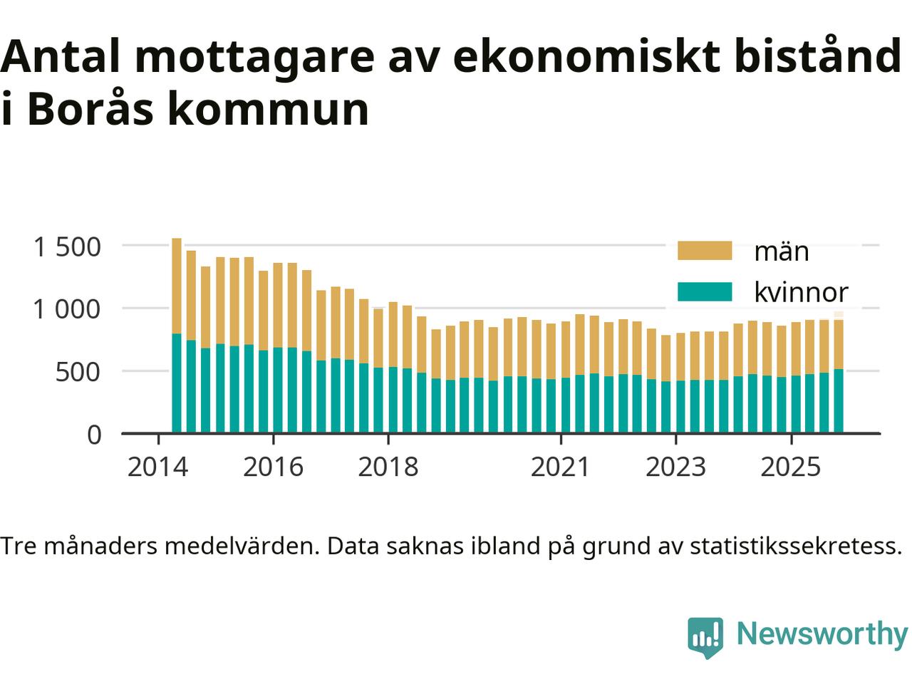 I genomsnitt 969 personer per månad fick ekonomiskt bistånd i Borås kommun under höstmånaderna (september till november), vilket motsvarar 0,8 procent av den vuxna befolkningen. Det är marginellt mer än i somras, och något större andel än under hösten för ett år sedan.