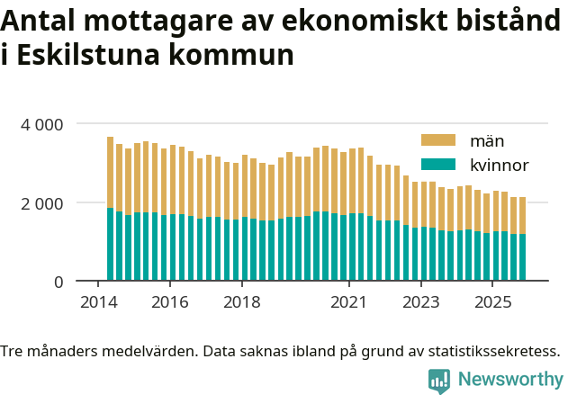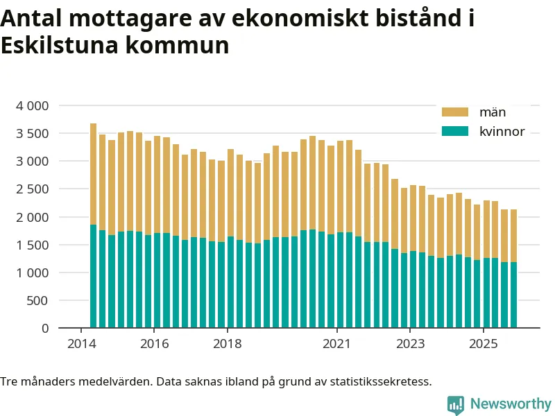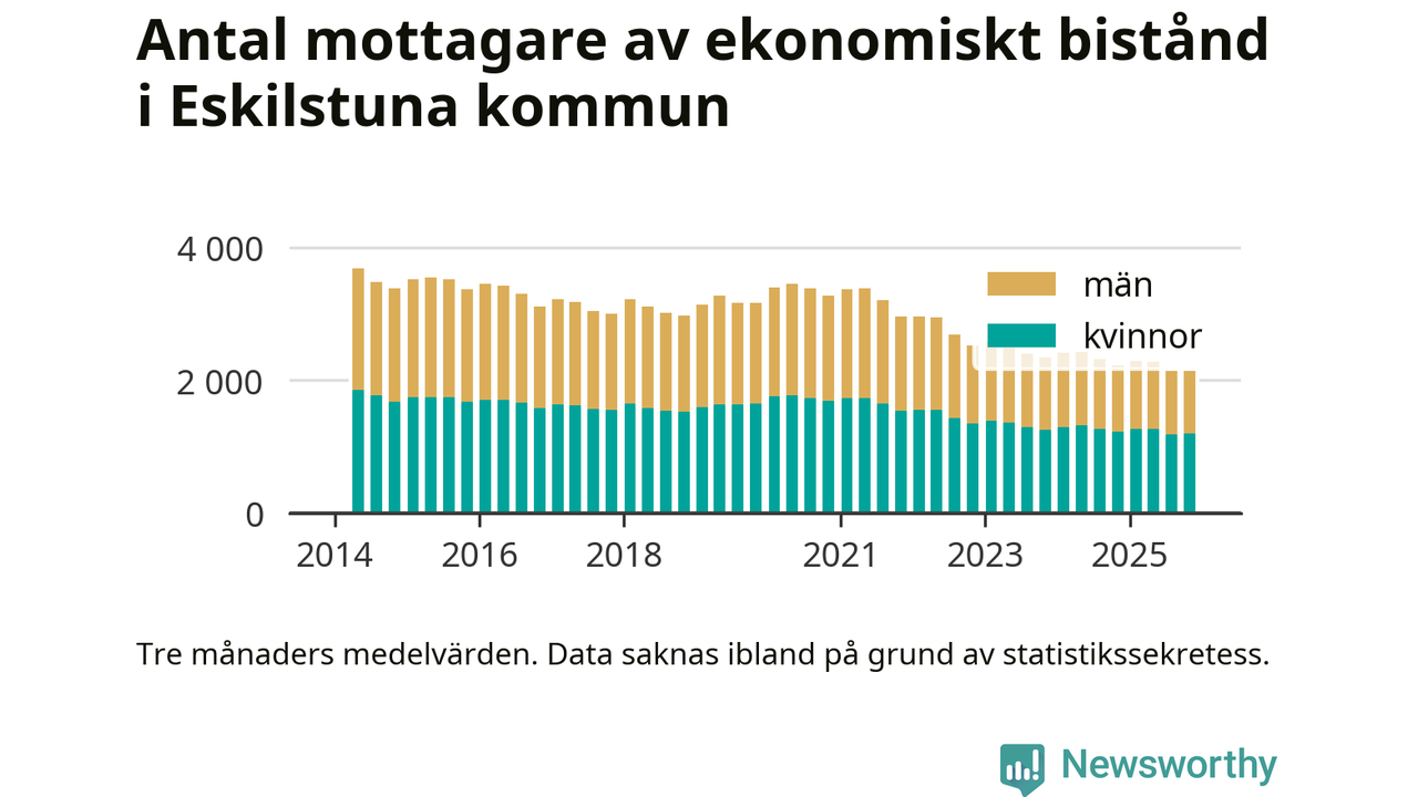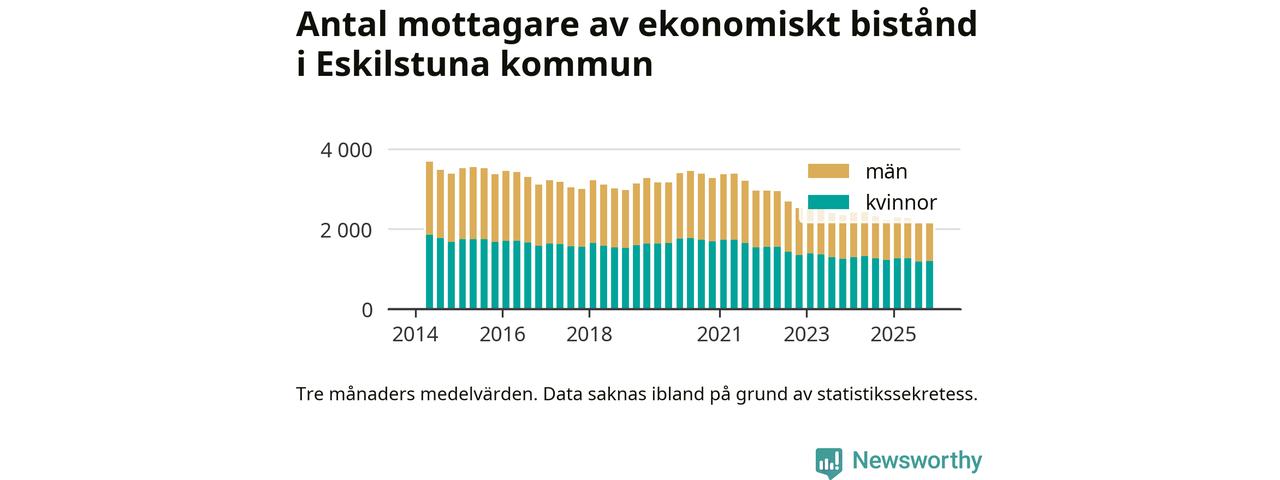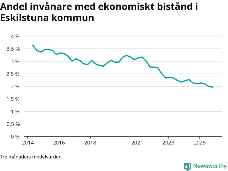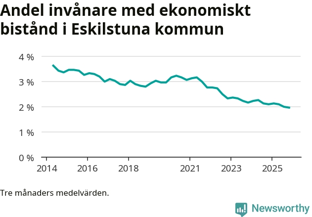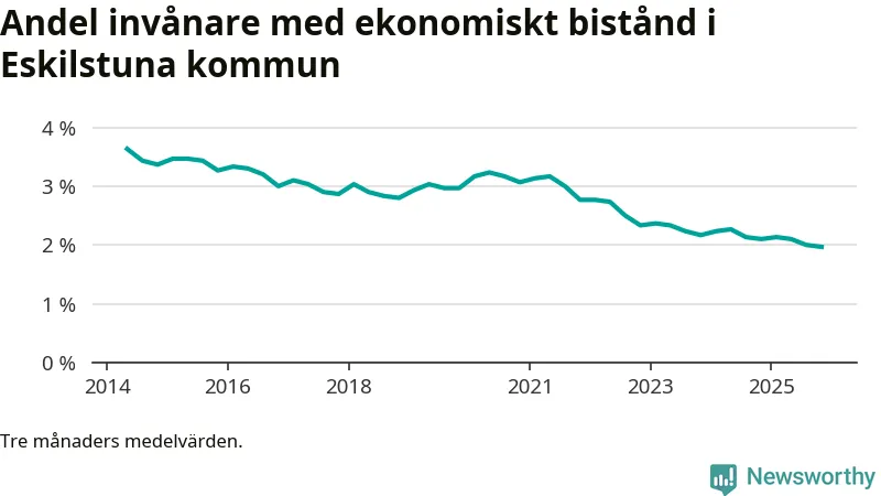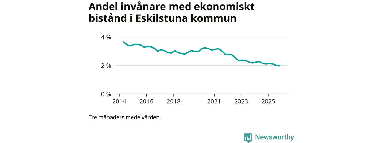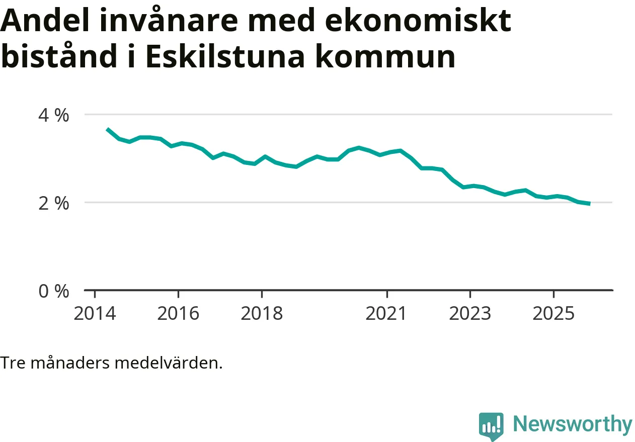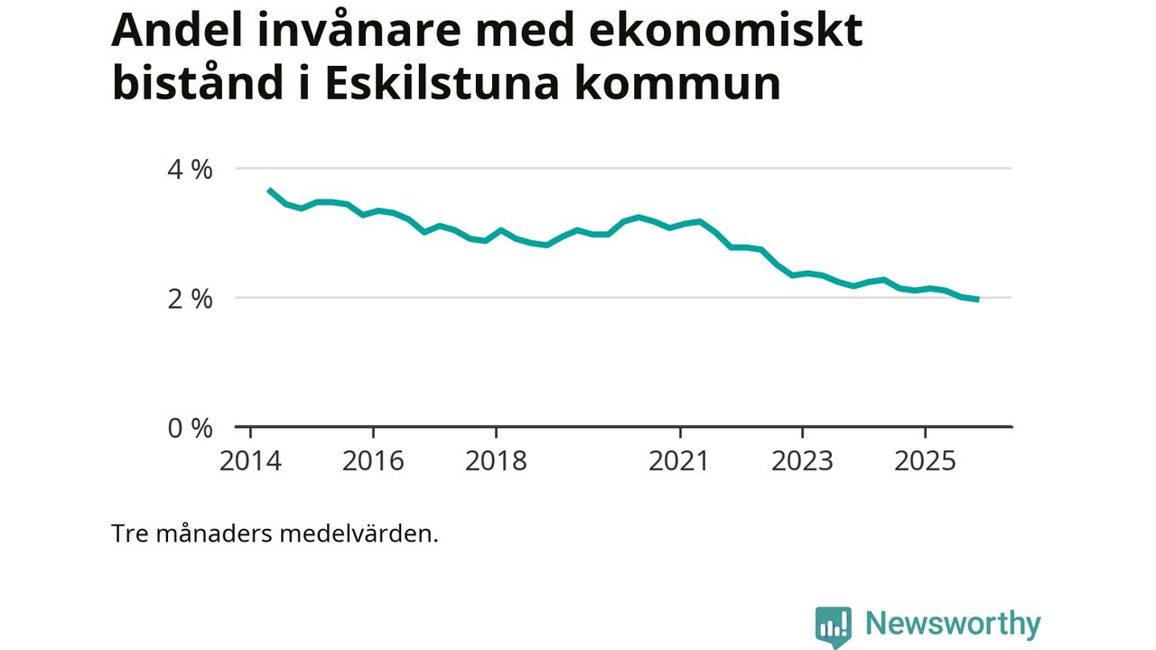 Andelen invånare med ekonomiskt bistånd i Eskilstuna kommun var under hösten den lägsta sedan åtminstone 2014. Det visar den senaste, preliminära statistiken från Socialstyrelsen.
