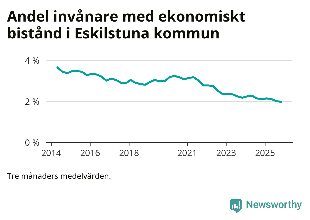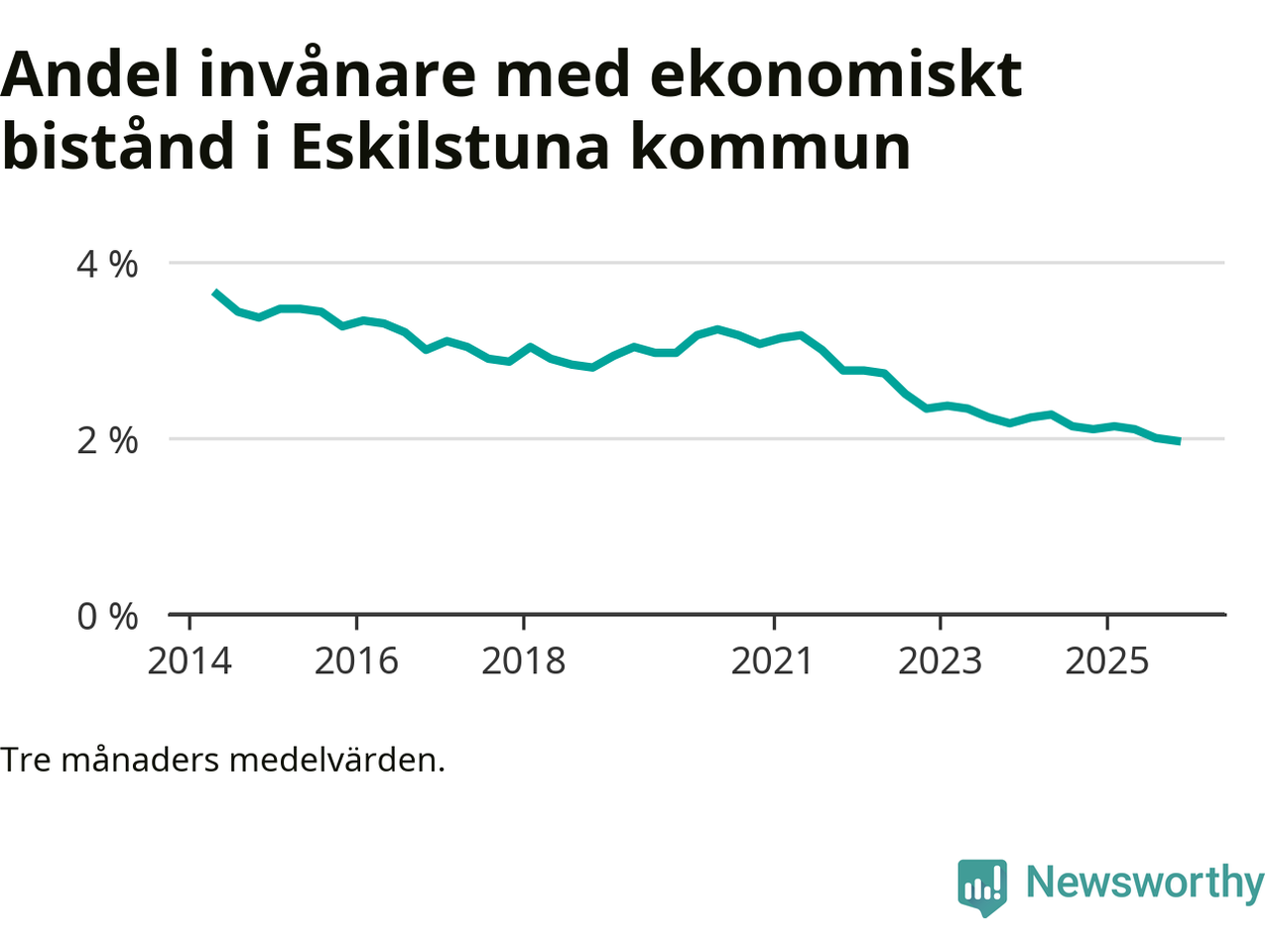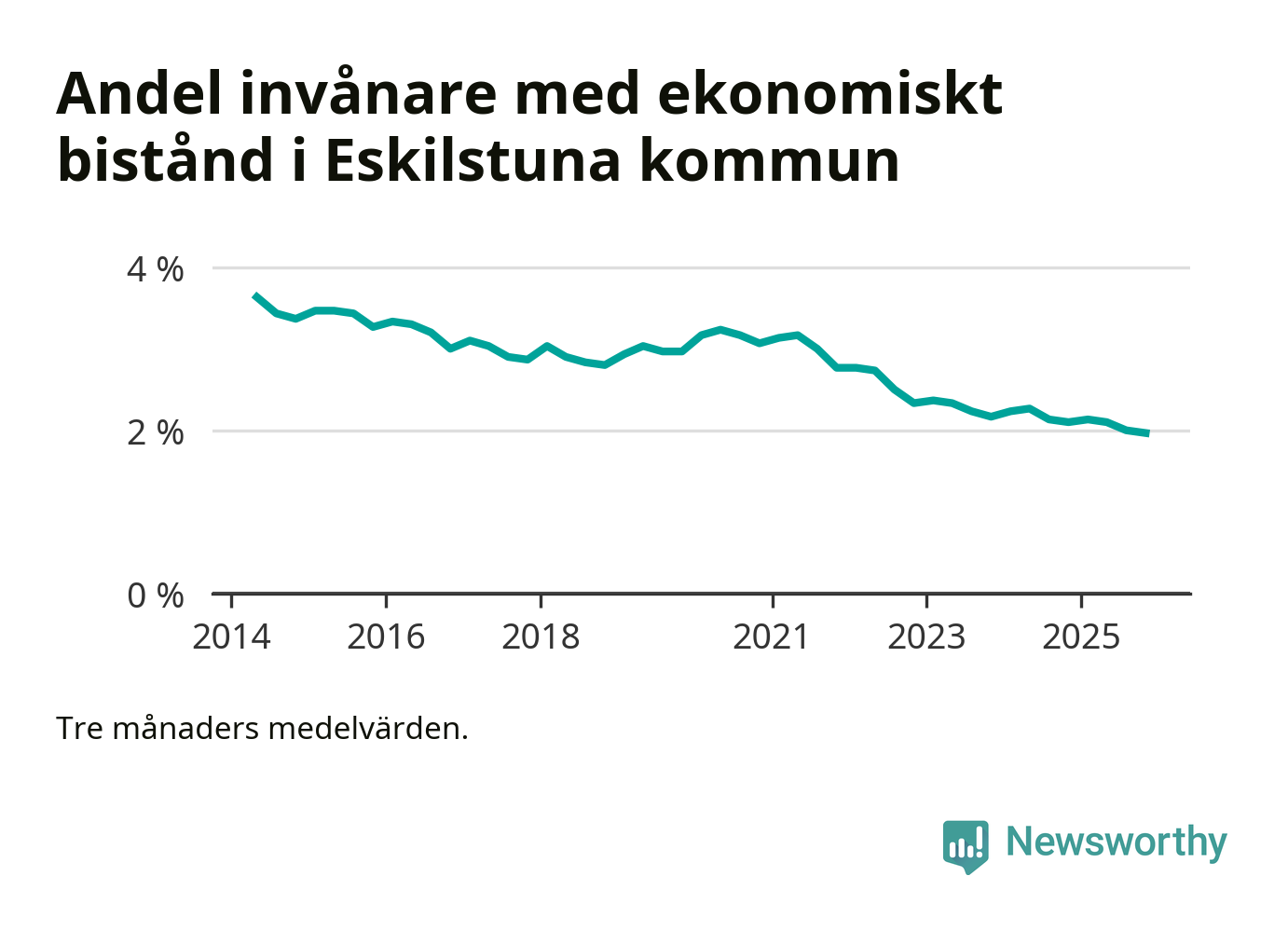 Höstens 2 procent är den lägsta andelen biståndstagare i kommunen under någon tremånadersperiod sedan åtminstone 2014, vilket är så långt tillbaka Socialstyrelsens statistik sträcker sig.