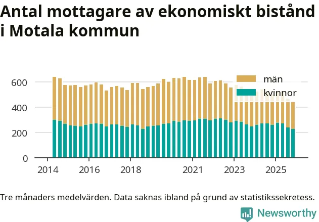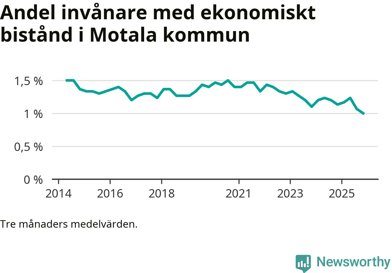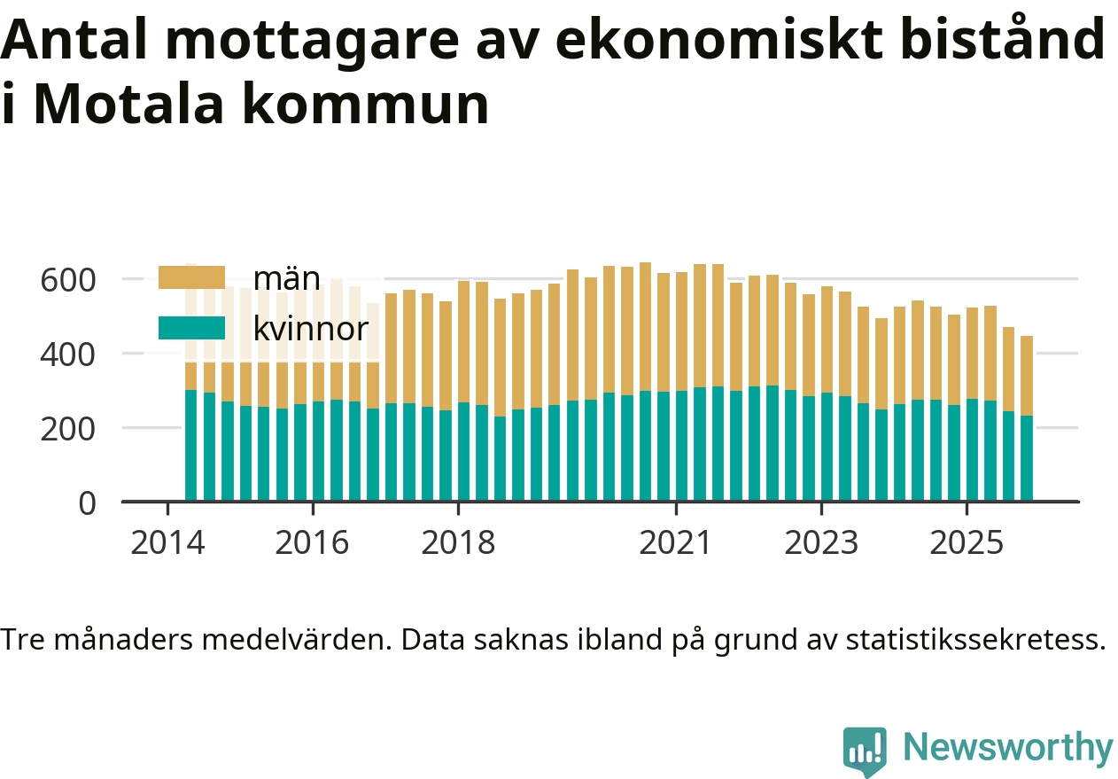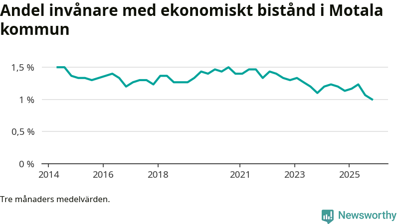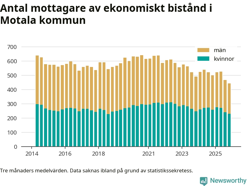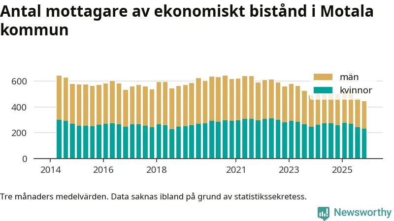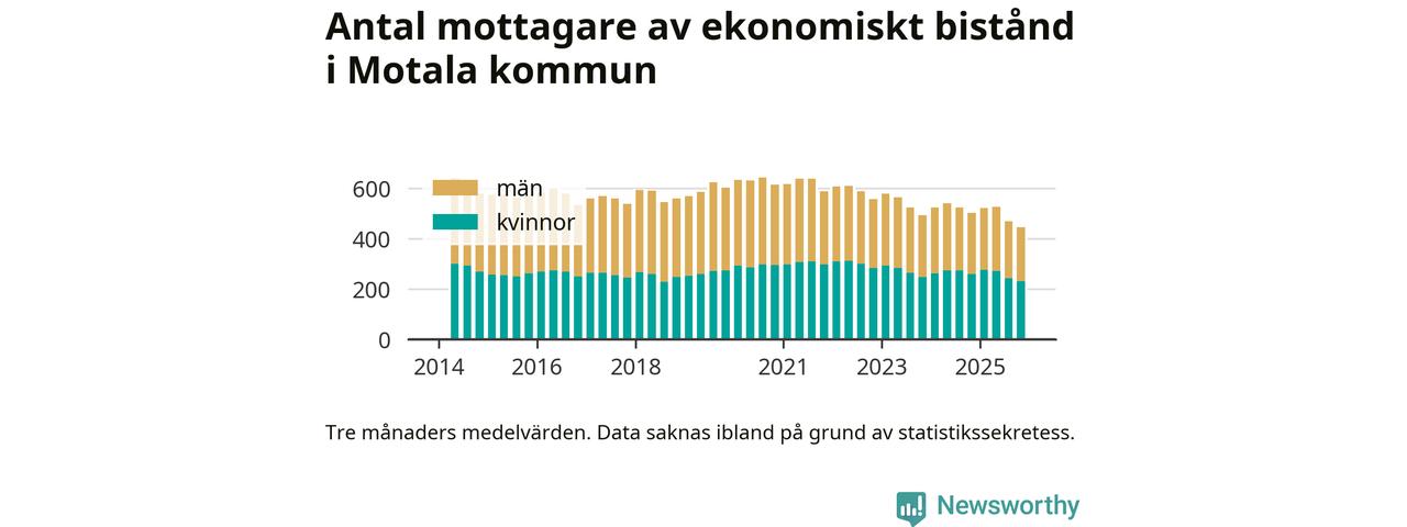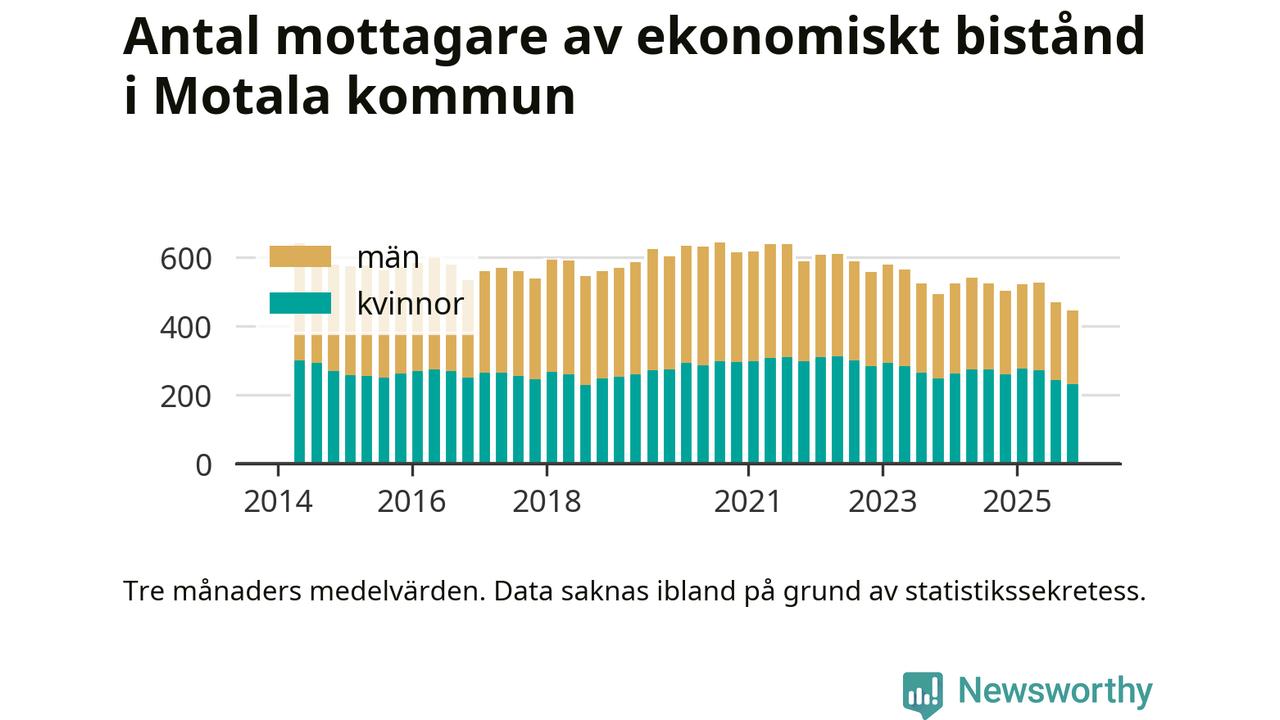 I genomsnitt 444 personer per månad fick ekonomiskt bistånd i Motala kommun