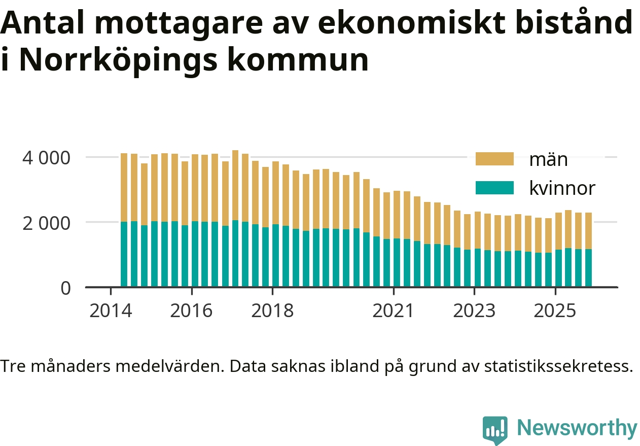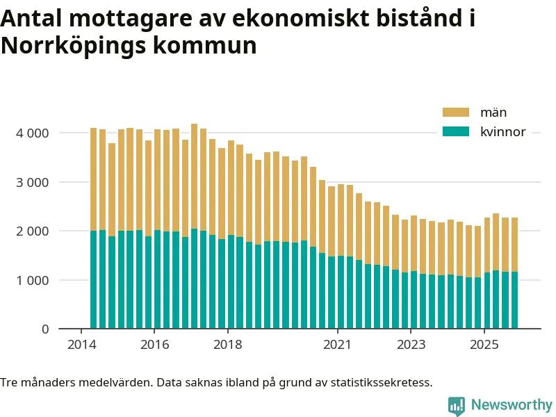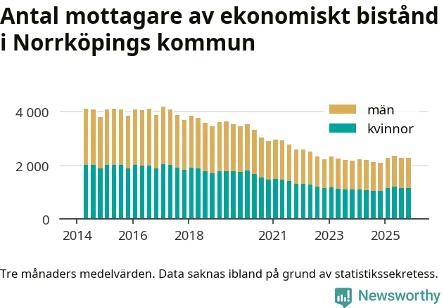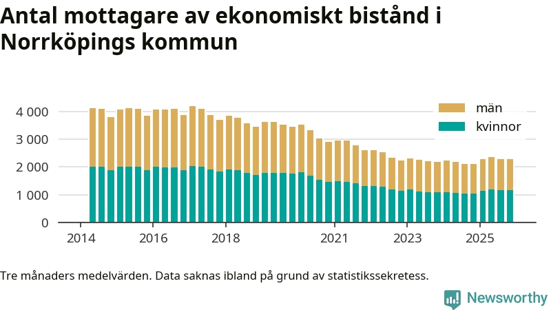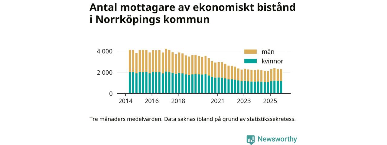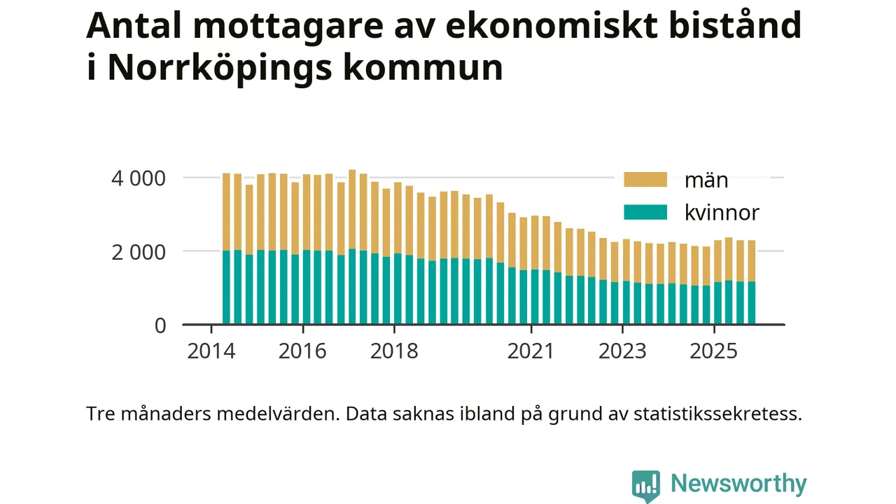 I genomsnitt 2 282 personer per månad fick ekonomiskt bistånd i Norrköpings kommun