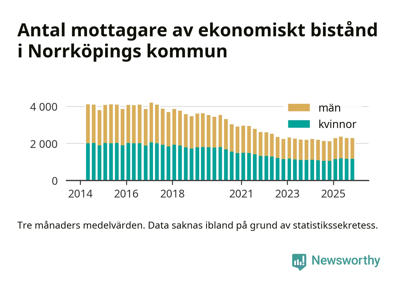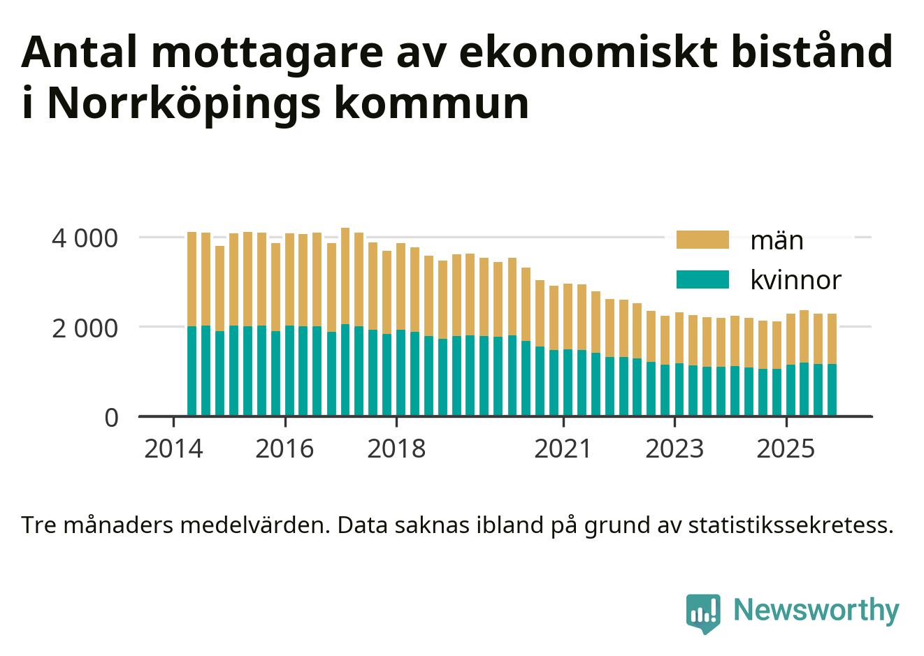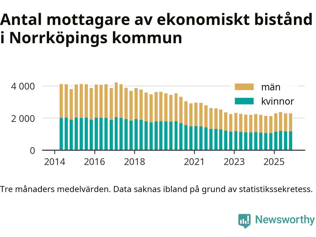 I genomsnitt 2 282 personer per månad fick ekonomiskt bistånd i Norrköpings kommun