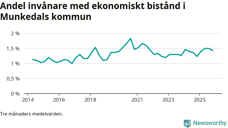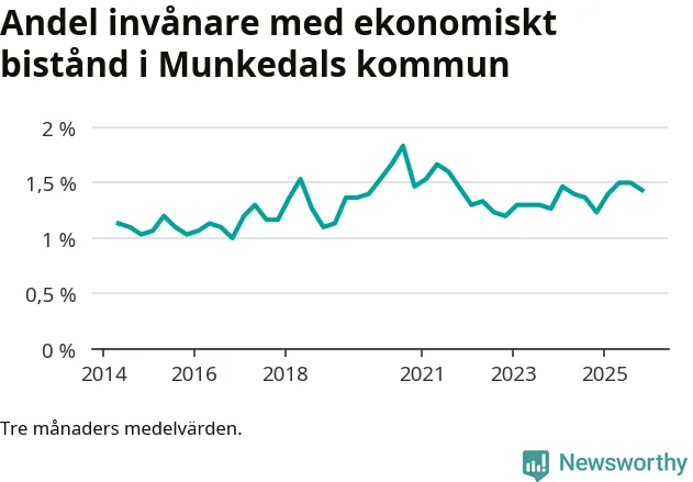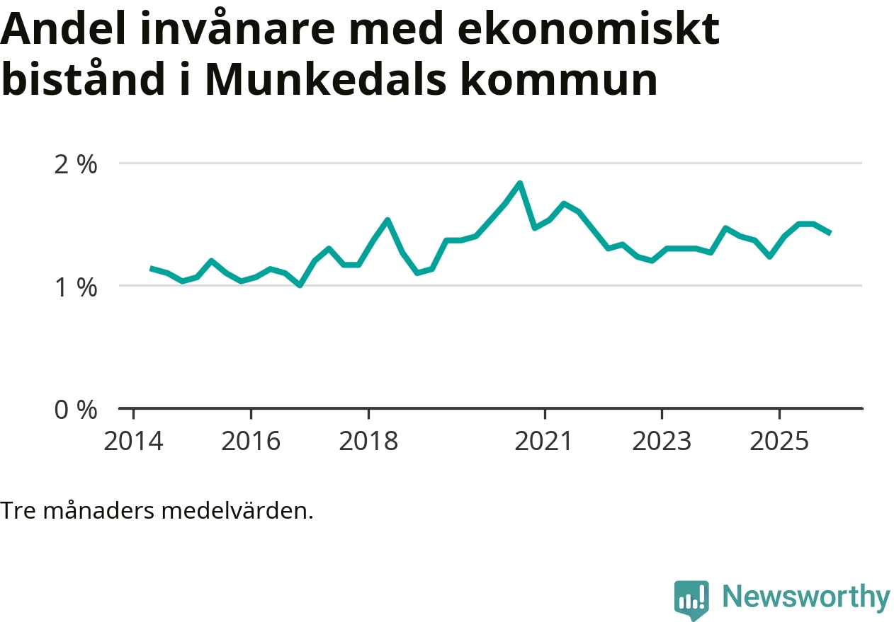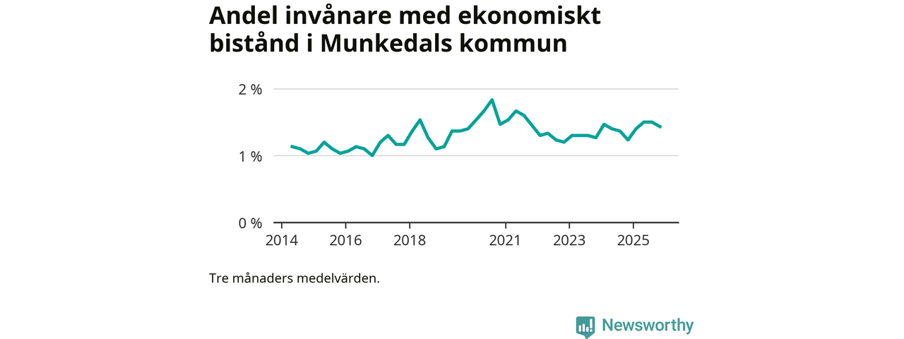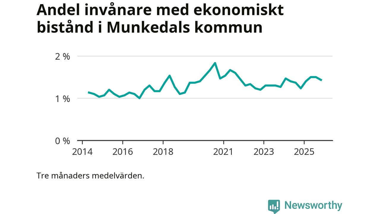 I genomsnitt 152 personer per månad fick ekonomiskt bistånd i Munkedals kommun under höstmånaderna (september till november), vilket motsvarar 1,4 procent av den vuxna befolkningen. Det är marginellt mindre än i somras, och något större andel än under hösten för ett år sedan.