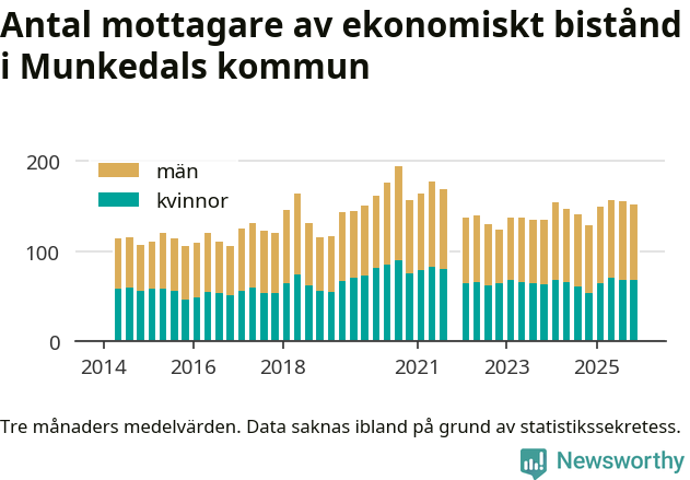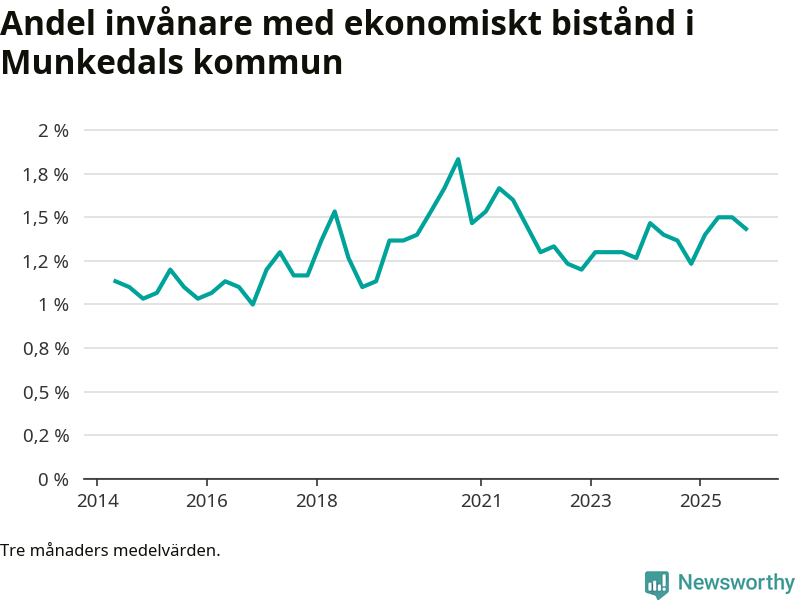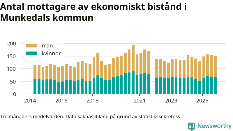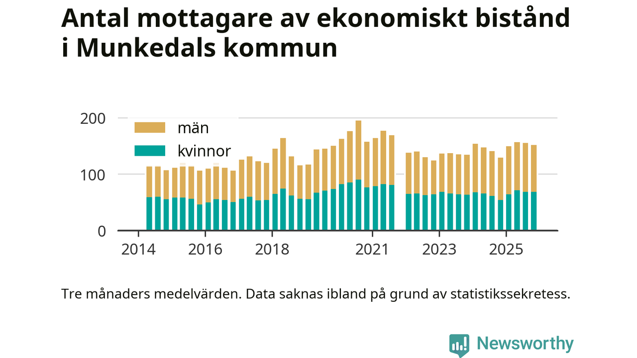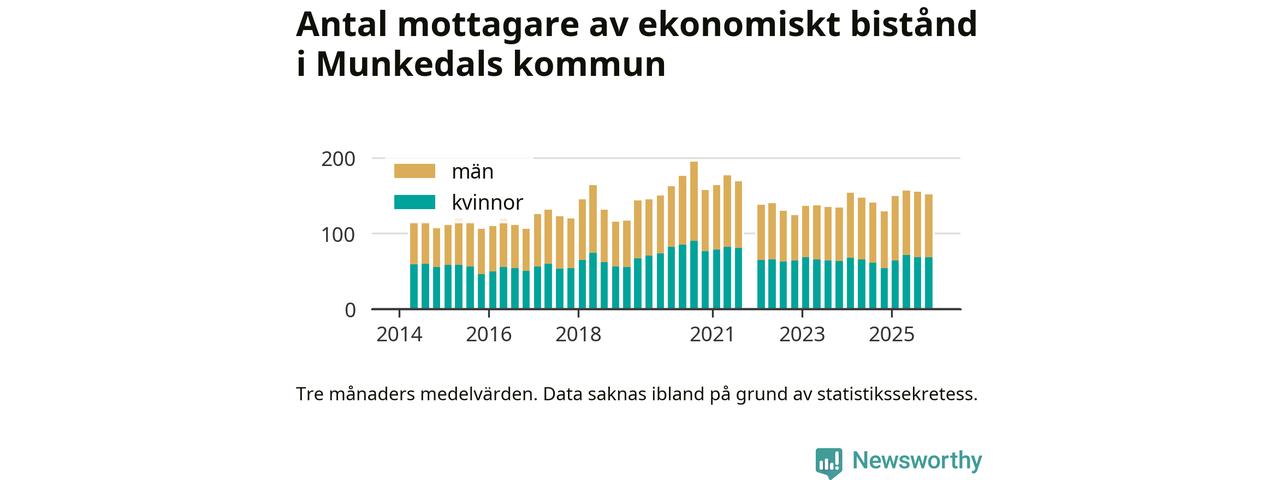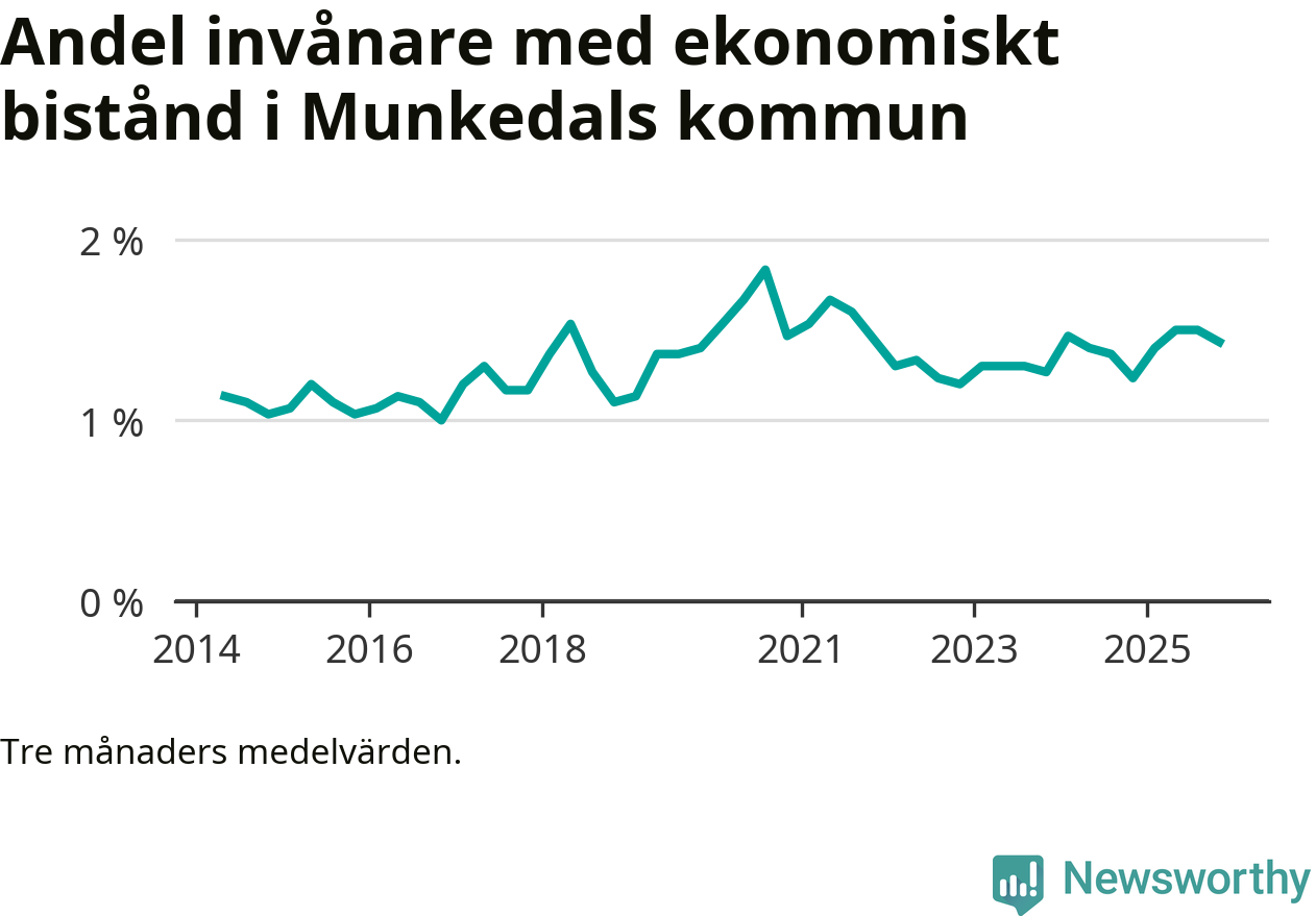 I genomsnitt 152 personer per månad fick ekonomiskt bistånd i Munkedals kommun under höstmånaderna (september till november), vilket motsvarar 1,4 procent av den vuxna befolkningen. Det är marginellt mindre än i somras, och något större andel än under hösten för ett år sedan.