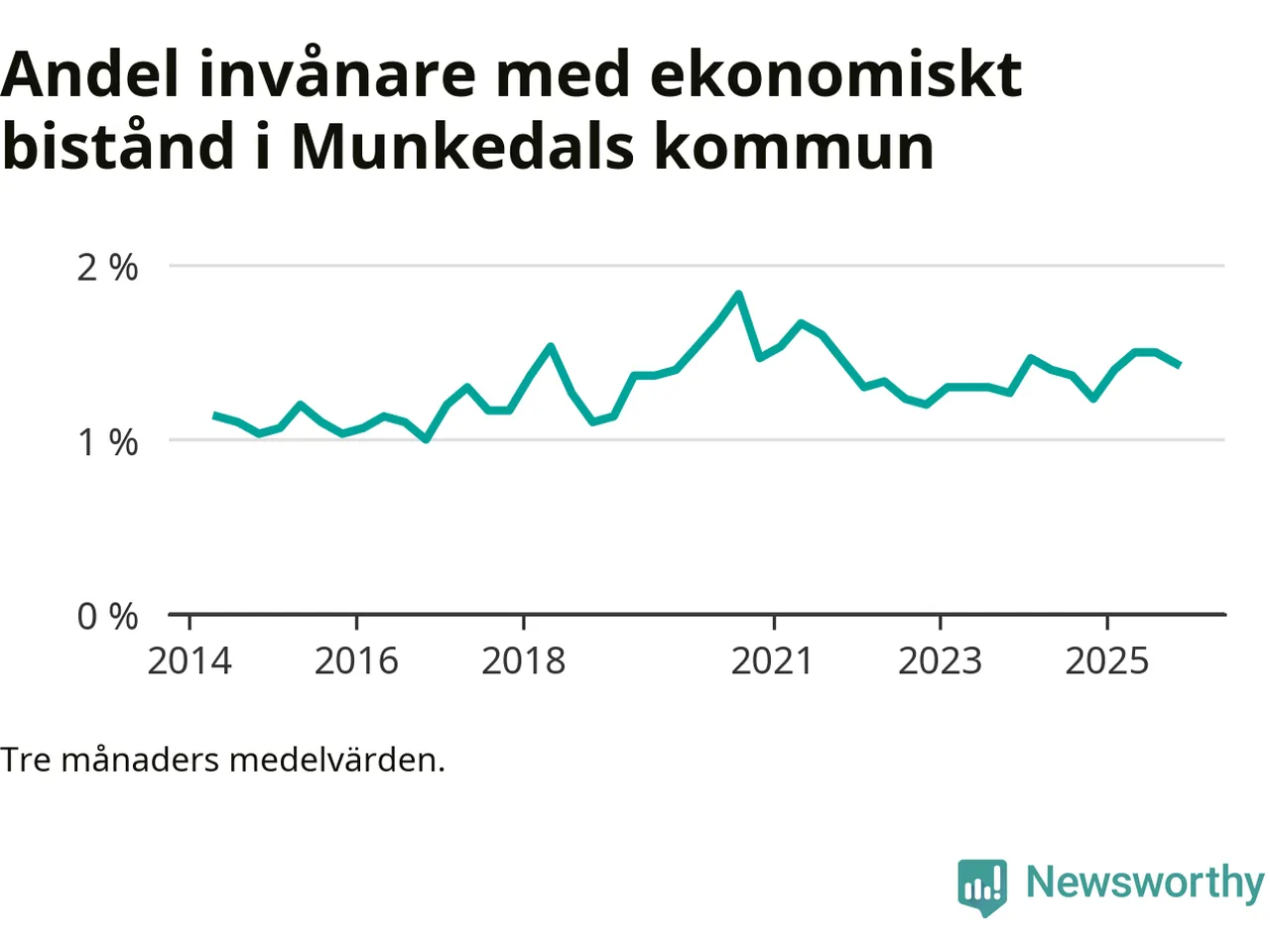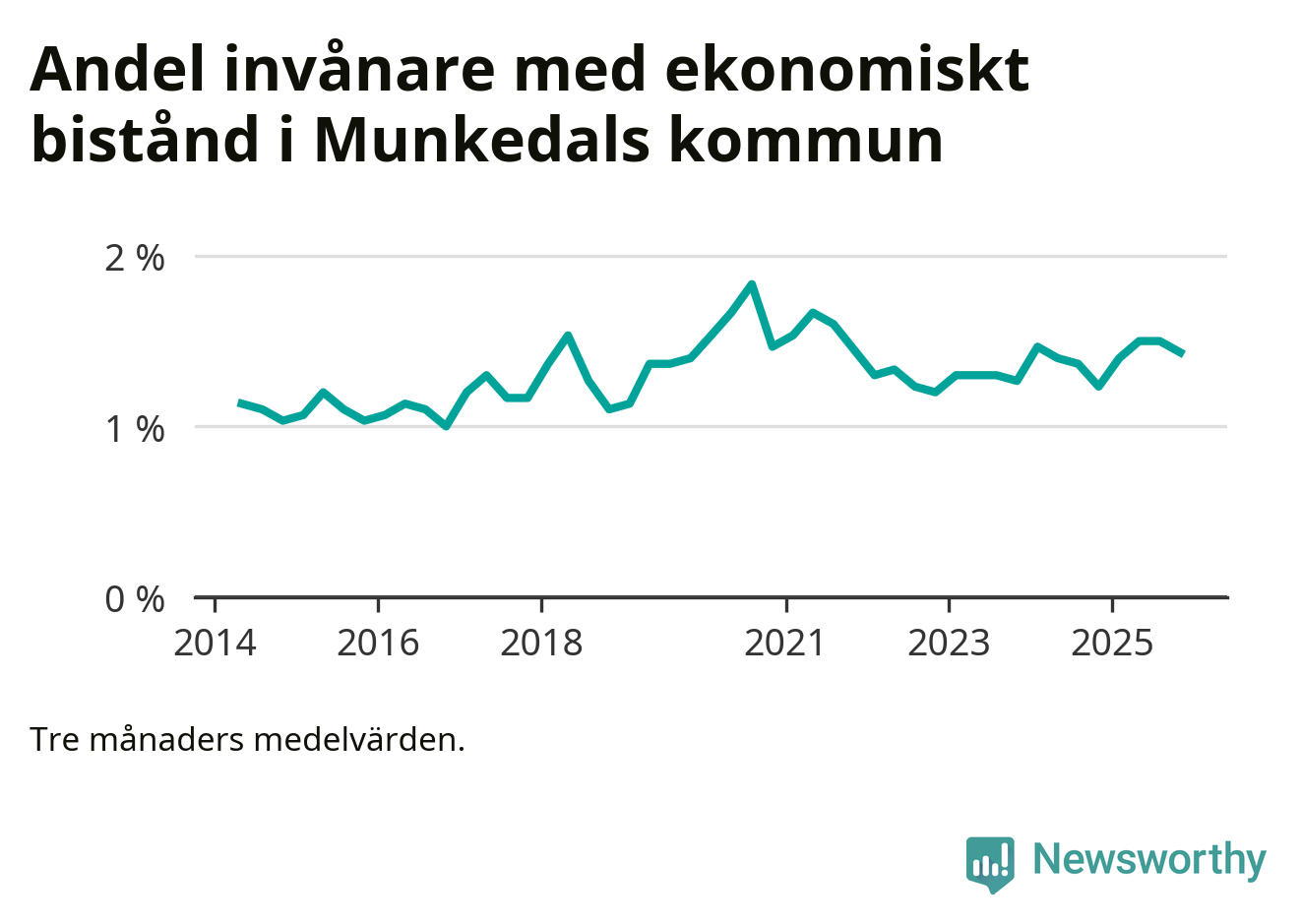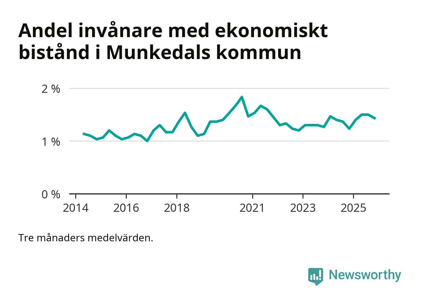 Den högsta andelen biståndstagare under det senaste decenniet hade kommunen under sommaren 2020 (1,8 procent), och den lägsta andelen under hösten 2016 (1 procent).