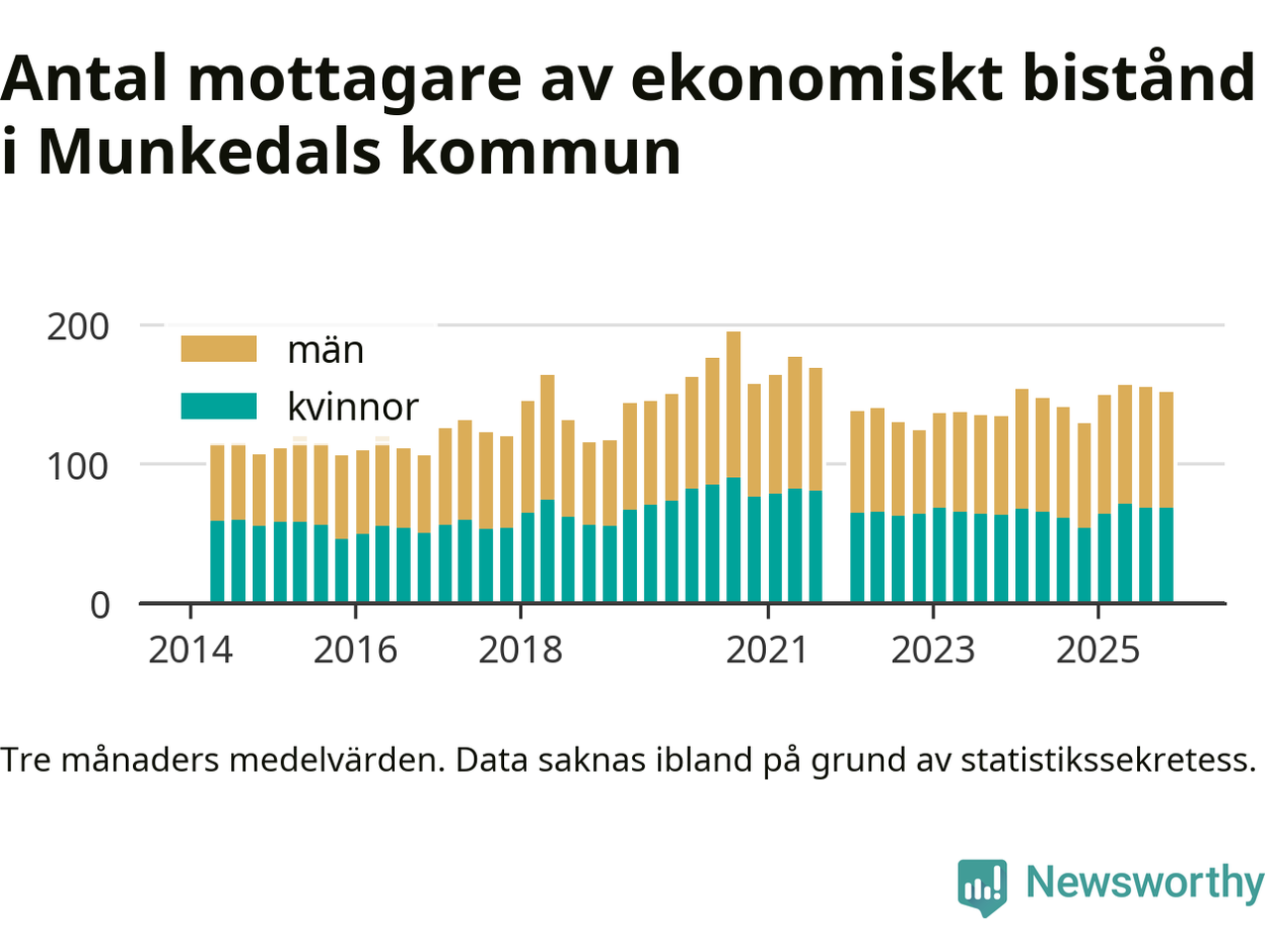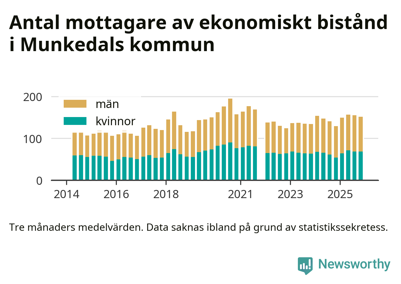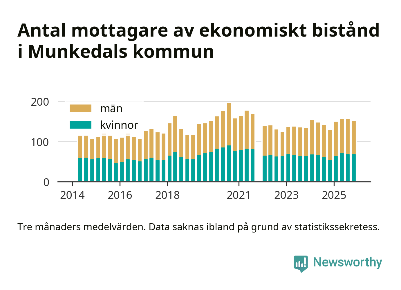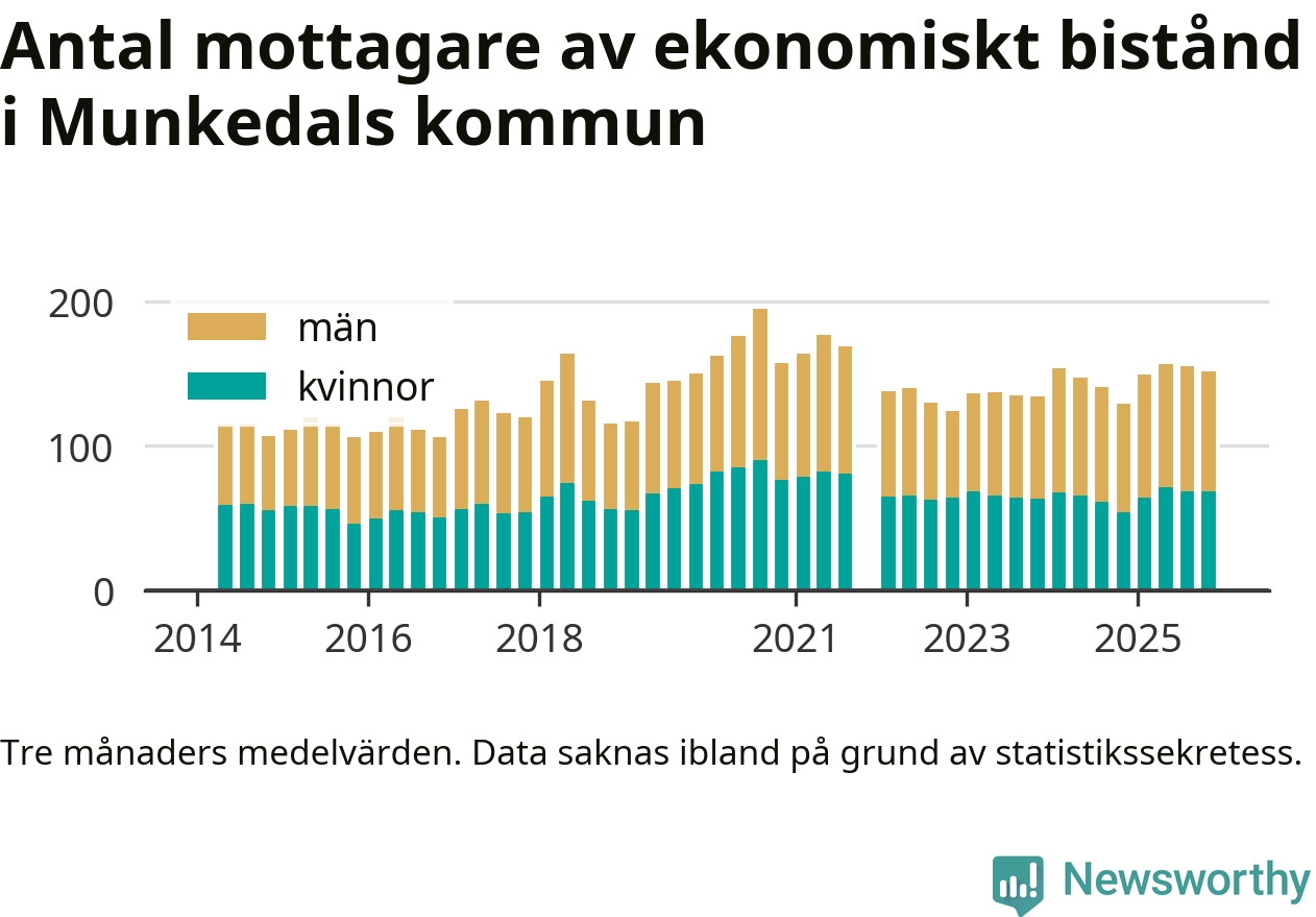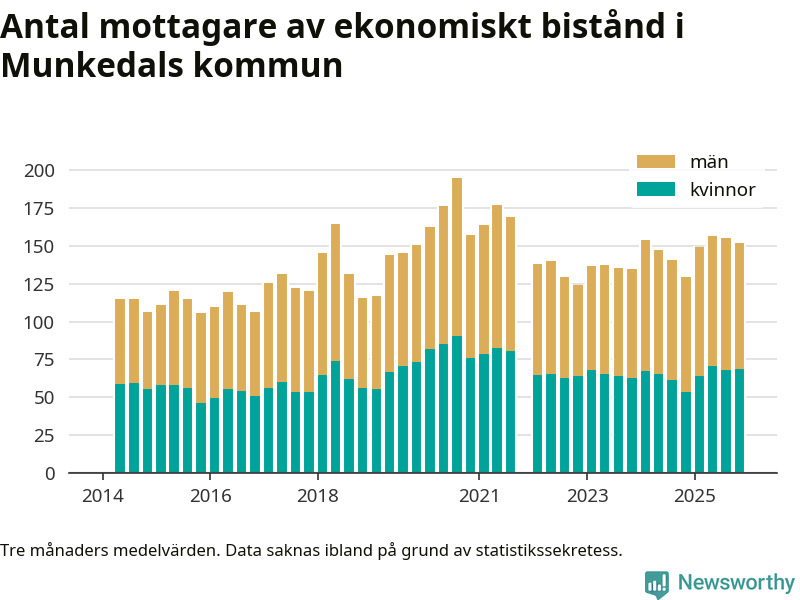 En majoritet av biståndstagarna var män: I genomsnitt 83 män och 69 kvinnor fick ekonomiskt bistånd varje månad under hösten.