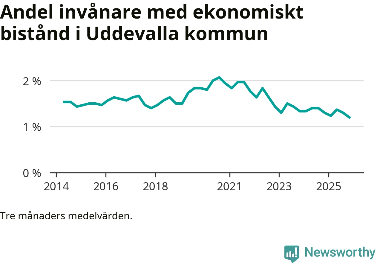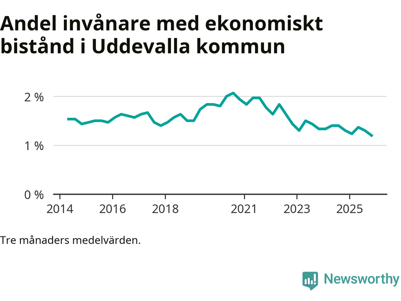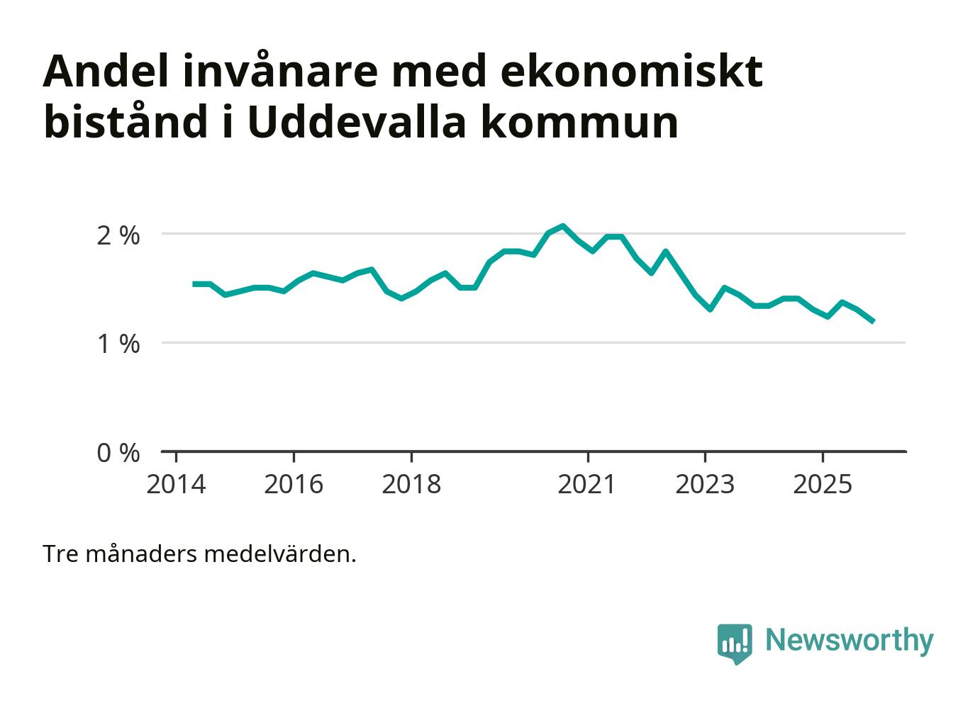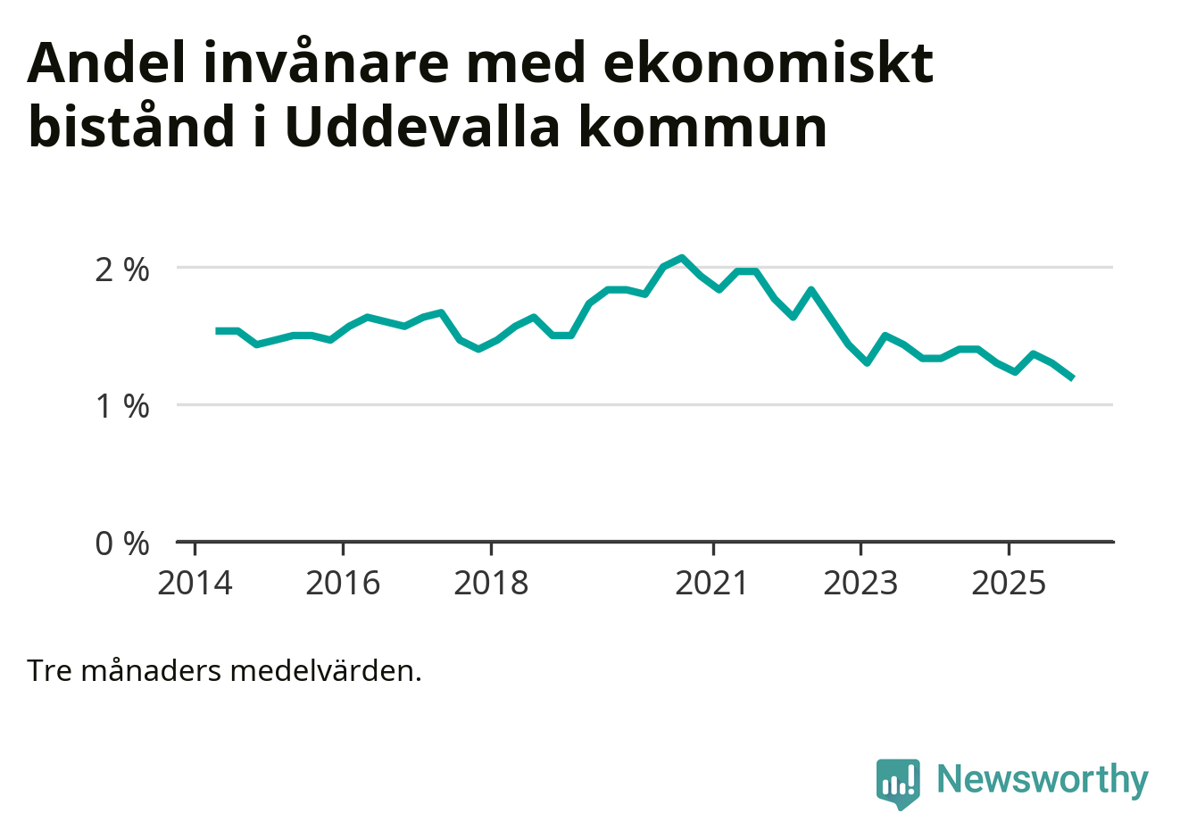 I genomsnitt 690 personer per månad fick ekonomiskt bistånd i Uddevalla kommun under höstmånaderna (september till november), vilket motsvarar 1,2 procent av den vuxna befolkningen. Det är marginellt mindre än i somras, och något mindre andel än under hösten för ett år sedan.