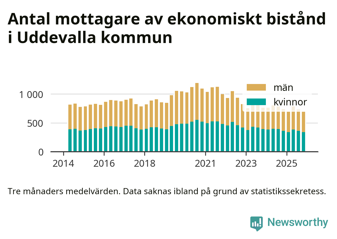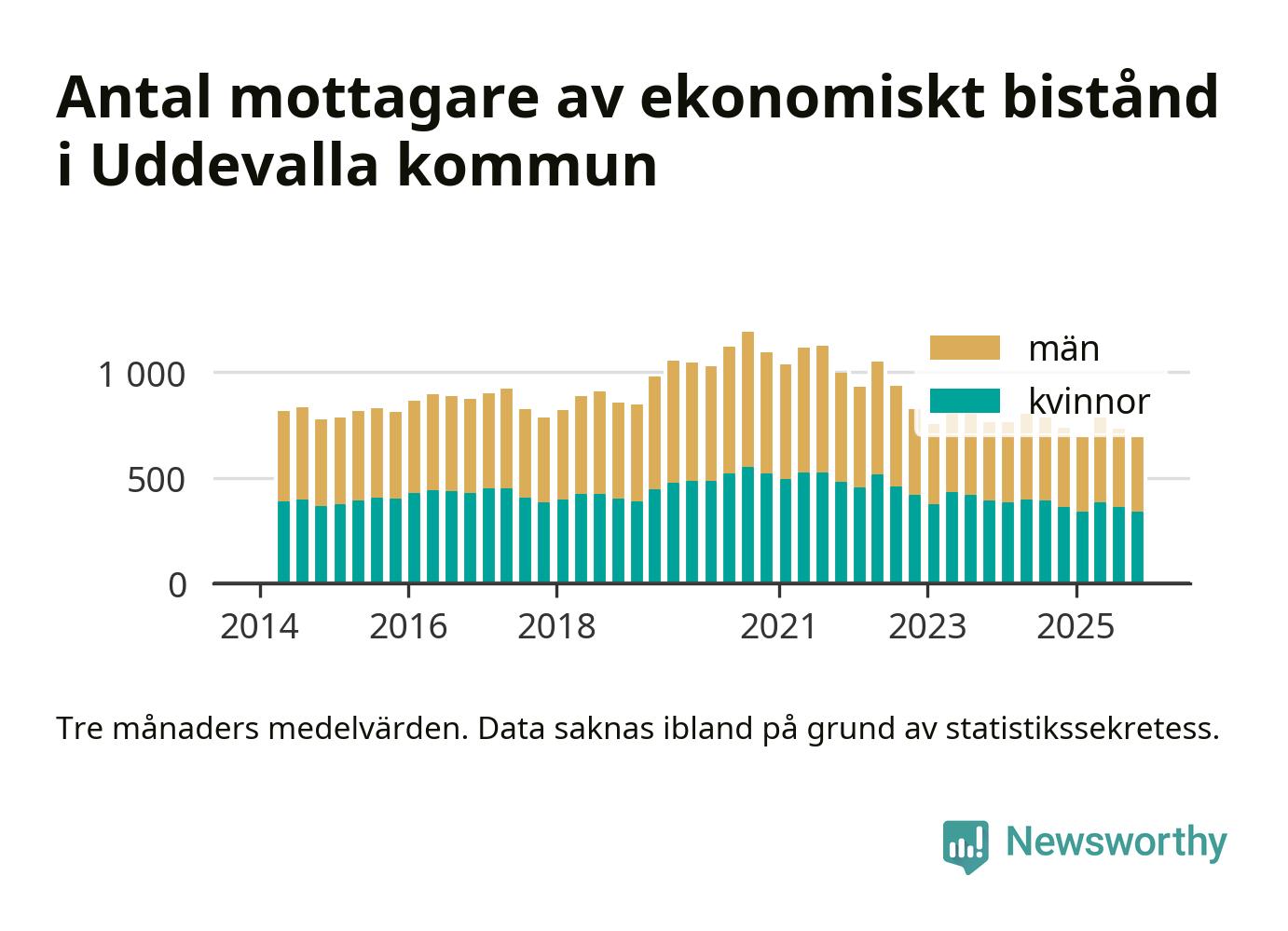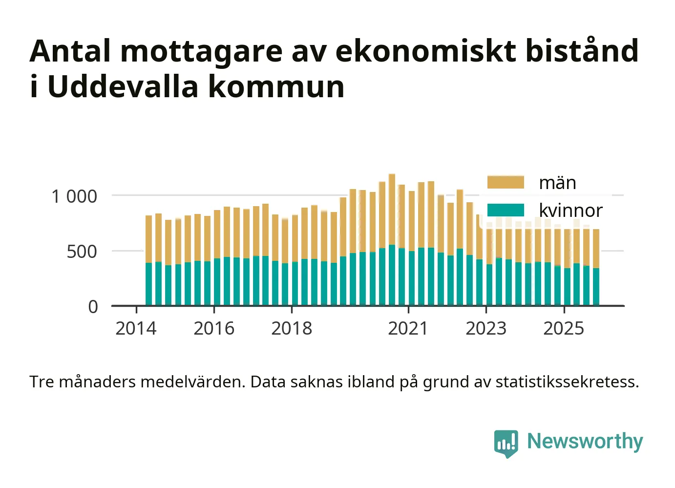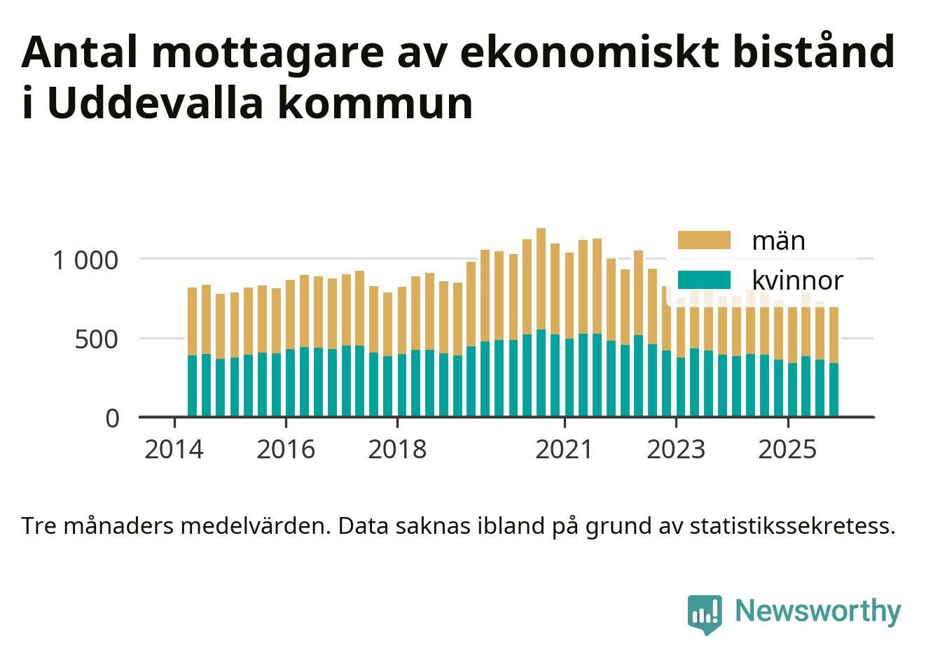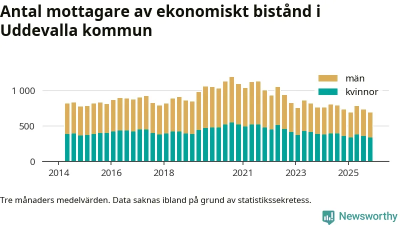 I genomsnitt 690 personer per månad fick ekonomiskt bistånd i Uddevalla kommun under höstmånaderna (september till november), vilket motsvarar 1,2 procent av den vuxna befolkningen. Det är marginellt mindre än i somras, och något mindre andel än under hösten för ett år sedan.