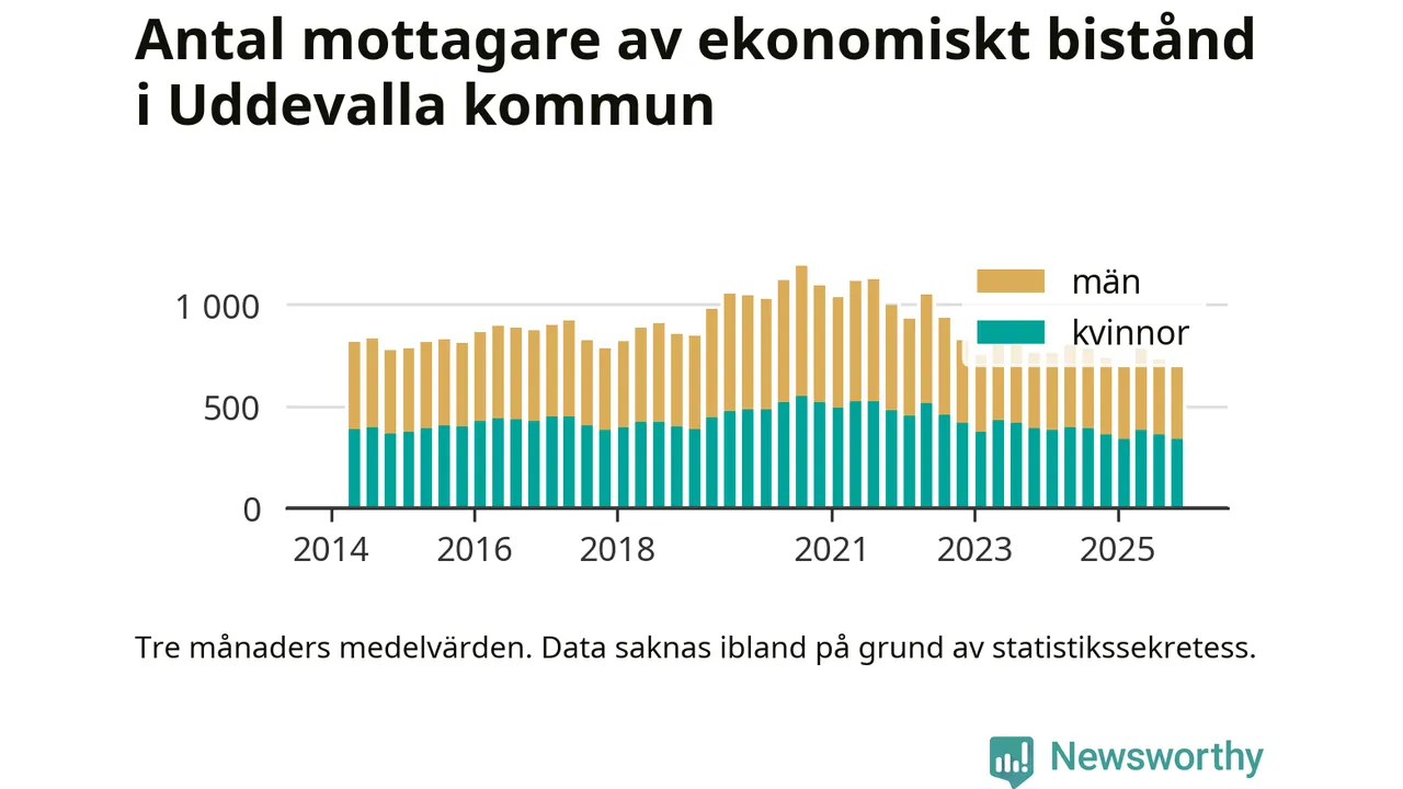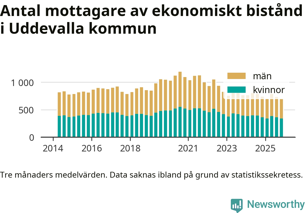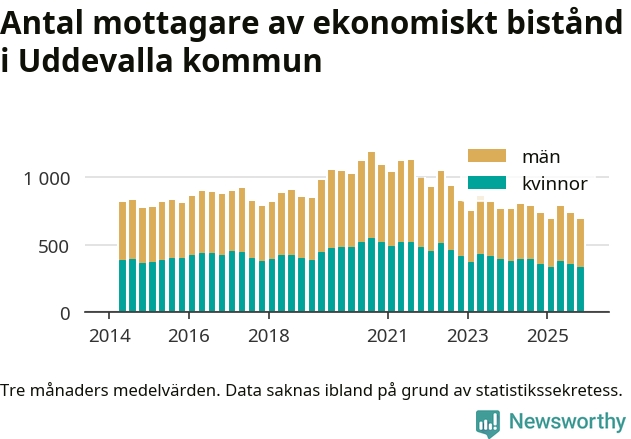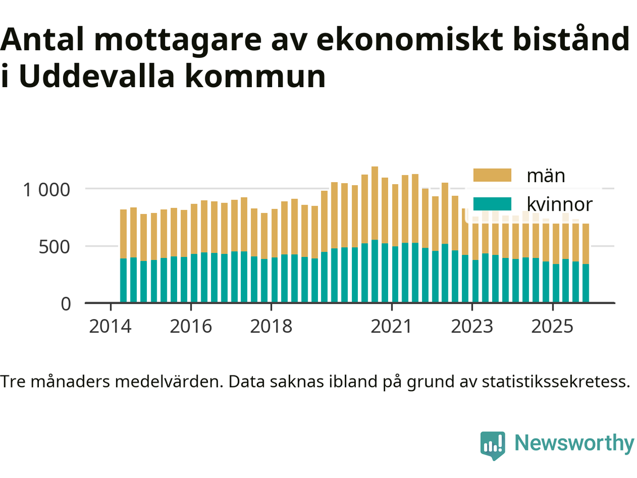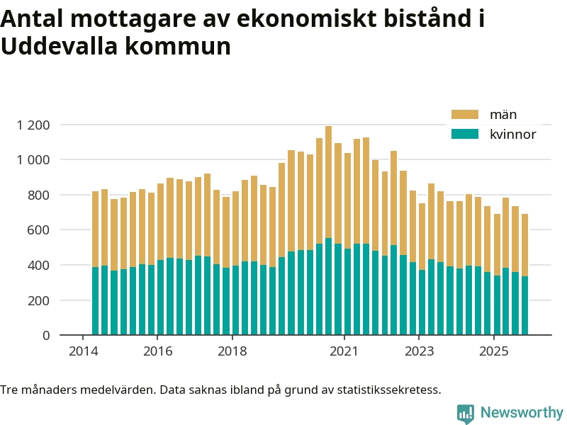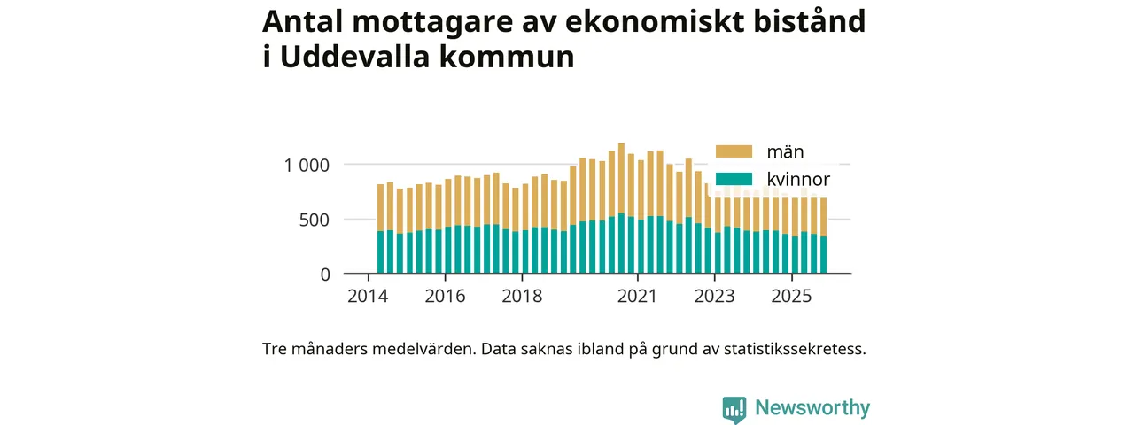 I genomsnitt 690 personer per månad fick ekonomiskt bistånd i Uddevalla kommun under höstmånaderna (september till november), vilket motsvarar 1,2 procent av den vuxna befolkningen. Det är marginellt mindre än i somras, och något mindre andel än under hösten för ett år sedan.