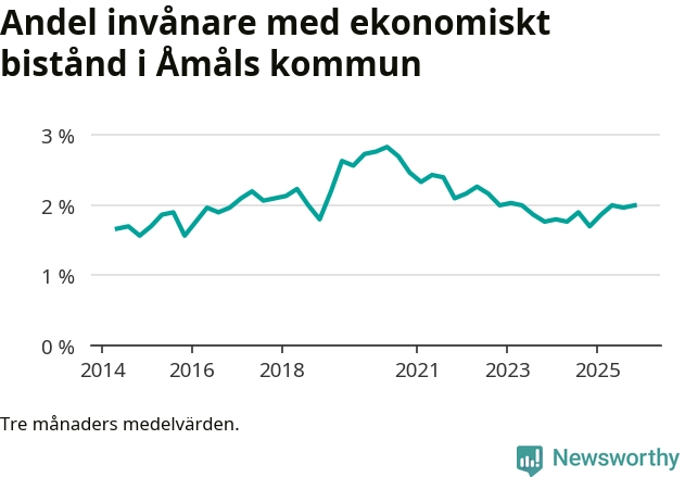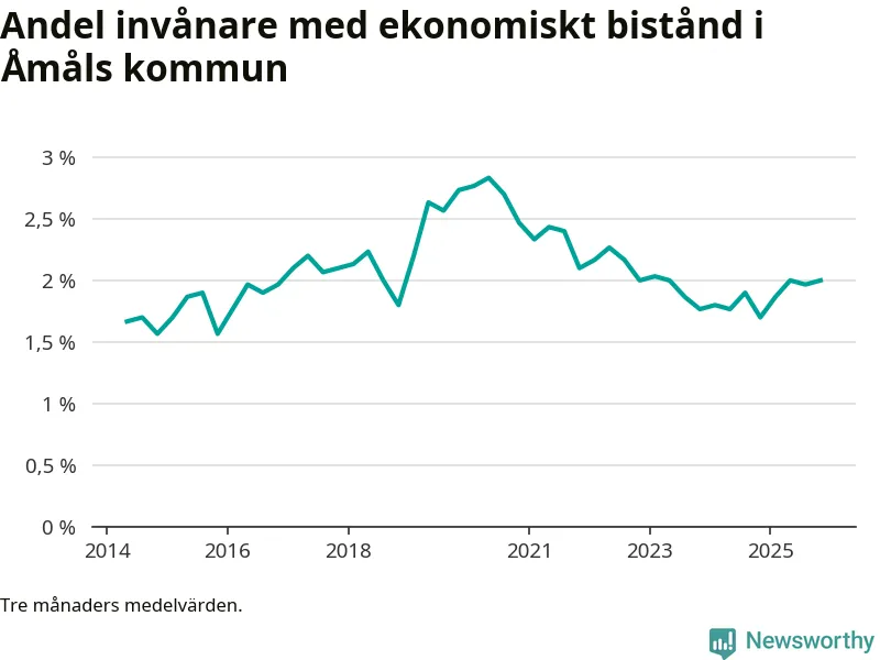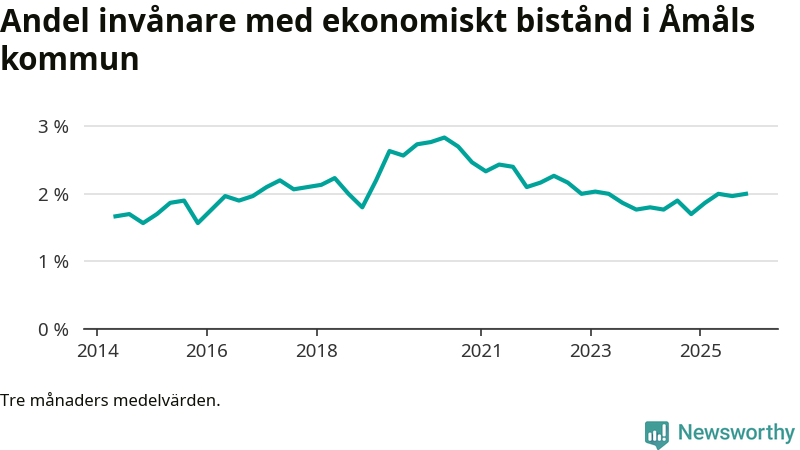 Den högsta andelen biståndstagare under det senaste decenniet hade kommunen under våren 2020 (2,8 procent), och den lägsta andelen under hösten 2014 (1,6 procent).