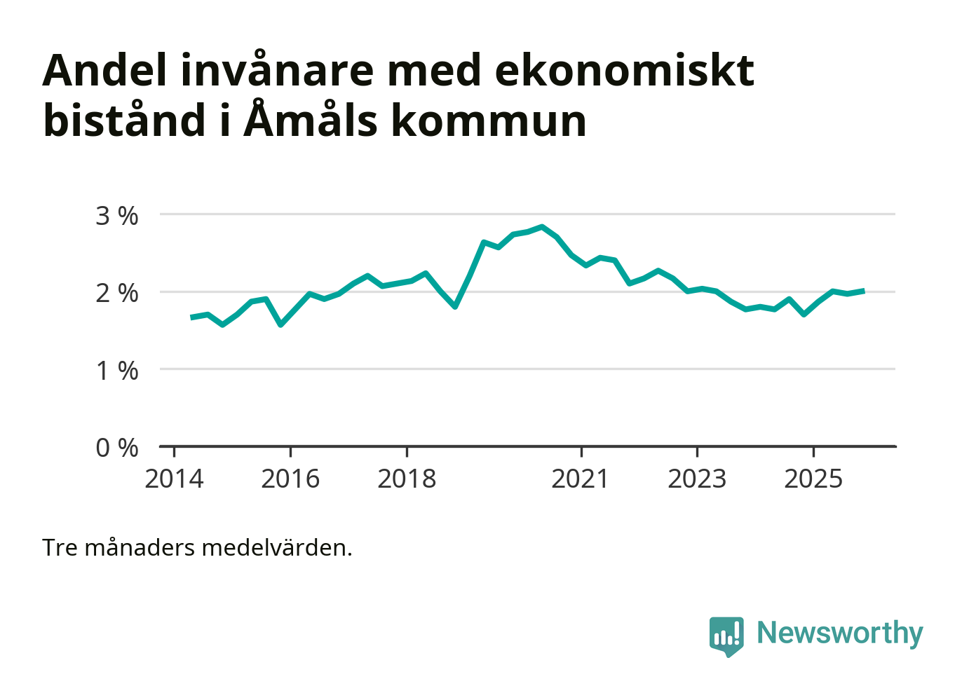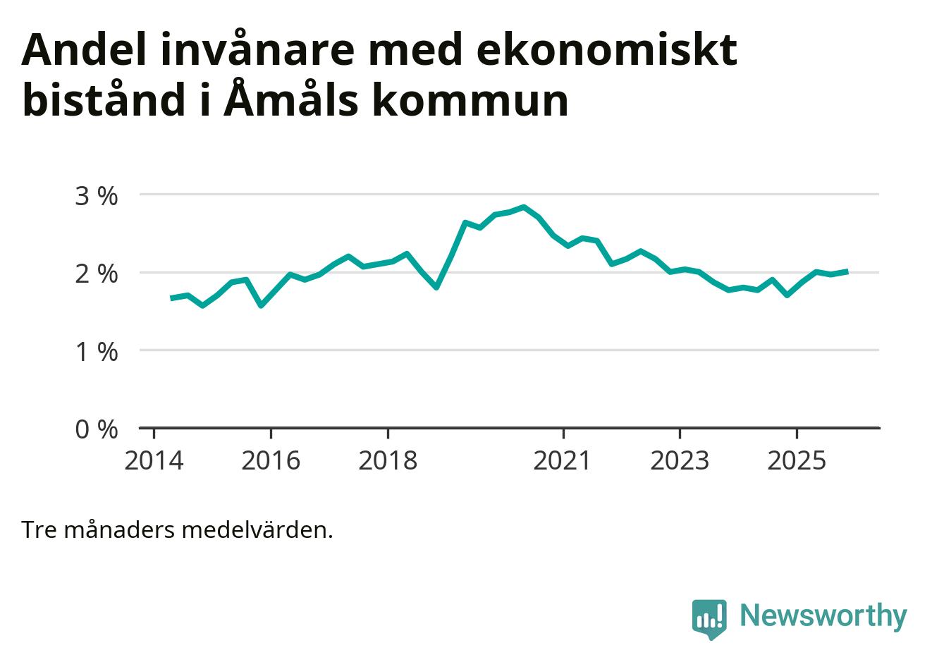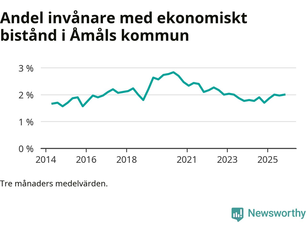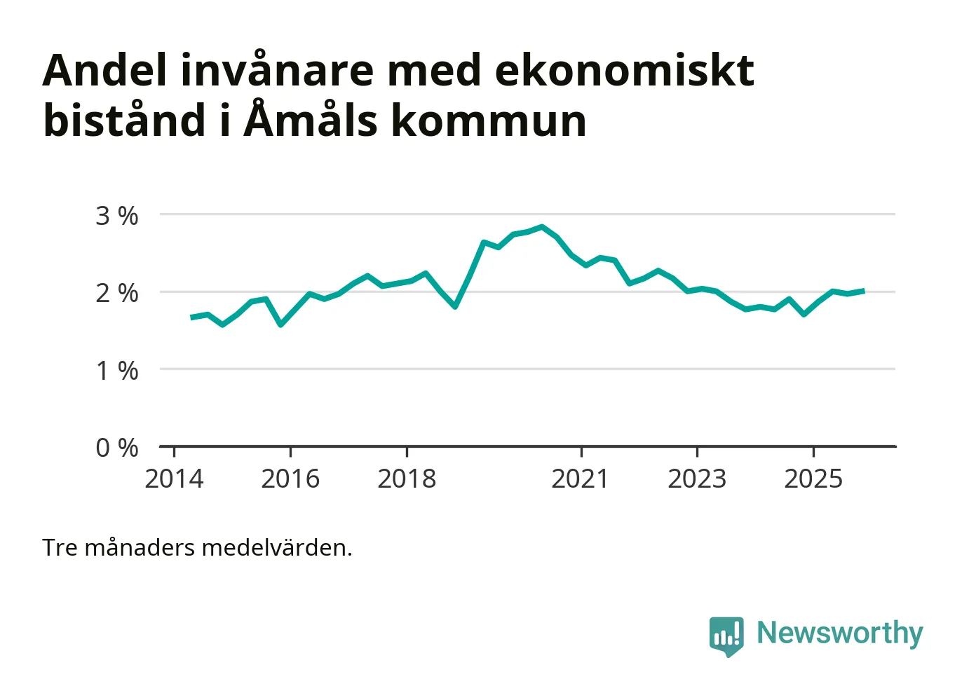I genomsnitt 238 personer per månad fick ekonomiskt bistånd i Åmåls kommun under höstmånaderna (september till november), vilket motsvarar 2,0 procent av den vuxna befolkningen. Det är marginellt mer än i somras, och något större andel än under hösten för ett år sedan.