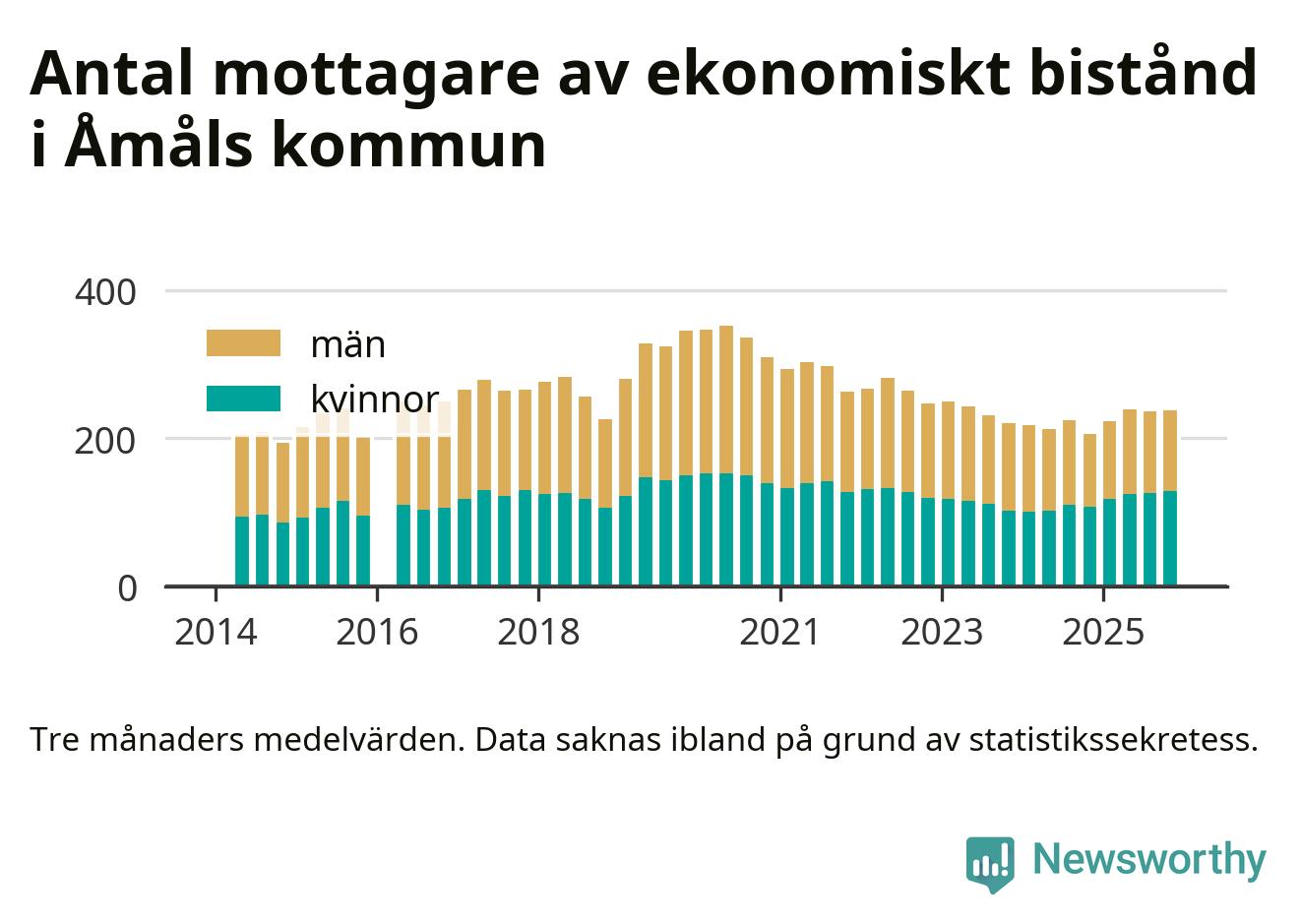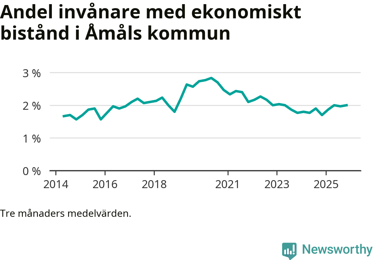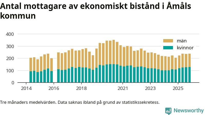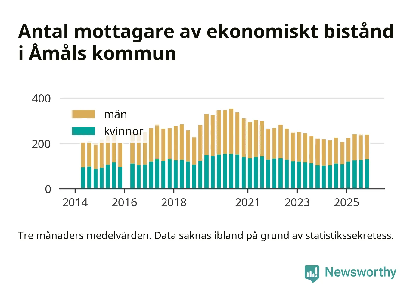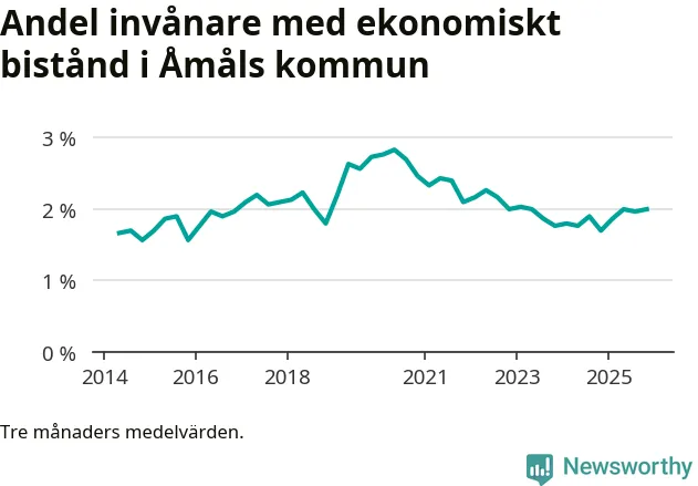 I genomsnitt 238 personer per månad fick ekonomiskt bistånd i Åmåls kommun under höstmånaderna (september till november), vilket motsvarar 2,0 procent av den vuxna befolkningen. Det är marginellt mer än i somras, och något större andel än under hösten för ett år sedan.
