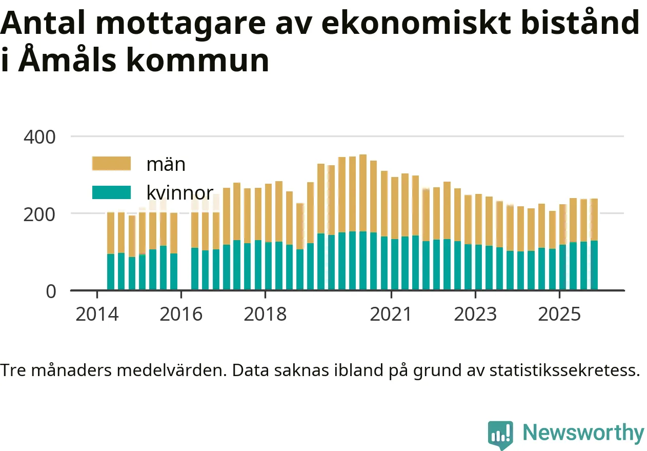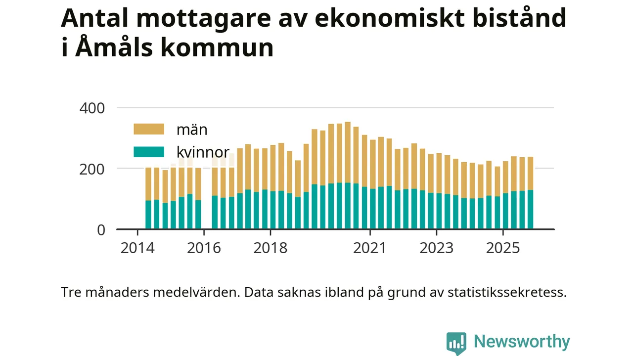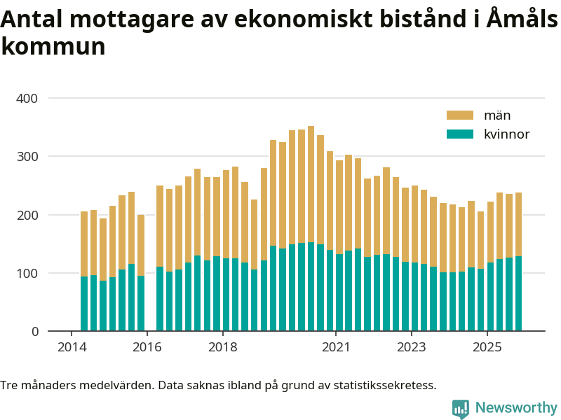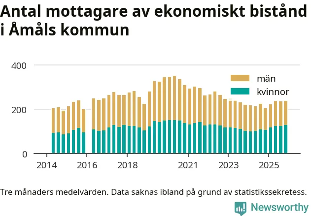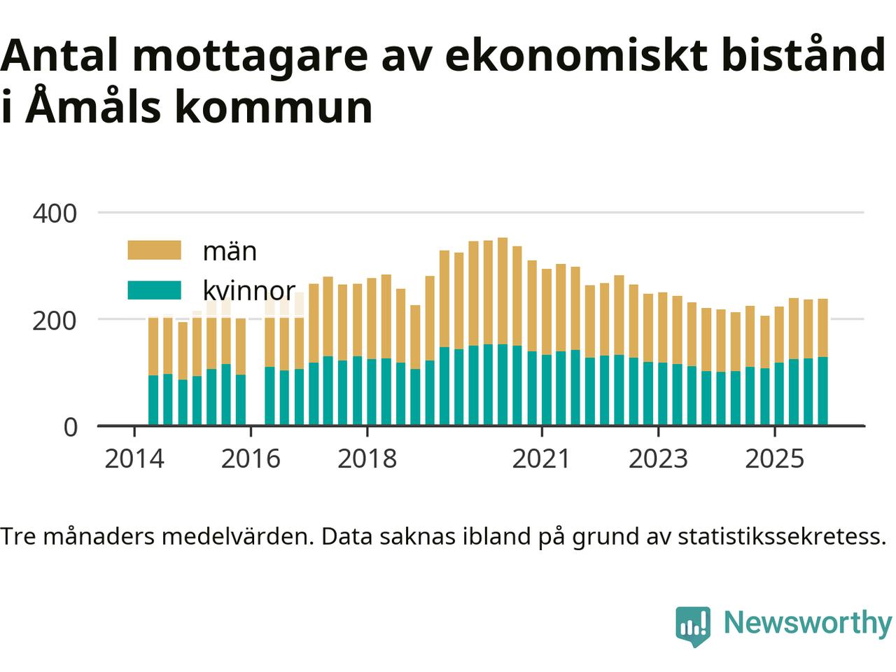 I genomsnitt 238 personer per månad fick ekonomiskt bistånd i Åmåls kommun under höstmånaderna (september till november), vilket motsvarar 2,0 procent av den vuxna befolkningen. Det är marginellt mer än i somras, och något större andel än under hösten för ett år sedan.