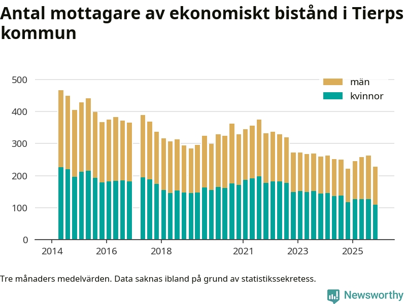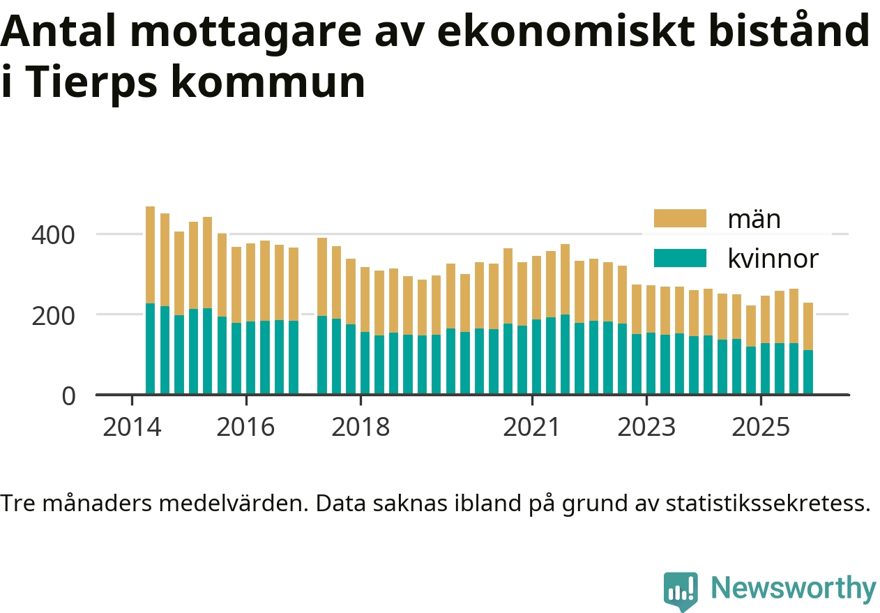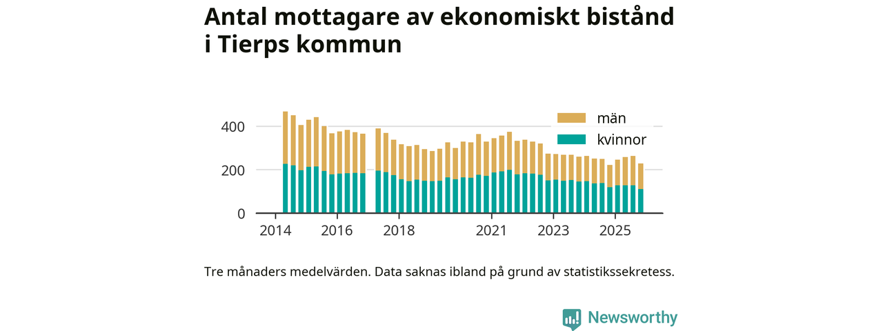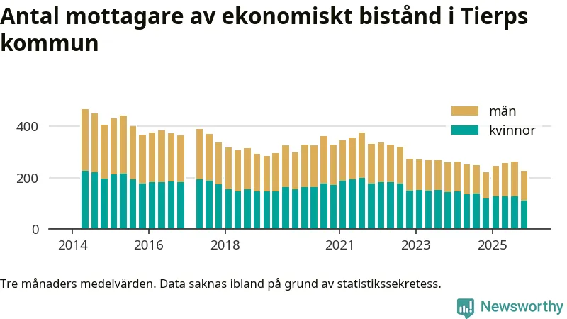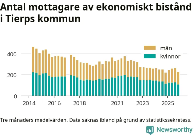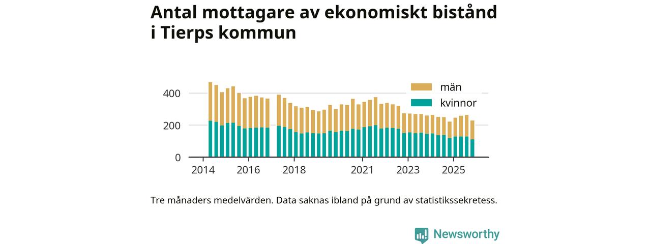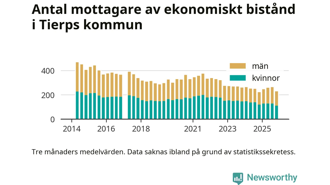 I genomsnitt 227 personer per månad fick ekonomiskt bistånd i Tierps kommun