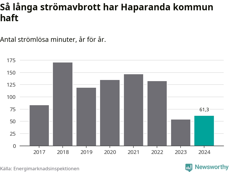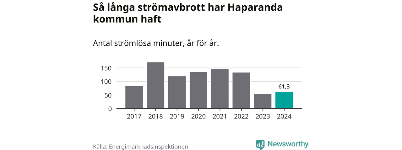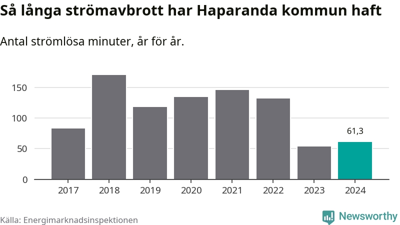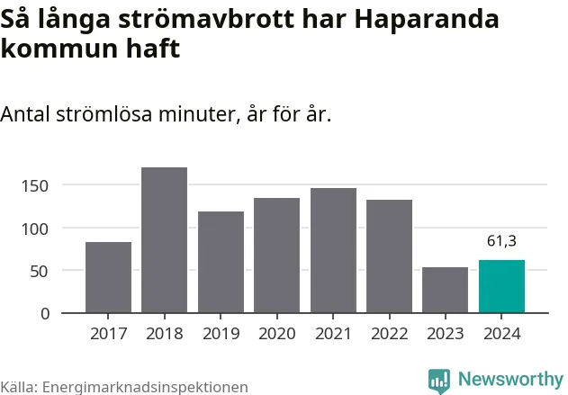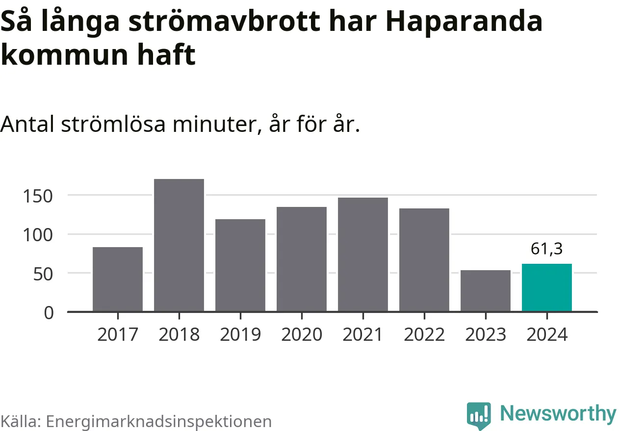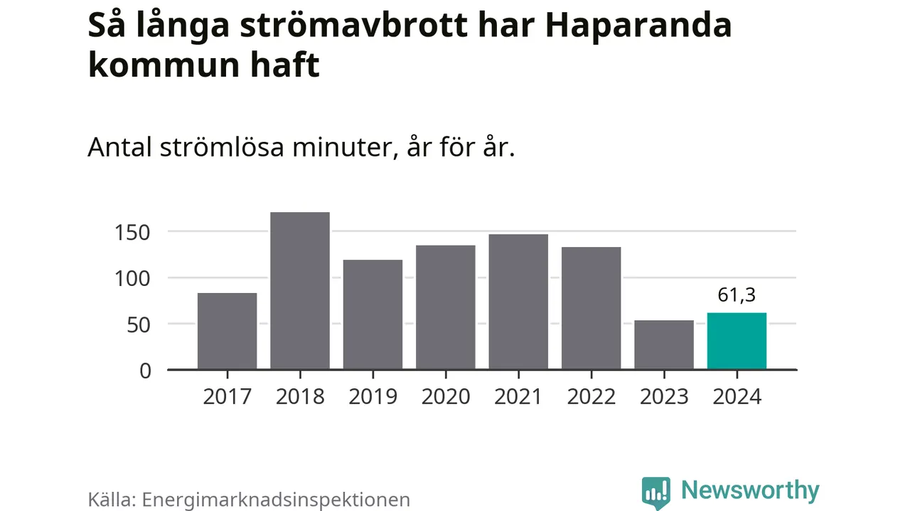 Antalet strömavbrott och total strömlös tid varierar något från år till år i Haparanda kommun. Mest tid utan ström (i alla fall under perioden 2017–2024) fick Haparandaborna genomleva under 2018 – två timmar och 50 minuter. Det är 45 minuter längre än under ett normalår.