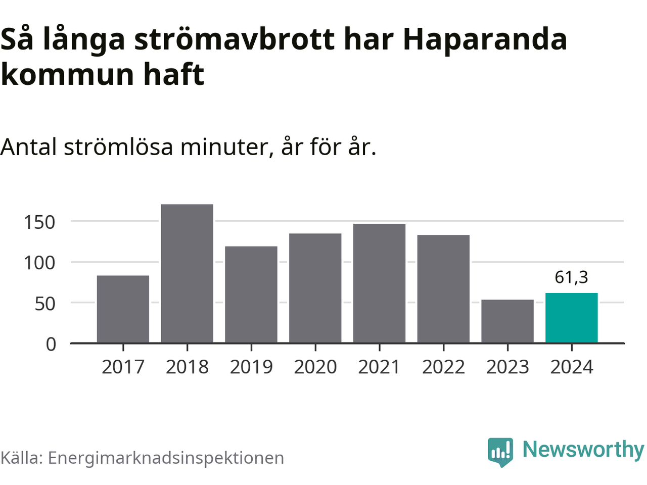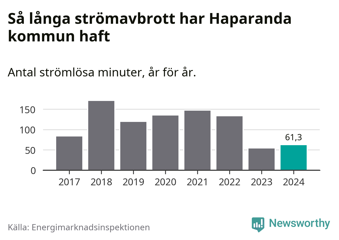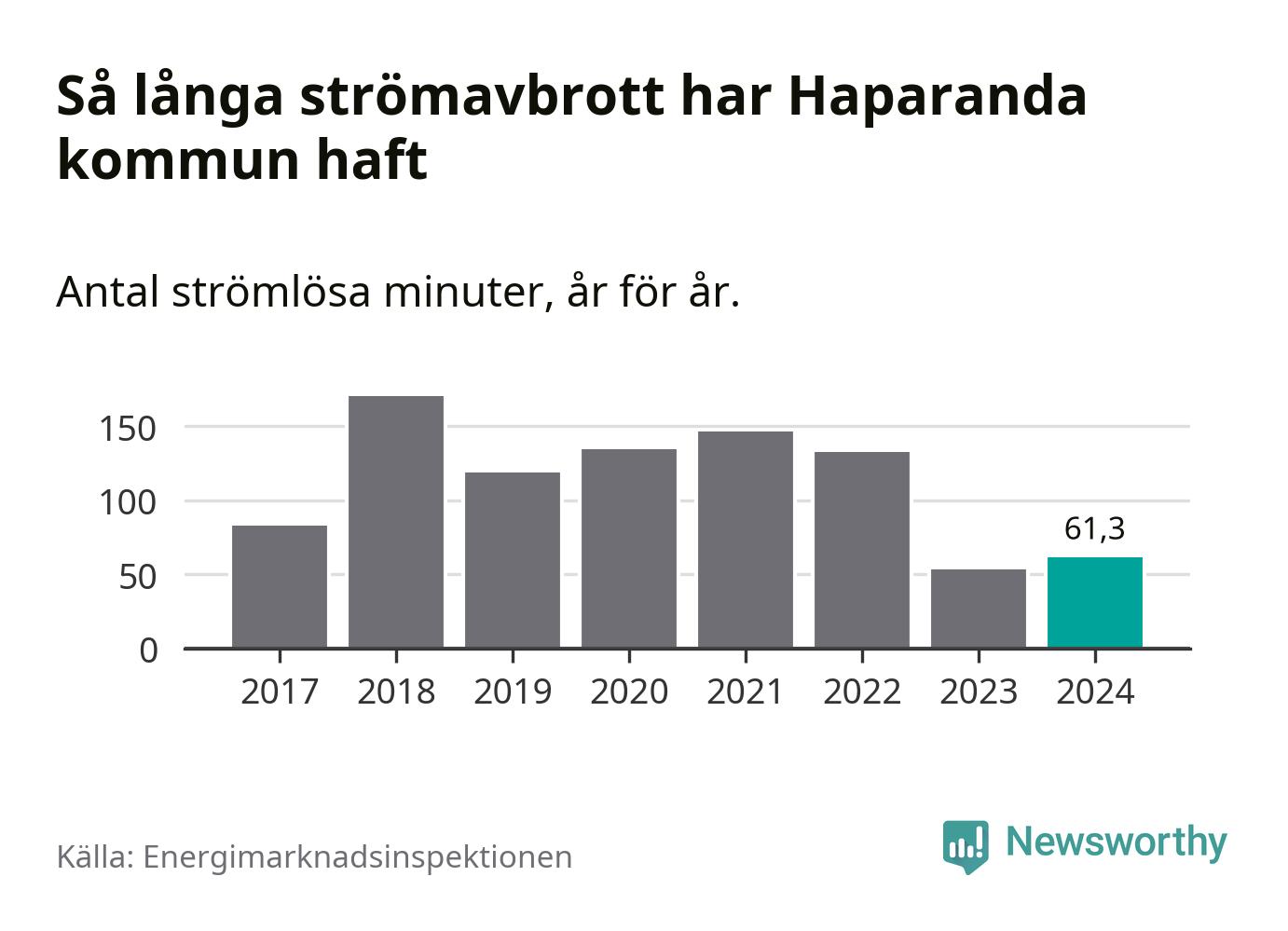 Antalet strömavbrott och total strömlös tid varierar något från år till år i Haparanda kommun. Mest tid utan ström (i alla fall under perioden 2017–2024) fick Haparandaborna genomleva under 2018 – två timmar och 50 minuter. Det är 45 minuter längre än under ett normalår.